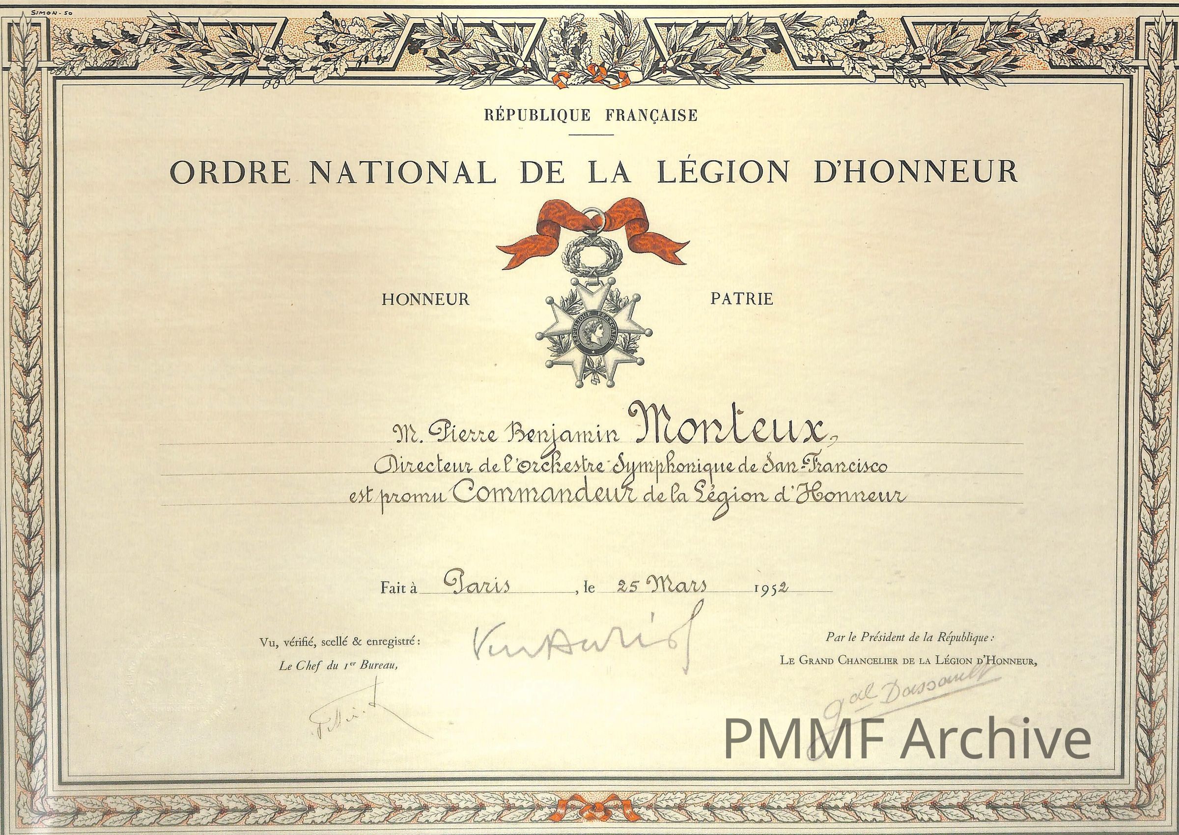 Framed certificate for French Legion of Honor dated 25 March 1952, Paris