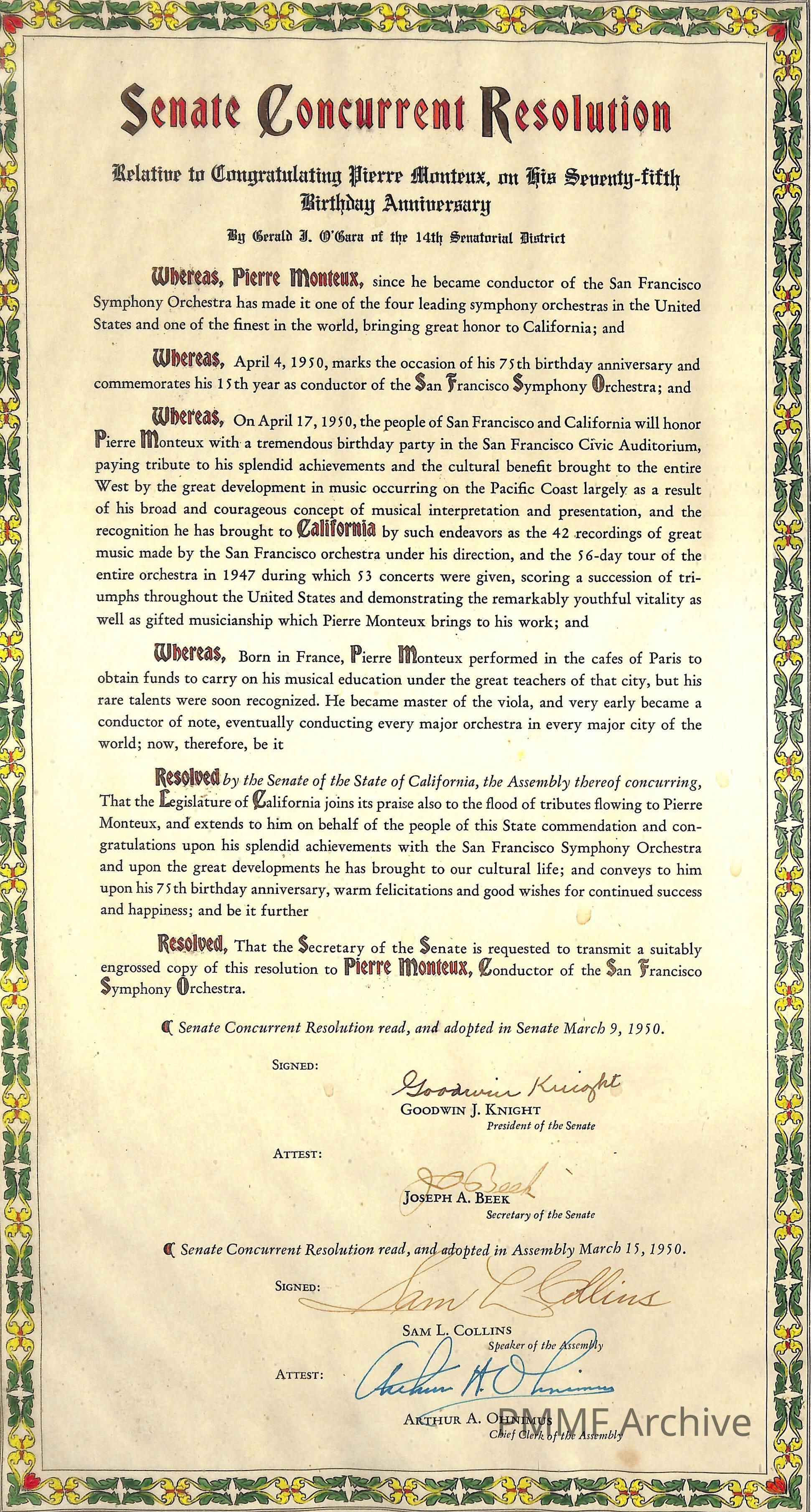 Framed certificate for California State Resolution honoring Monteux on his 75th birthday anniversaryCollection