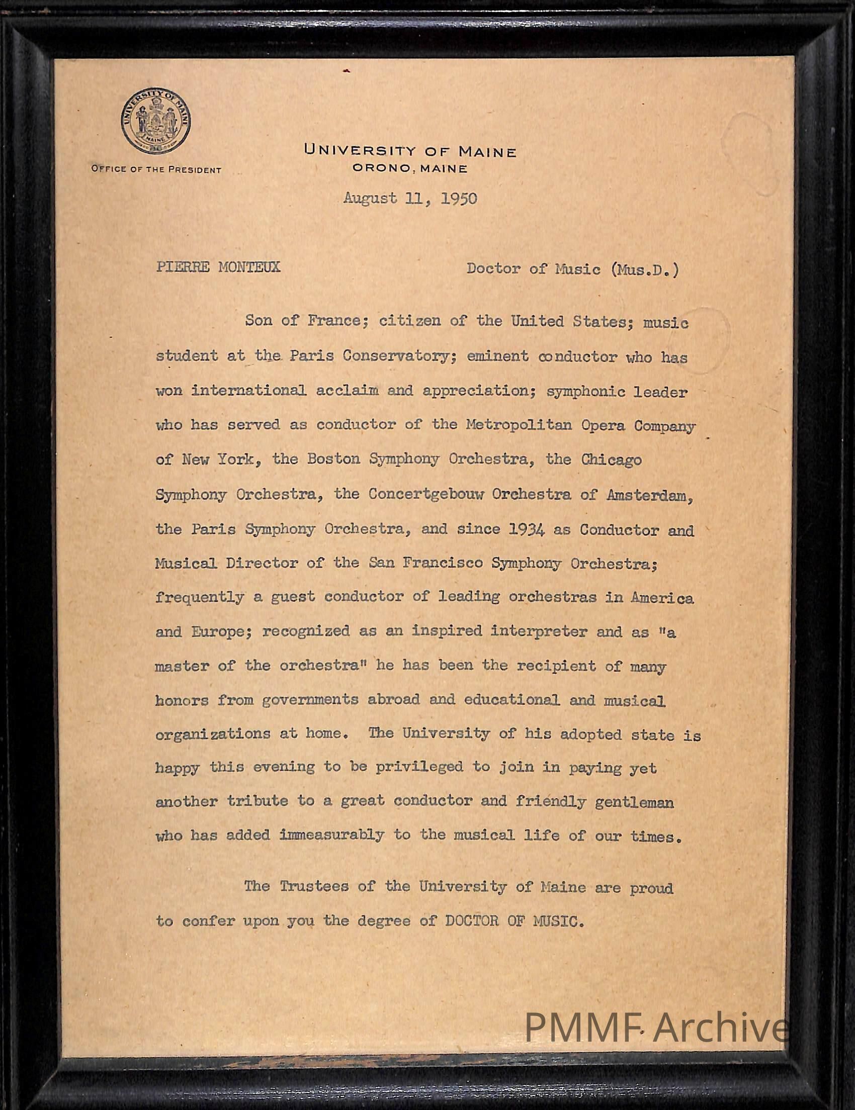 Framed text of award of Doctor of Music degree to Pierre Monteux printed on letterhead, dated August 11, 1950, from the Office of the President of the Univesity of Maine, OronoCollection