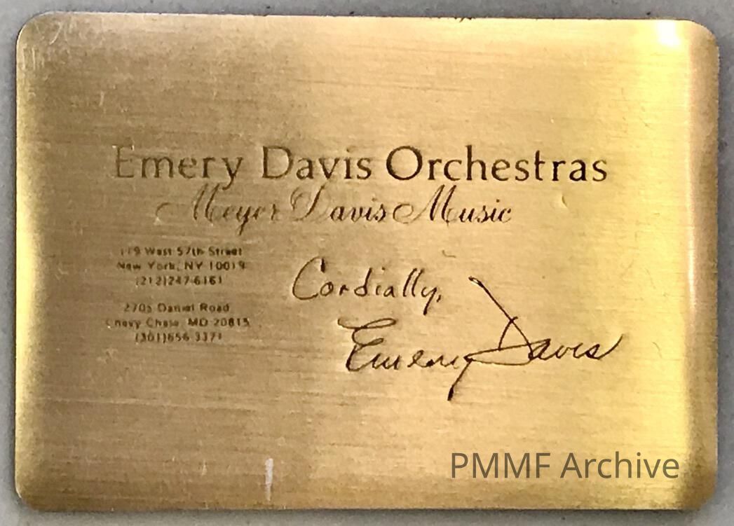 Embossed: "Emery Davis Orchestras/Meyer Davis Music" with address and phone numbers. Embossed with signature "Cordially Emery Davis"