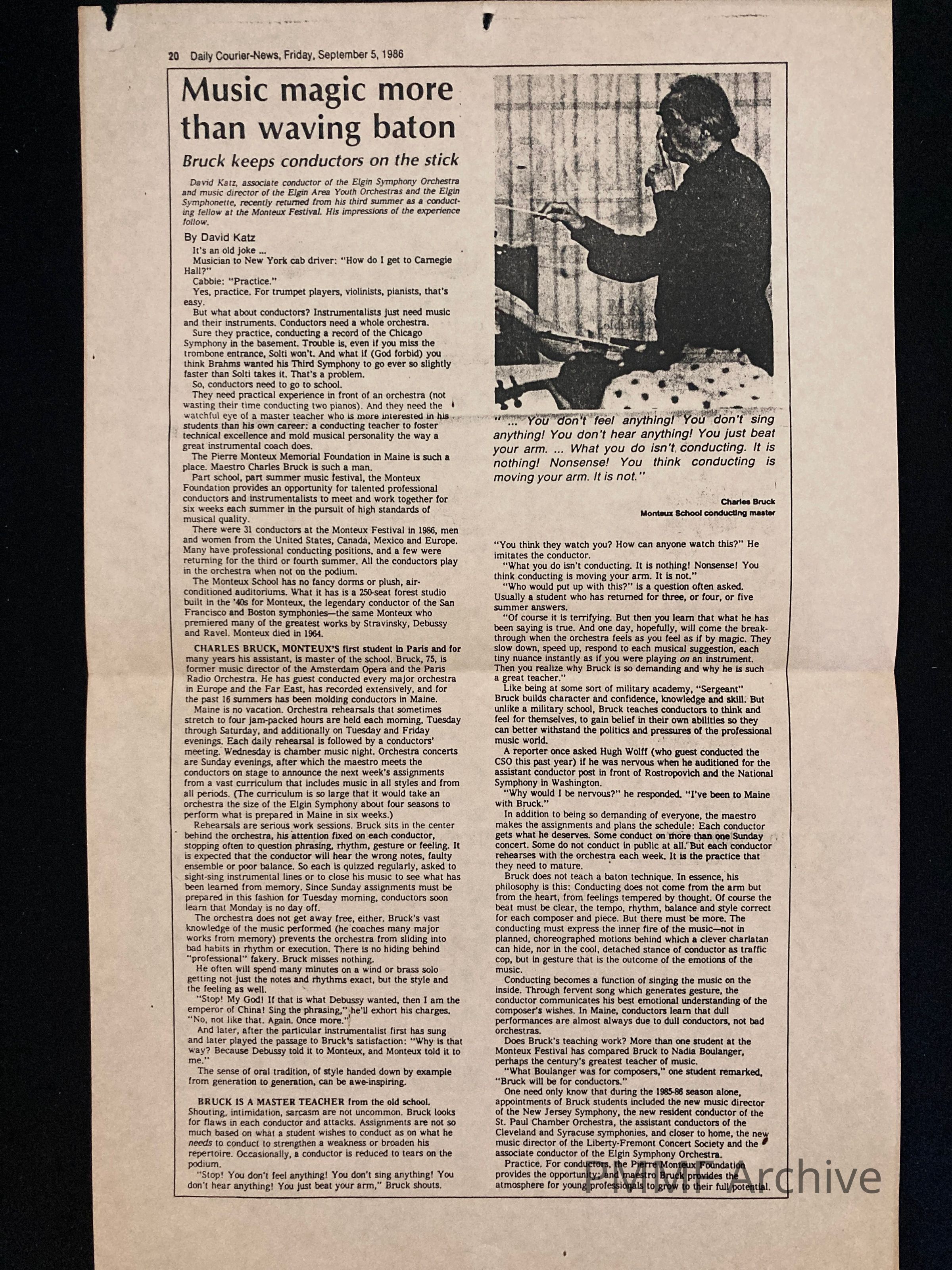David Katz writes about experience at Monteux School with Bruck in Daily Courier News, September 5, 1986Created By
