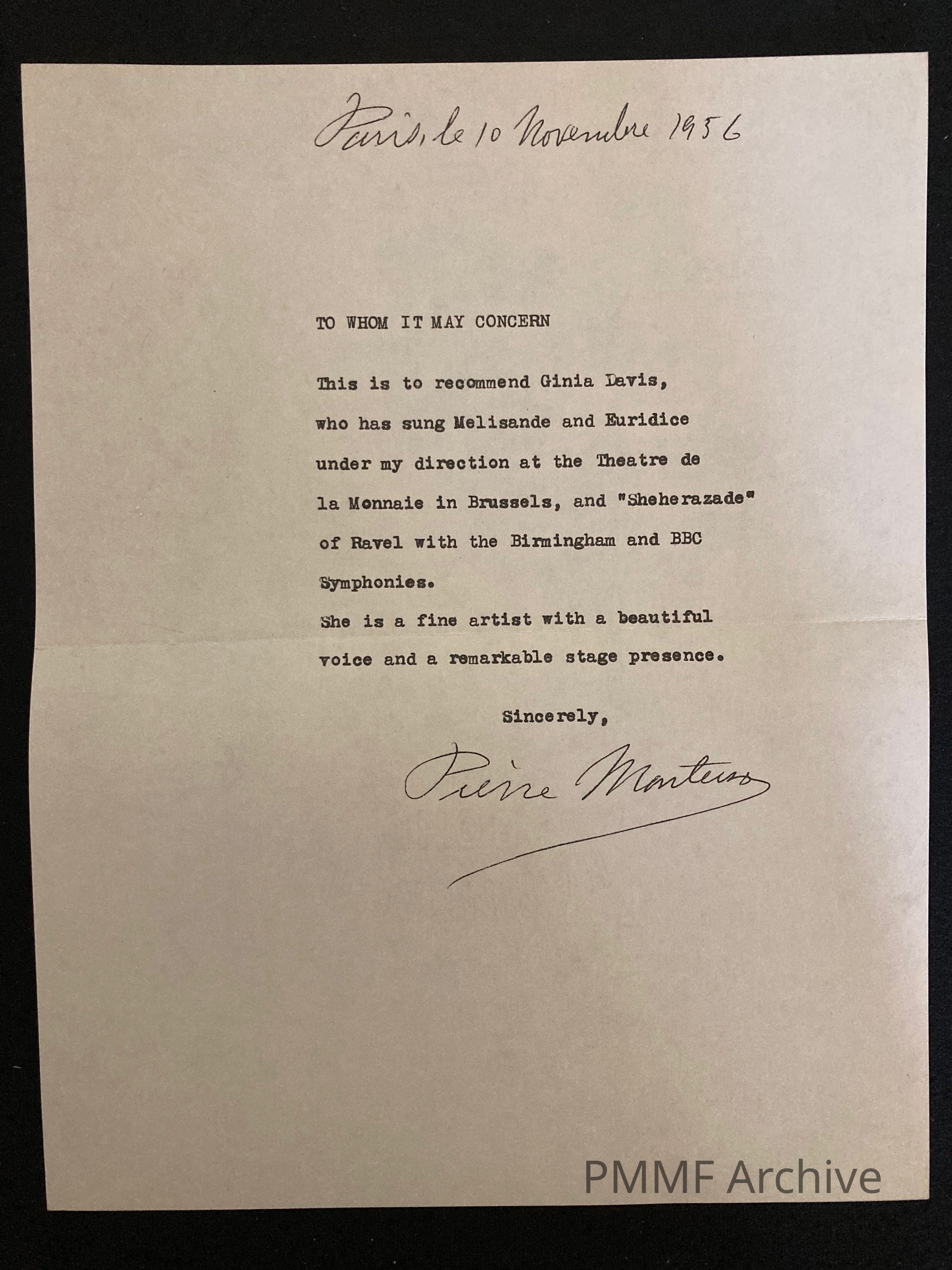 Monteux Recommendation Letter for Ginia Wexler (1956)