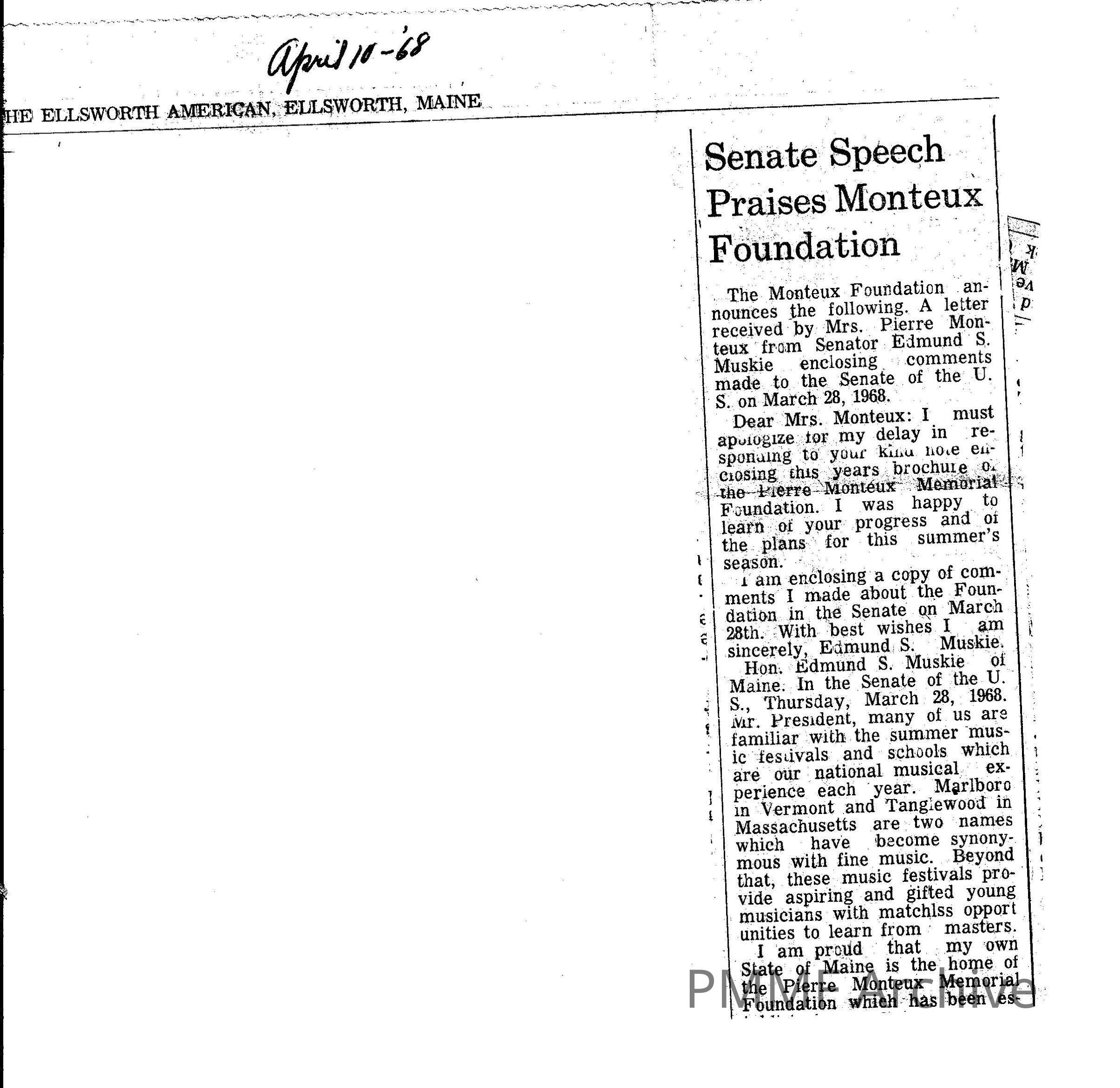 Comments by Senator Muskie about the founding of the Monteux Foundation (1968)Tags