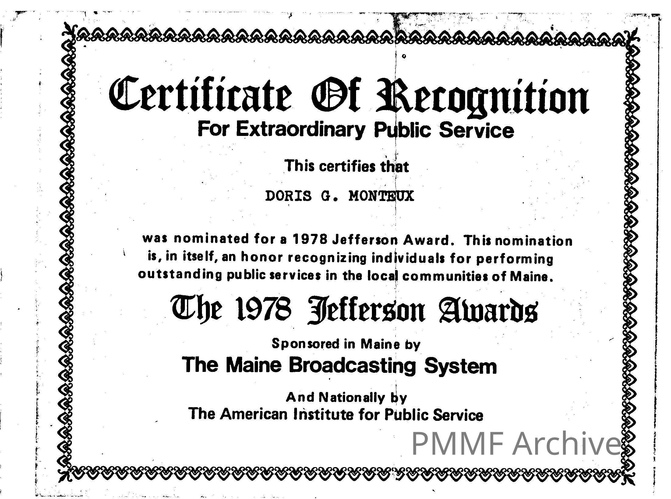 Doris Monteux Certificate of Recognition – 1978 Jefferson AwardsCollection