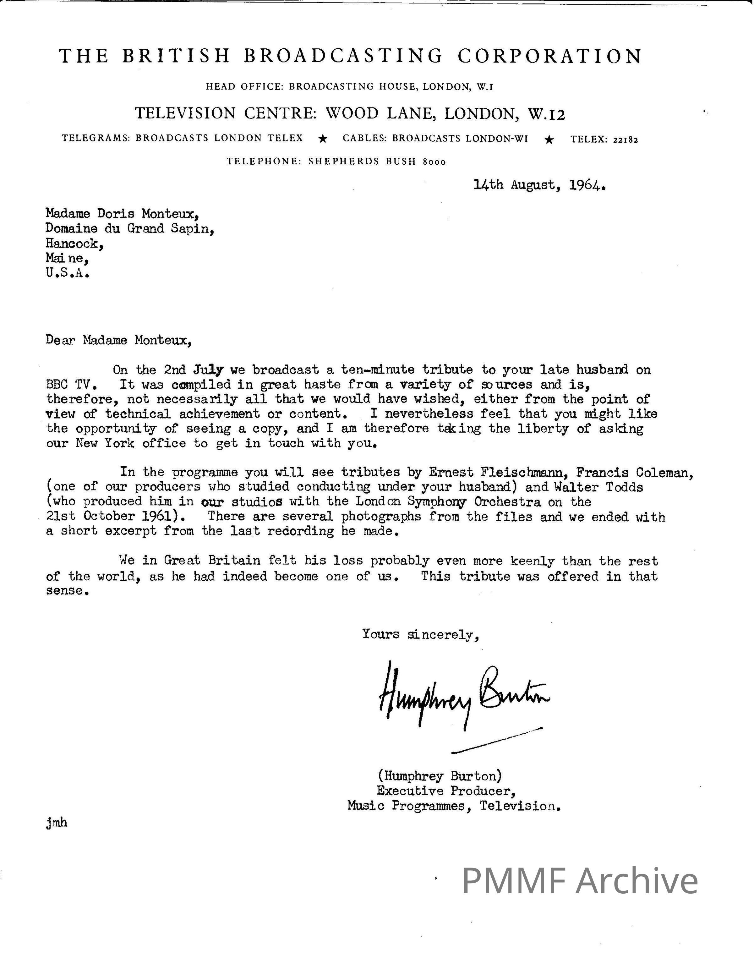 Correspondence to Doris regarding BBC TV 10-minute tribute to Monteux (1964)Tags