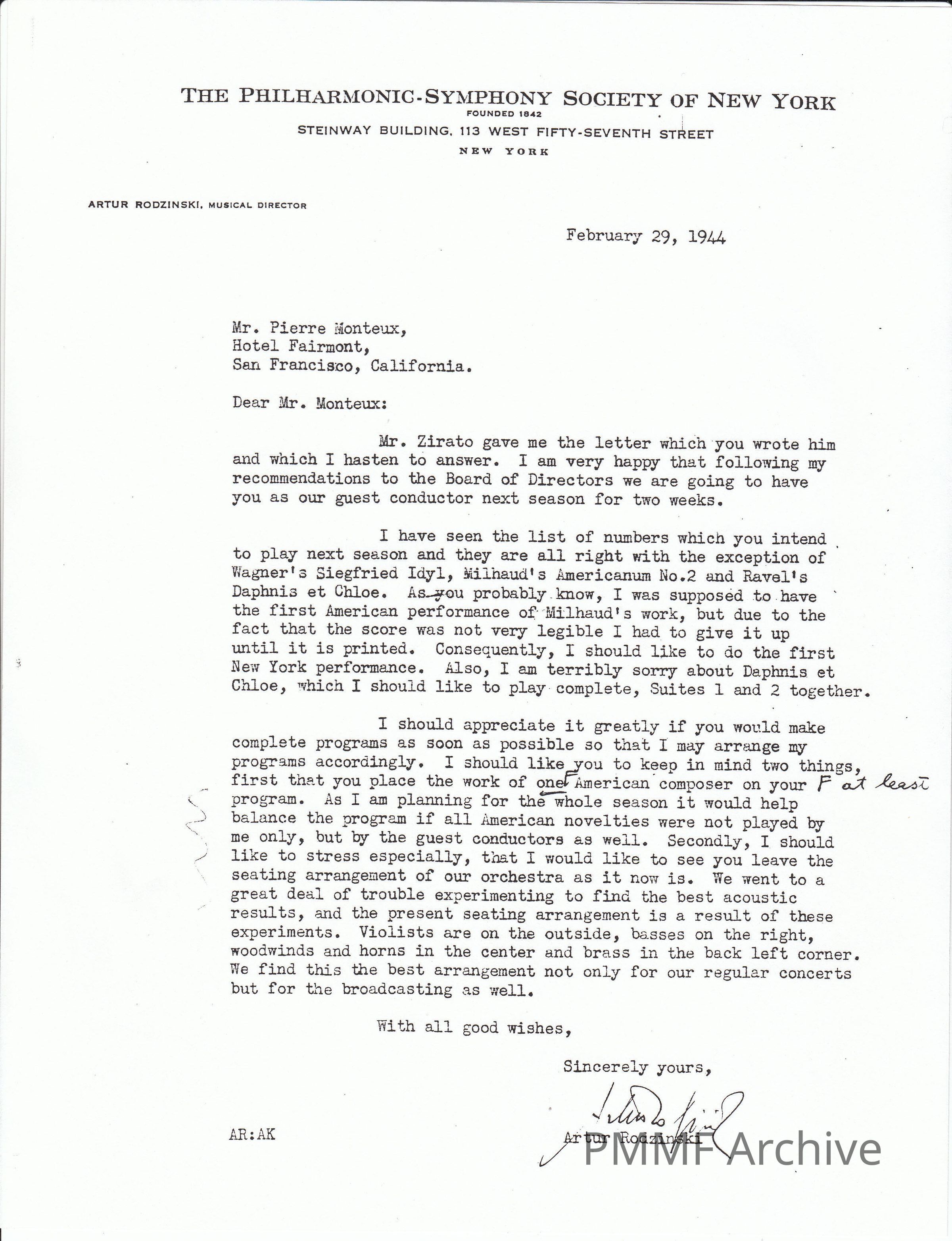 Letter to Monteux from Artur Rodzinski regarding being a guest conductor of Philharmonic Symphony Society of New York (1944)Collection