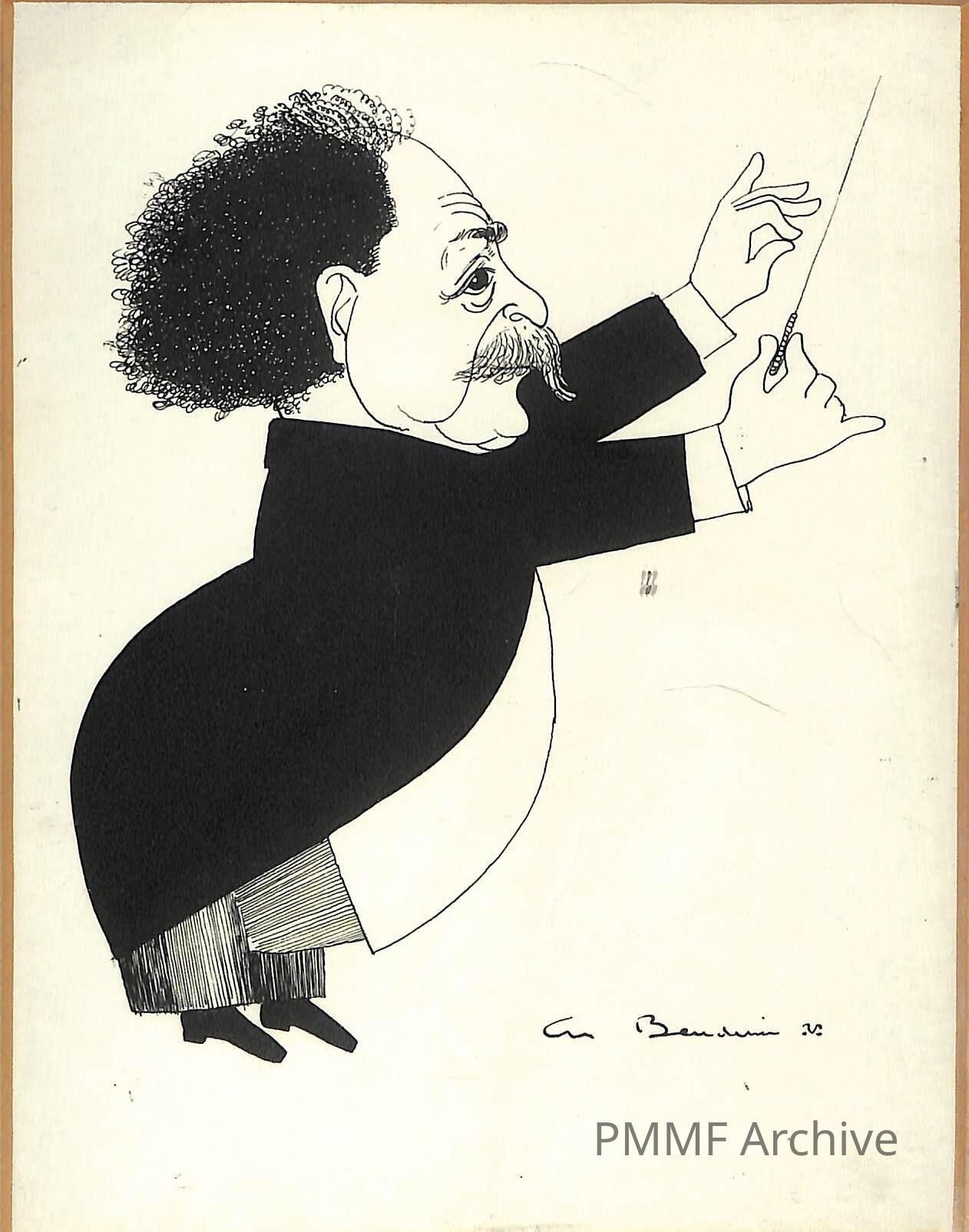 Framed and mated pen & ink drawing of Pierre Monteux leaning forward with a baton as if conducting. Image measures 6 x 8-3/4Collection