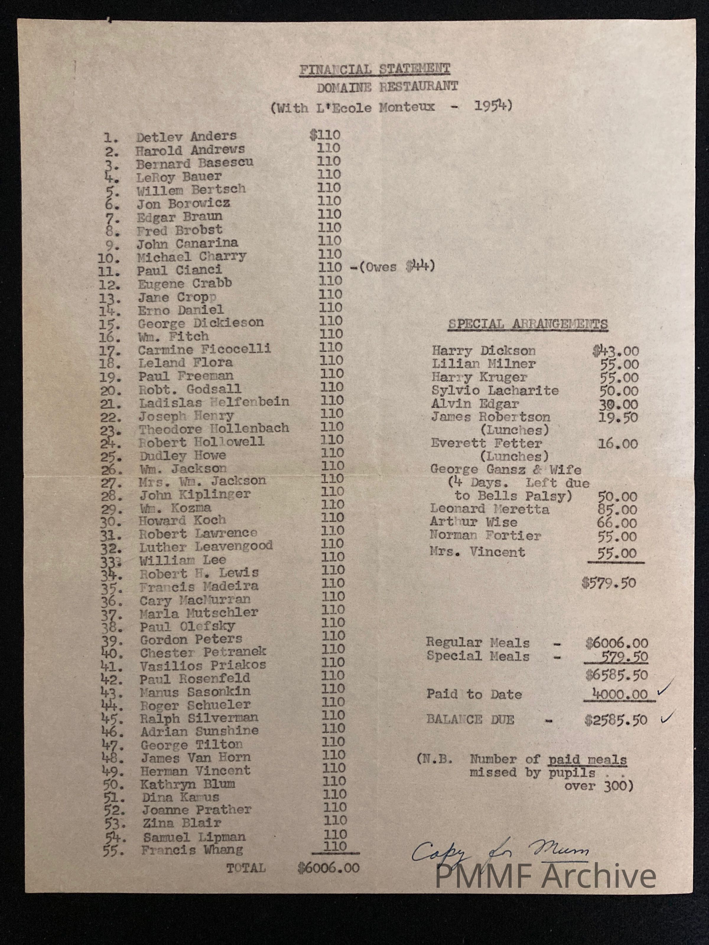 Financial Statement from Domaine Restaurant for students, 1954