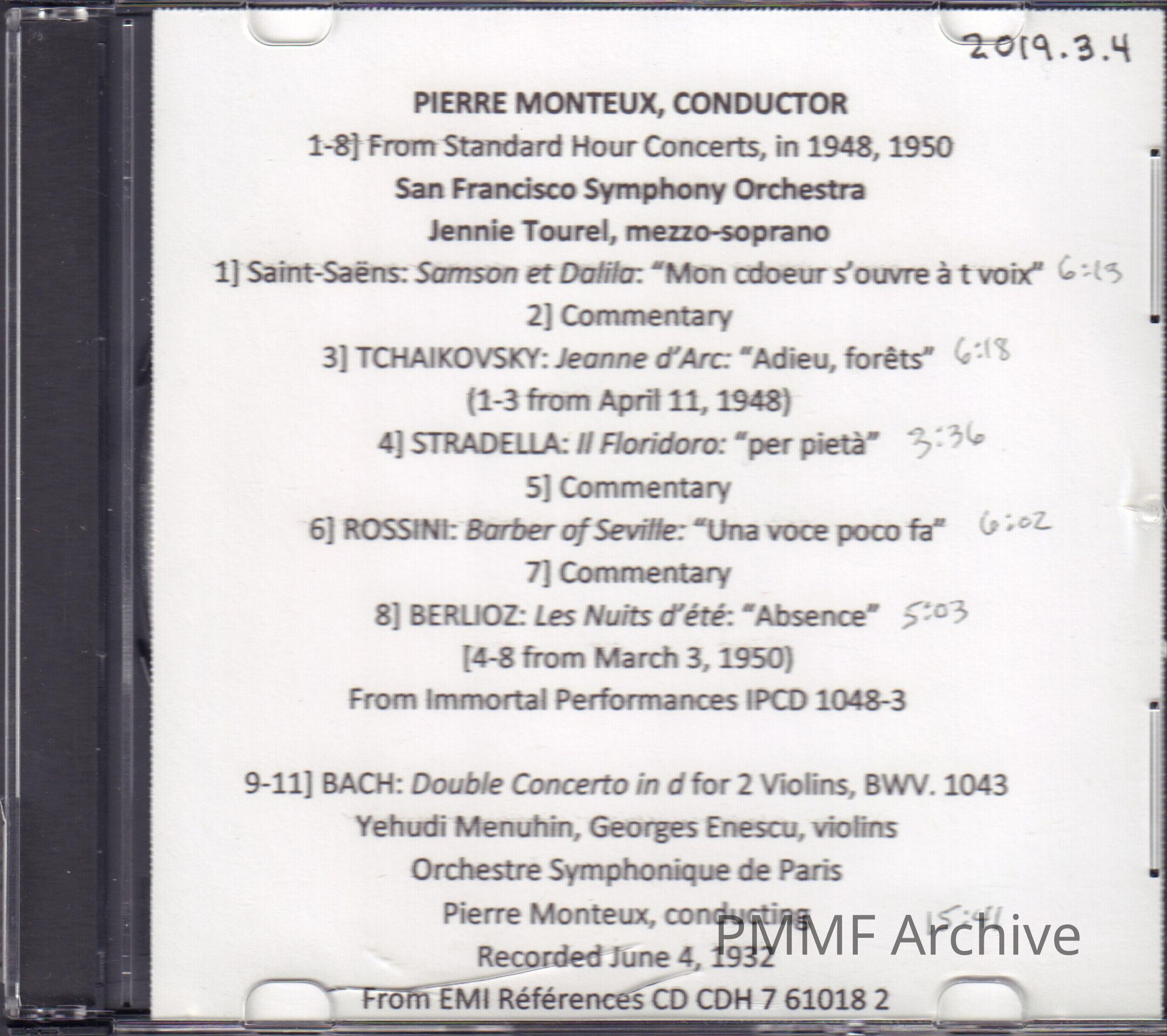 Monteux, Pierre, San Francisco Symphony Orchestra, IMMORTAL PERFORMANCES IPCD 103Archive Notes