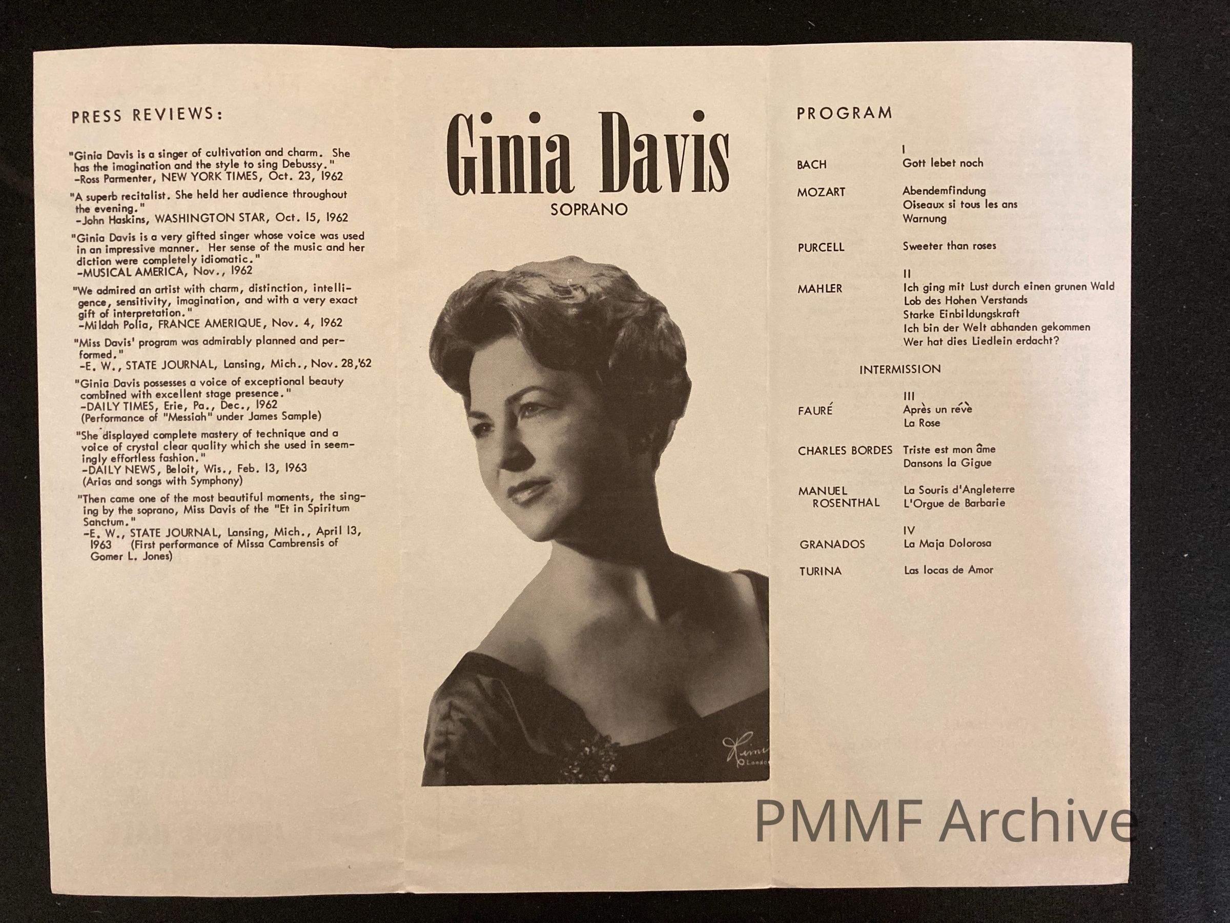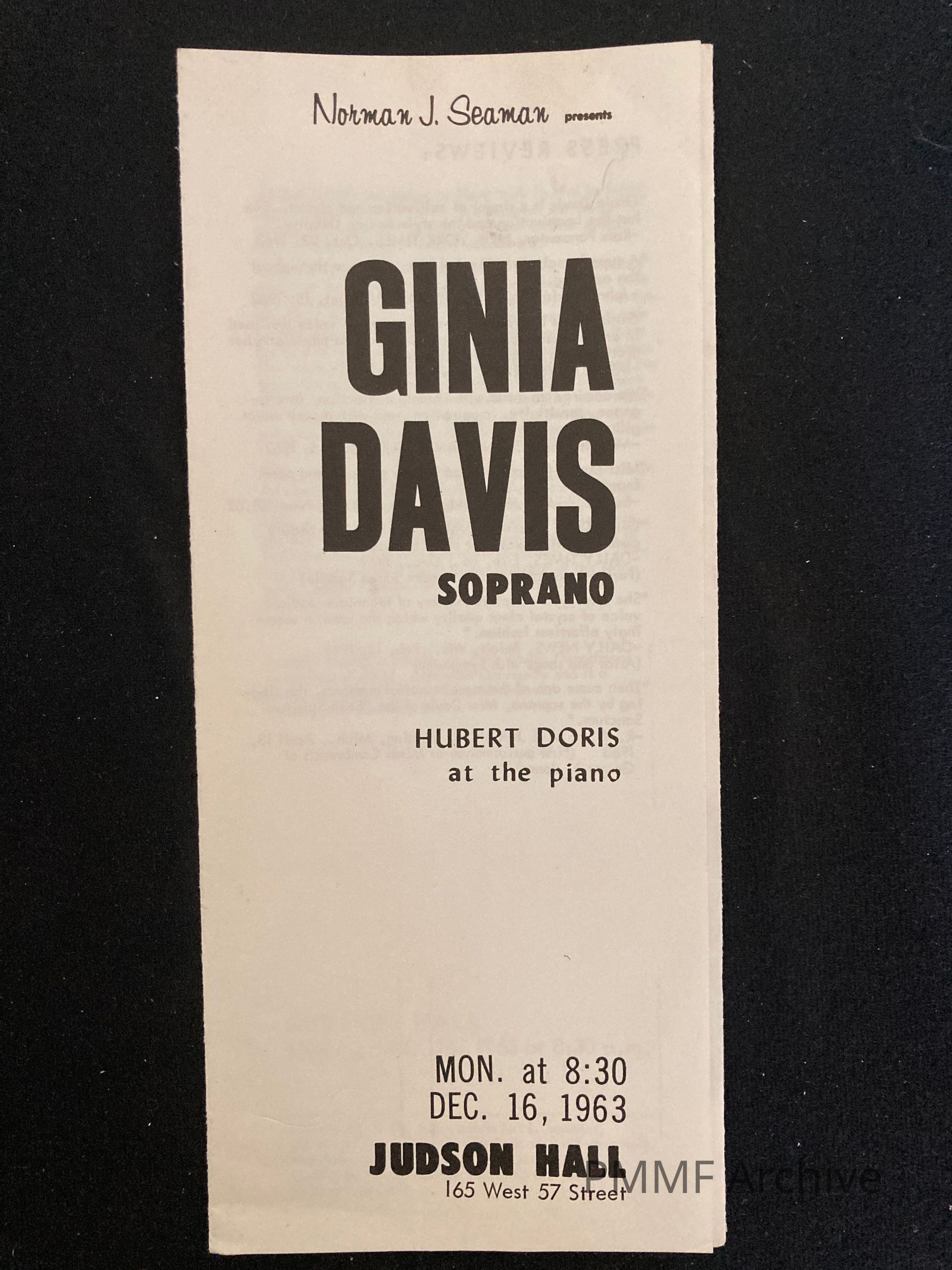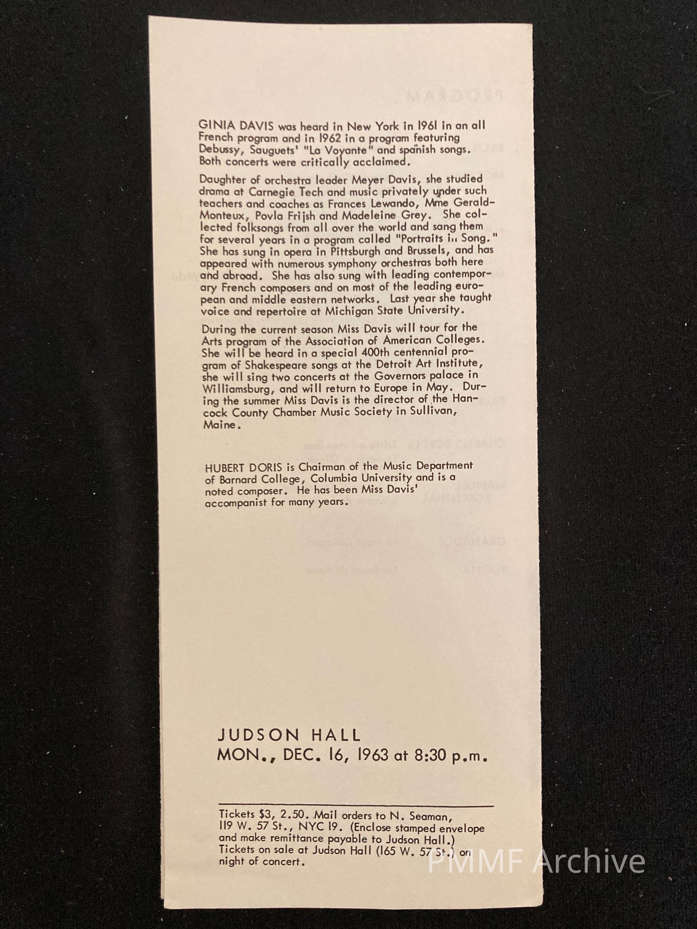 Ginia Davis Soprano with Hubert Doris at the Piano 1963 concert program