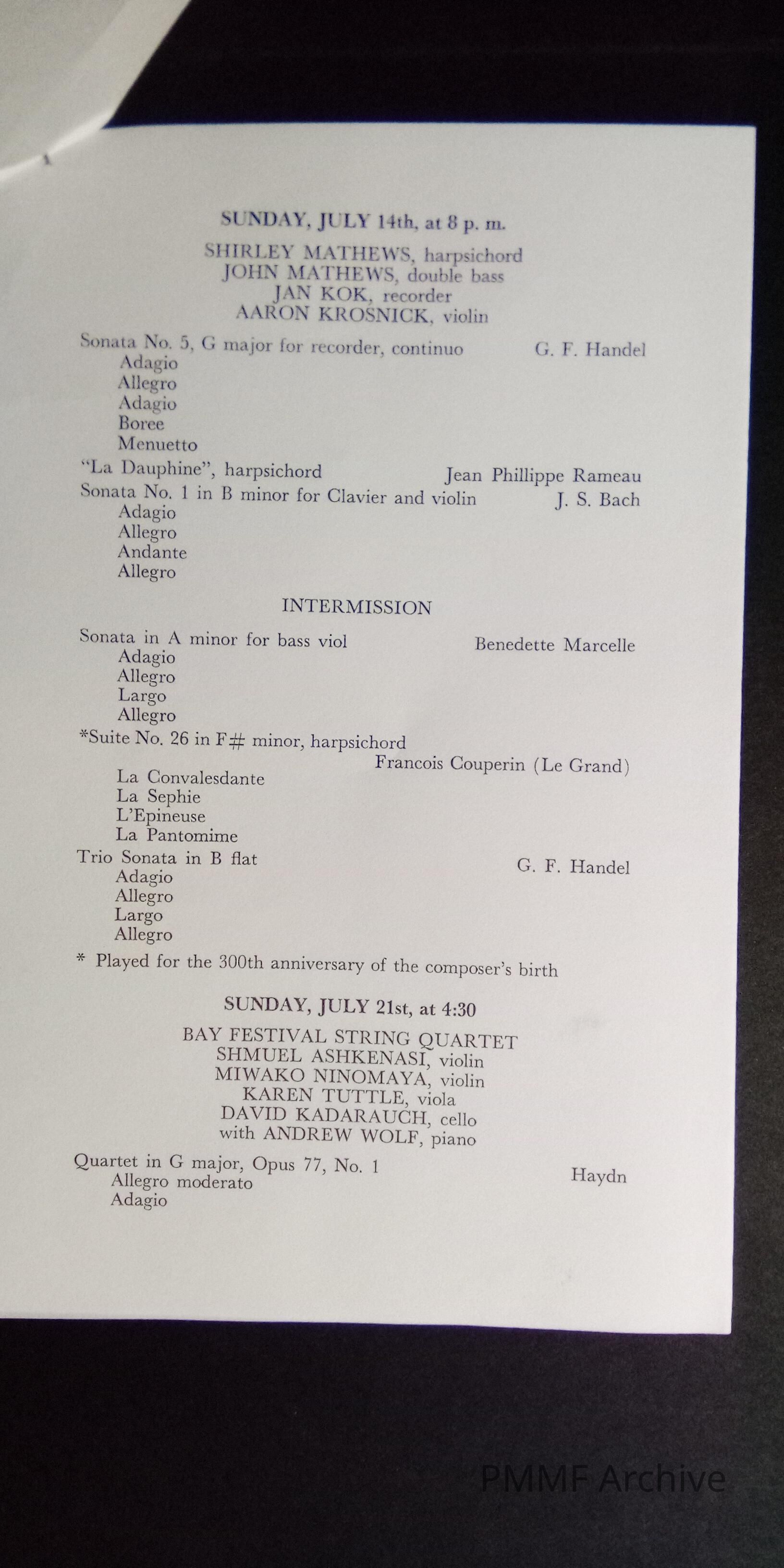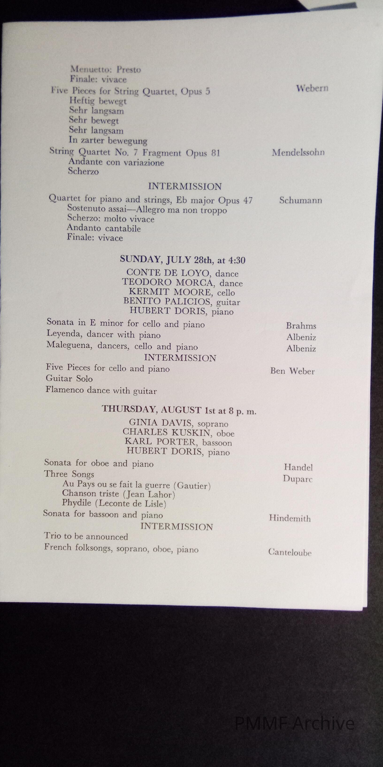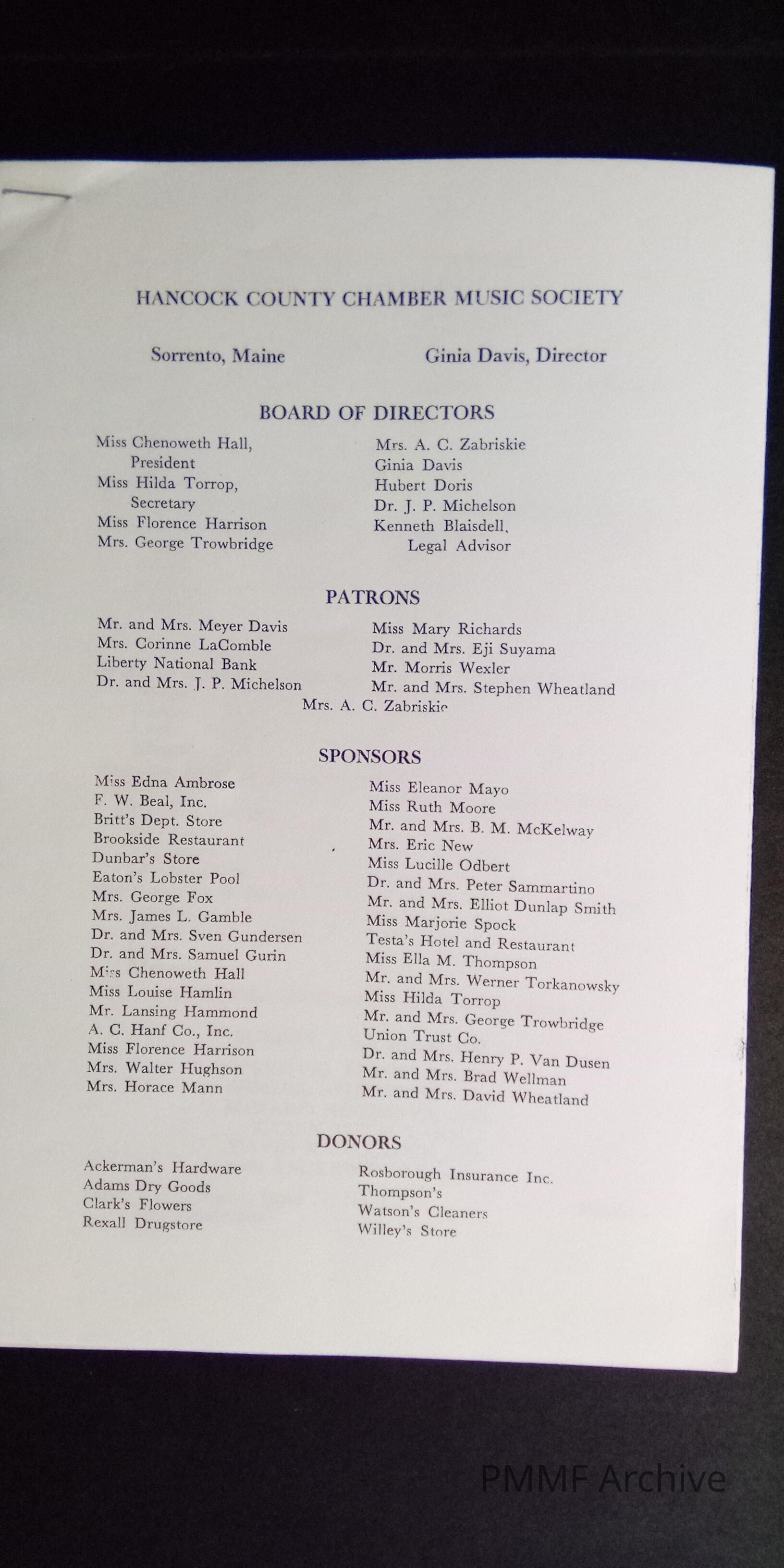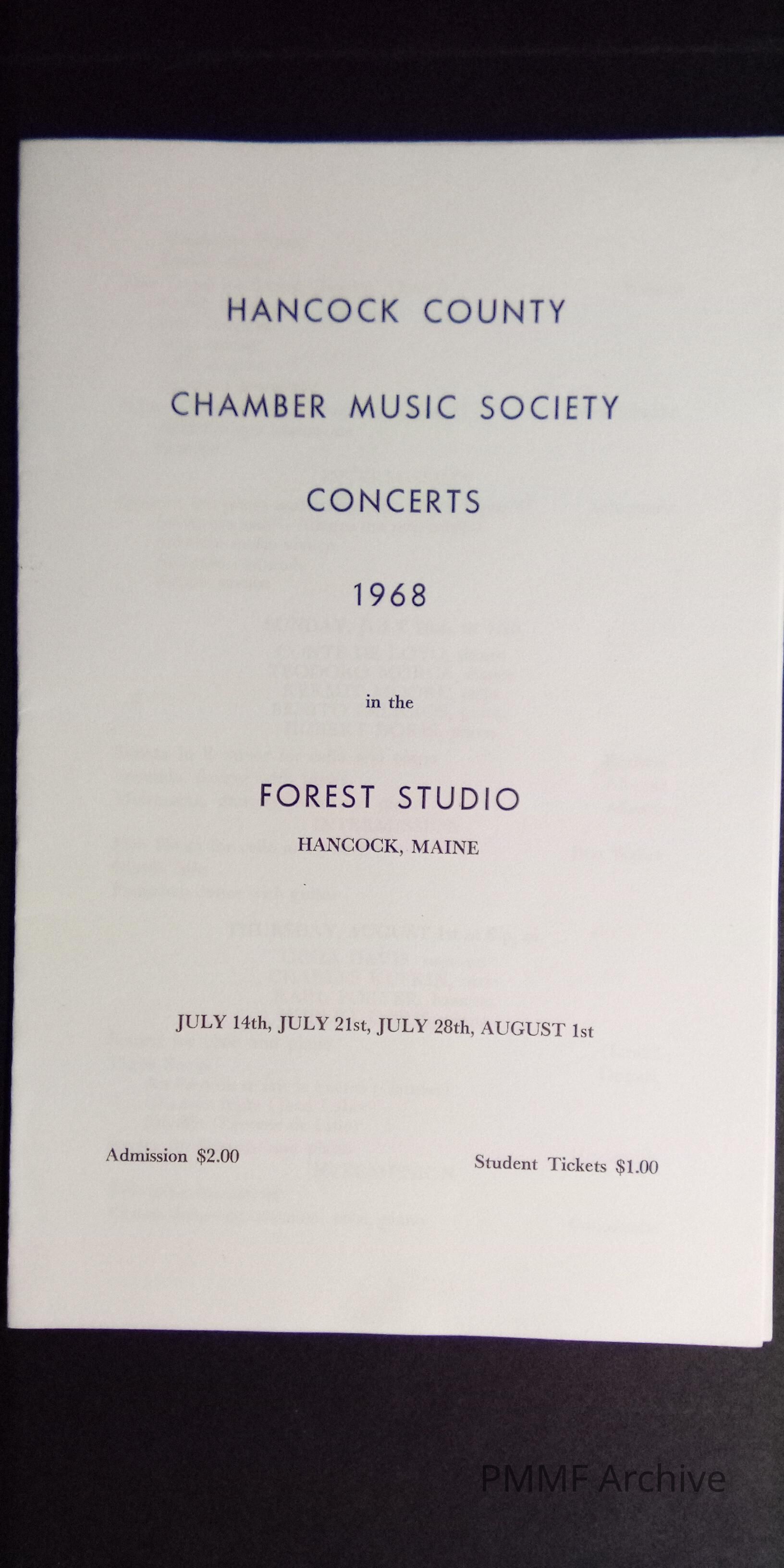 Hancock County Chamber Music Society Concerts, 1968, at the Forest Studio, Hancock, Maine
