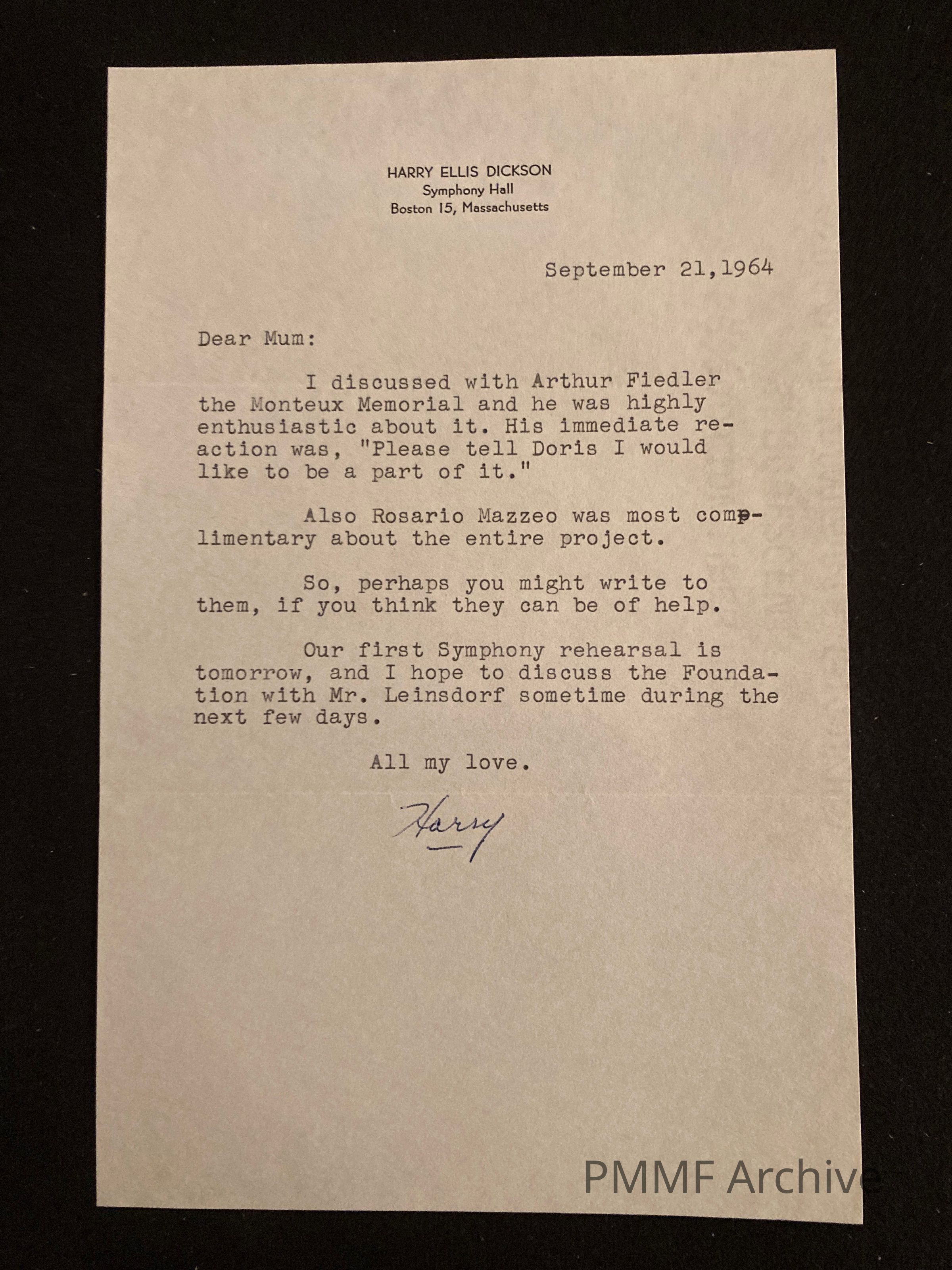 Typed, signed letter also refers to support for Monteux Memorial from Arthur Fiedler, Rosario Mazzeo and Mr. Leinsdorf. Signed "Harry"
