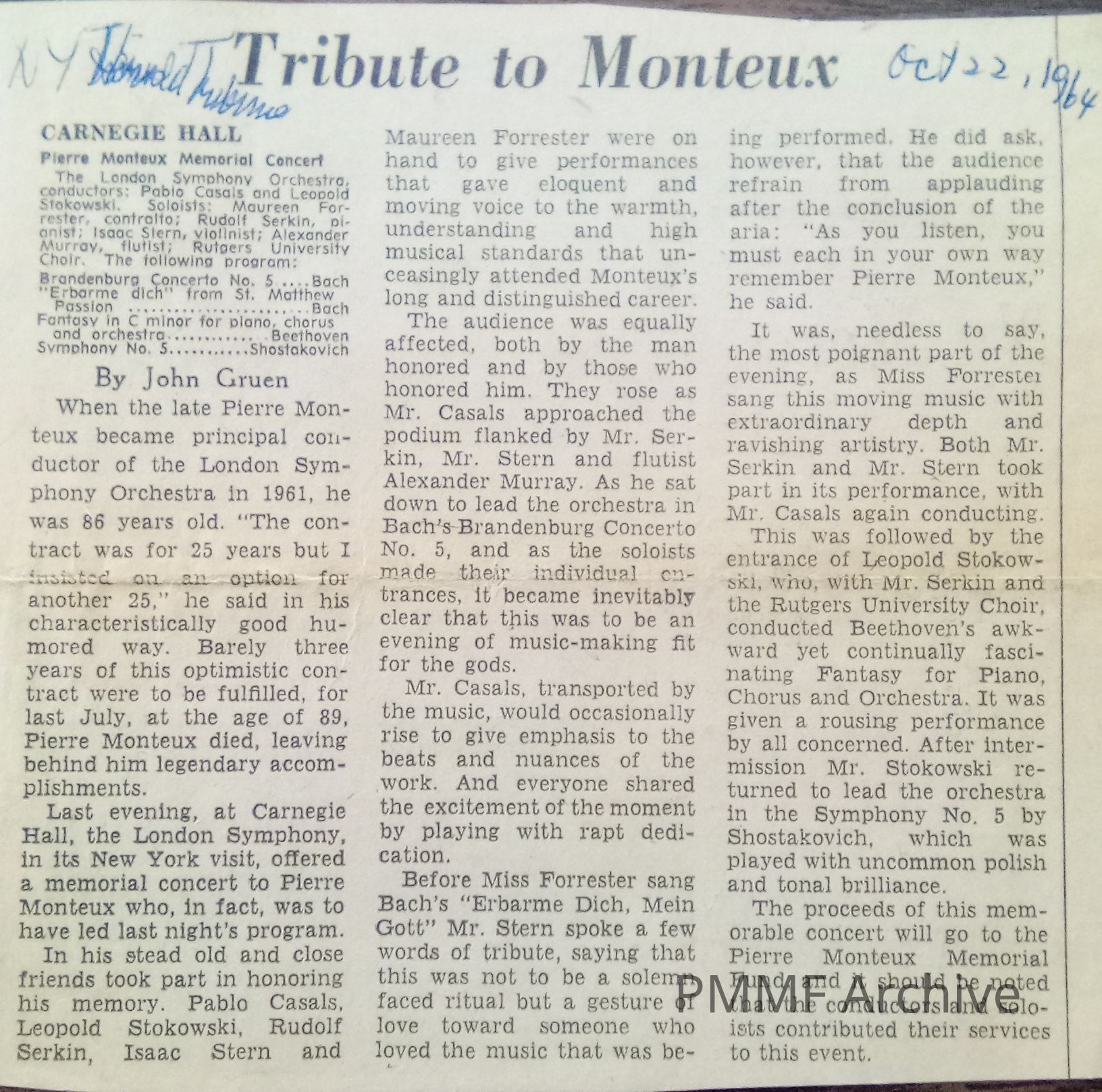Memorial Concert by London Symphony at Carnegie Hall (Monteux was to have conducted the concert) [New York Herald Tribune 10/ 22/ 64]Created By