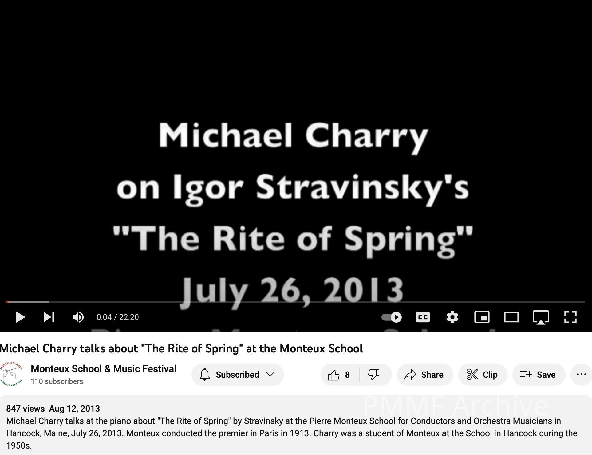 Michael Charry talks at the Monteux School in 2013 about "The Rite of Spring" which premiered in 1913 conducted by Pierre Monteux.Created By