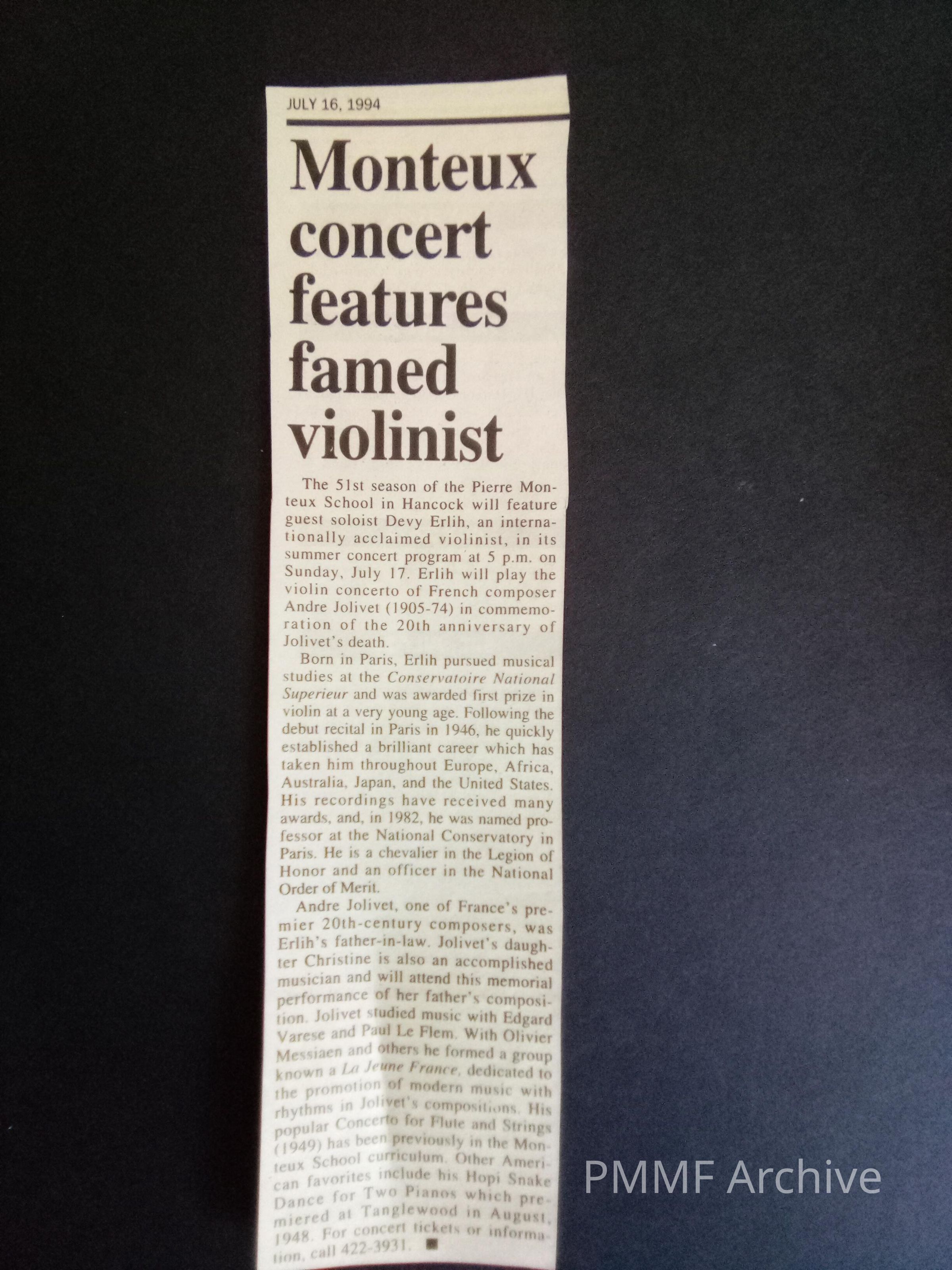 Monteux Concert features famed violinist (David Erlih) 1994