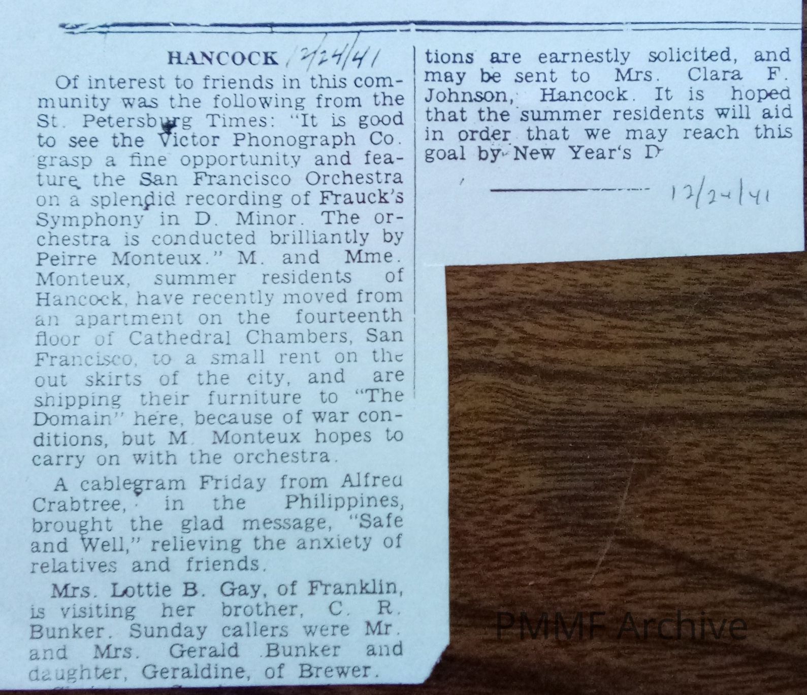 Monteux mentioned as Hancock summer resident in Ellsworth American 12/24/41