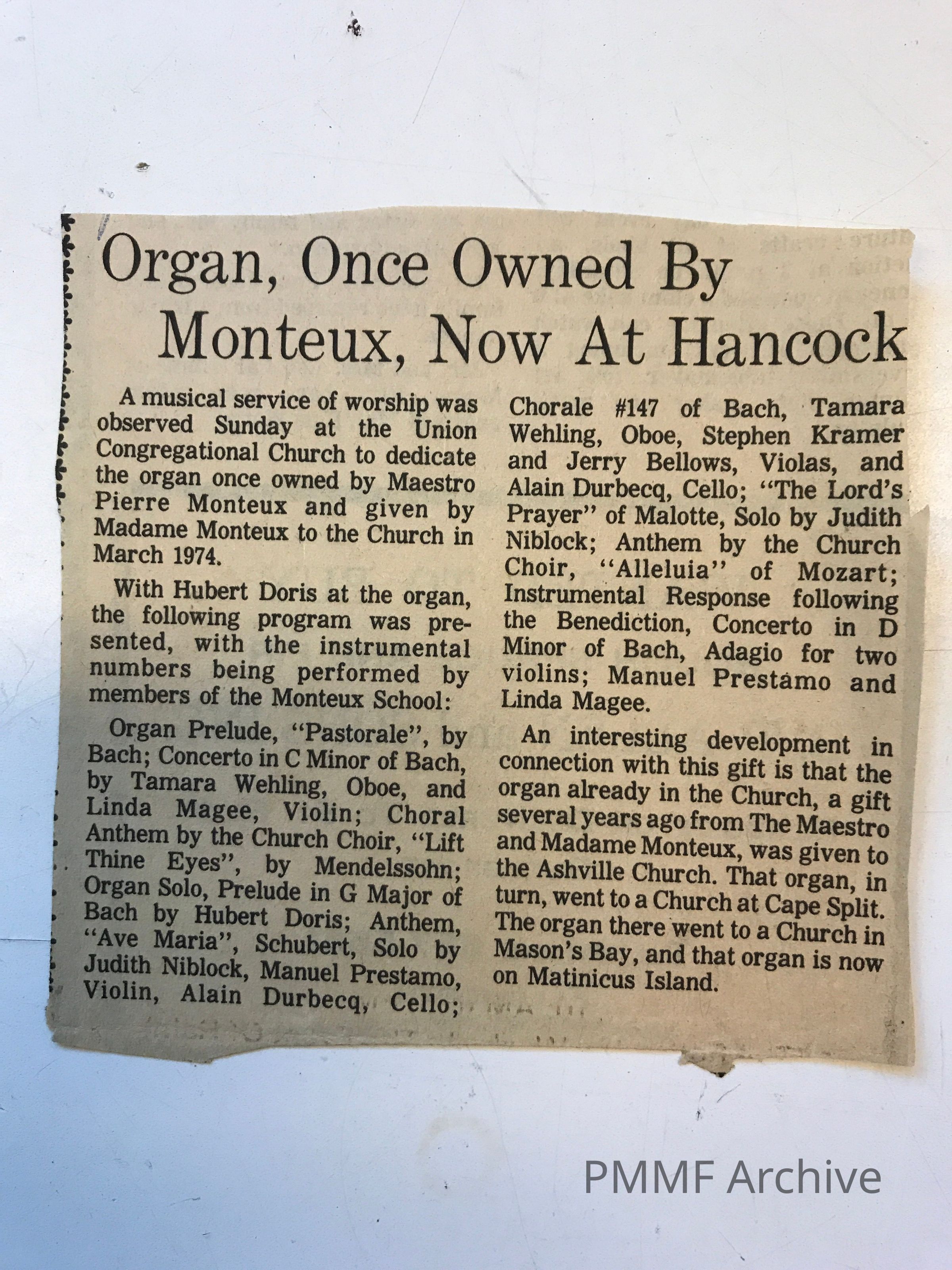 Monteux Organ donated to Union Congregational Church of Hancock 1974Scope and Content