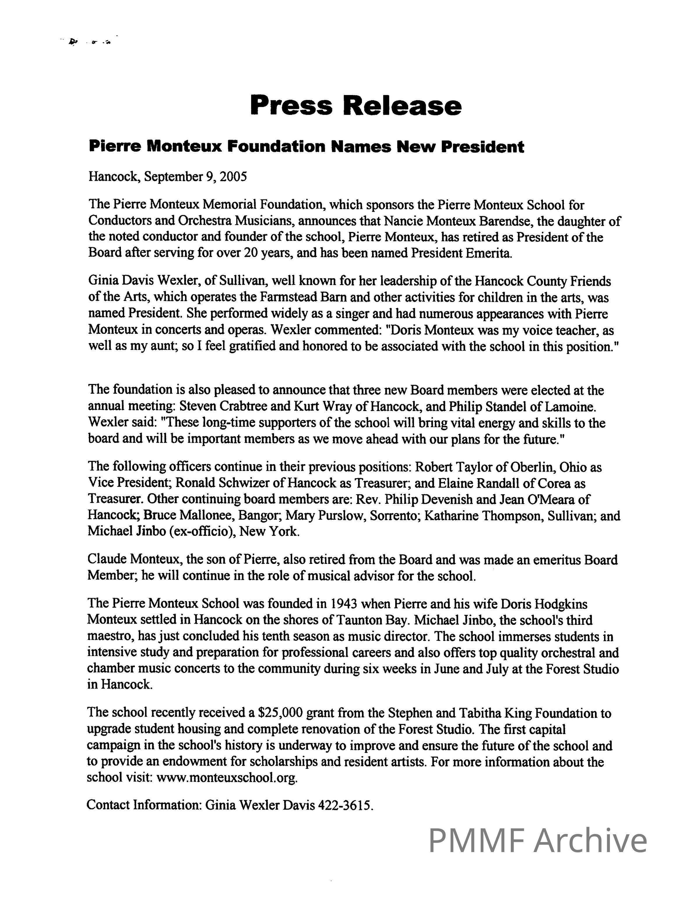 Press release naming Ginia Davis Wexler as new President