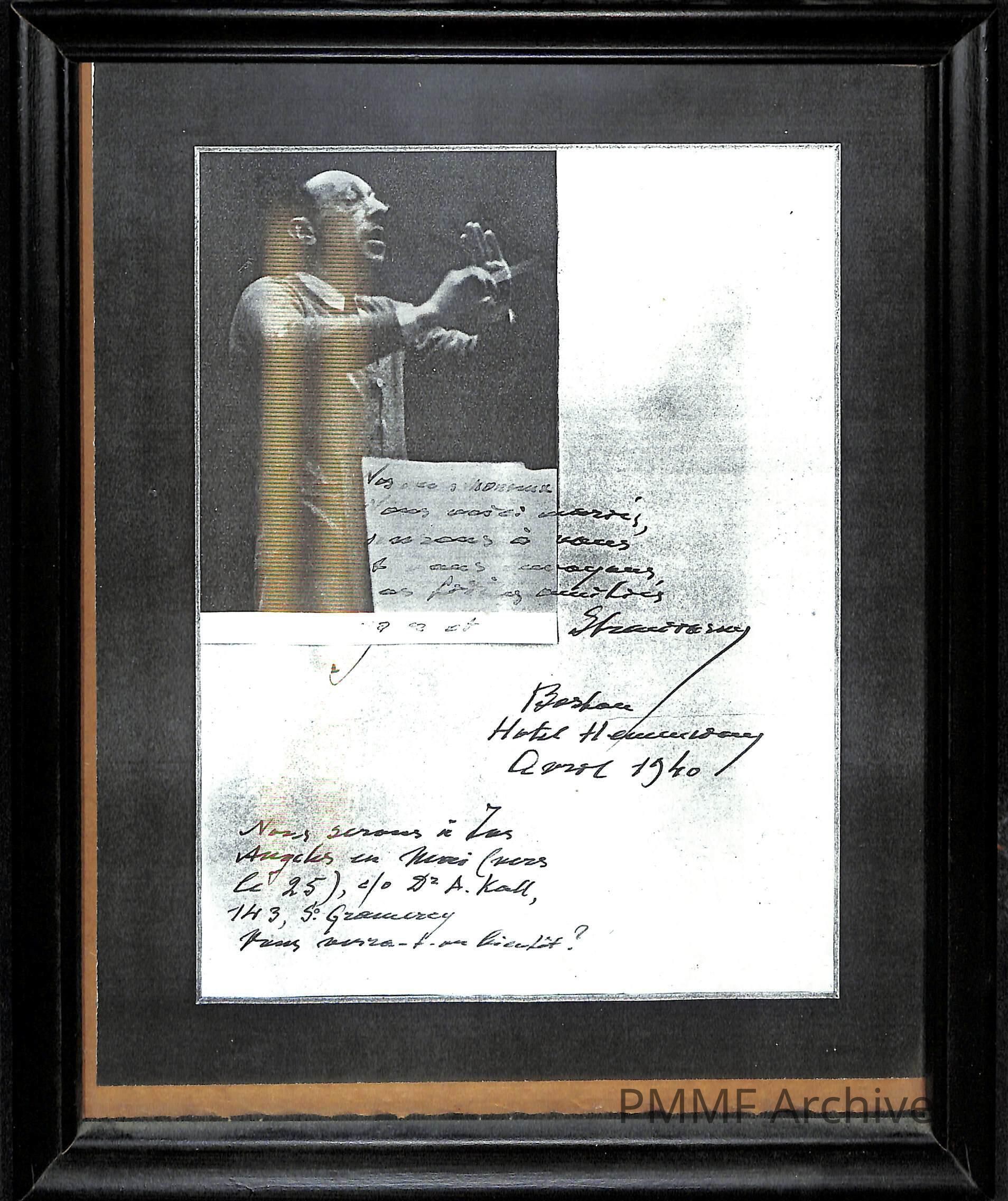 Framed photocopy of photo of Stravinsky conducting, along with a short text signed by him.Collection
