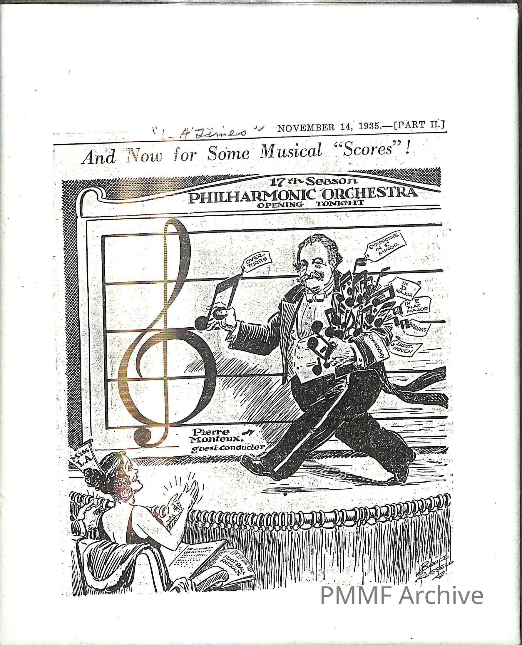 Framed photocopy of published cartoon by Bruce Russell from the L.A. Times, November 14, 1935. Shows Monteux identified as "guest conductor" walking briskly across the stage holding various musical notes, variously labeled with types of musical compositions, names of composers, or musical keys of various works. "Miss LA." sits applauding in the front row.Collection