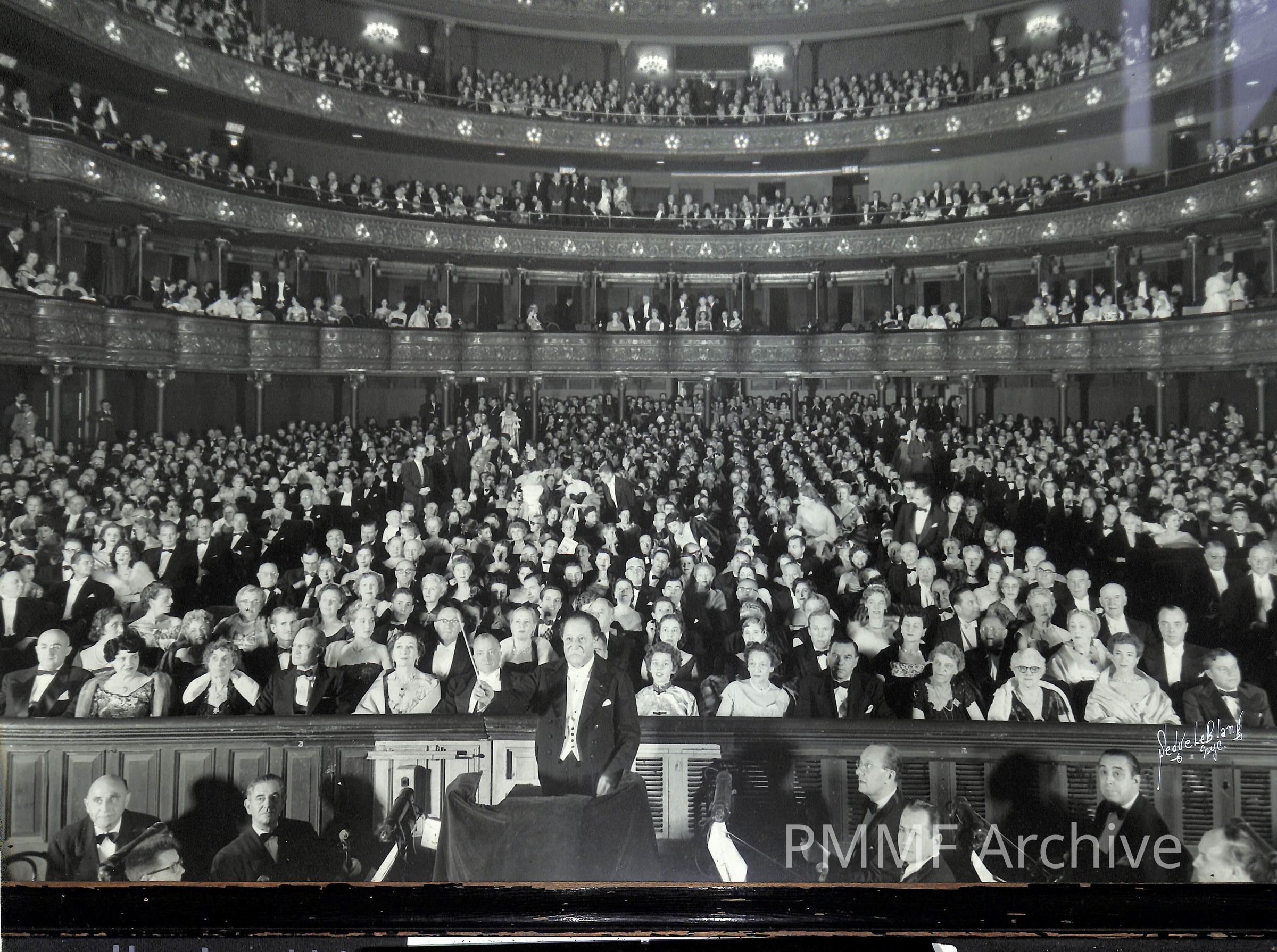 Framed and matted photo of Pierre Monteux conducting the Metropolitan Opera Orchestra; view from stage with audience. Photo by LeBlang, NYCCollection