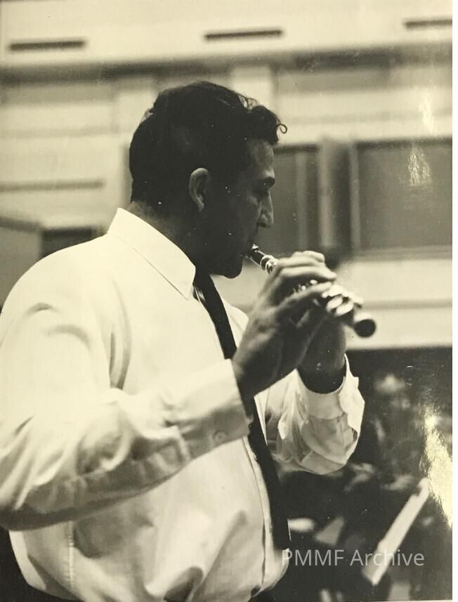 b&w photograph of Claude Monteux playing flute in a concert performance.