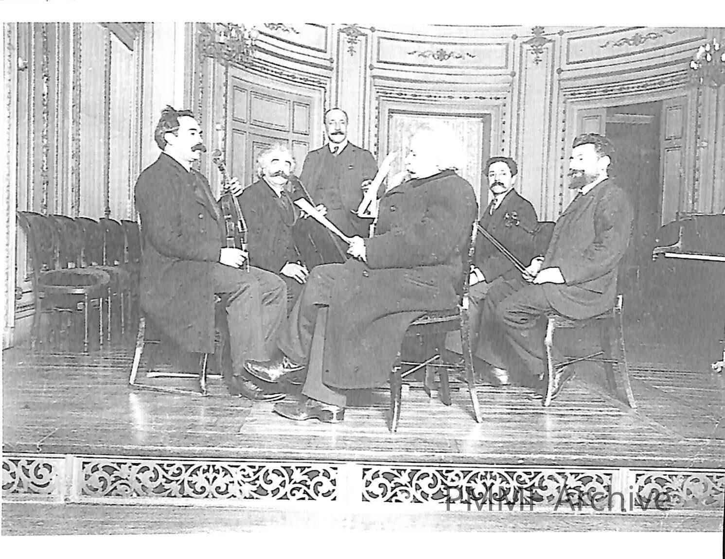 Monteux (2nd from right) playing viola in the Geloso Quartet. Edvard Grieg sits with score on the foreground.Collection