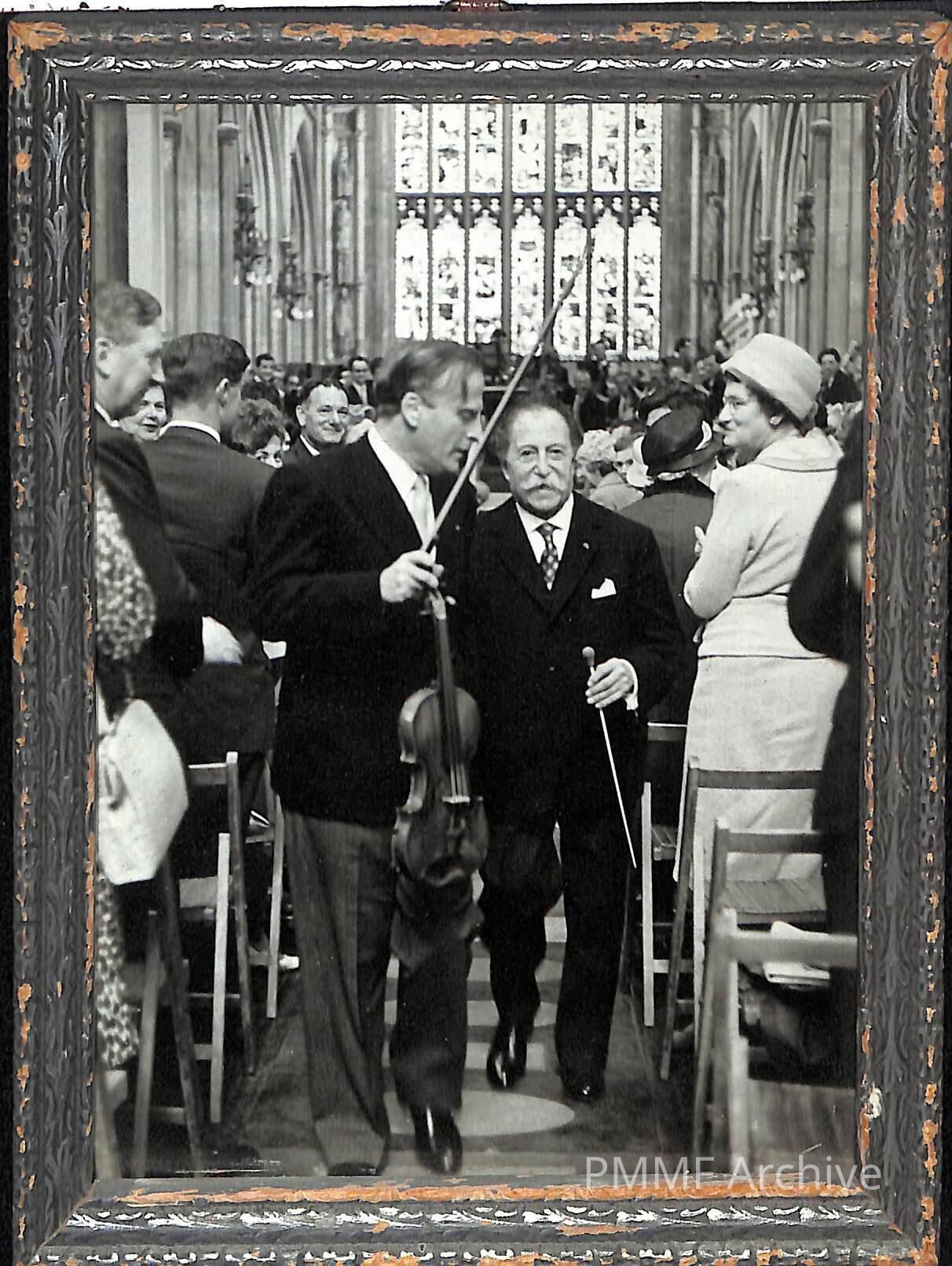 Framed photo of Pierre Monteux and Yehudi Menuhin receiving audience applause following a church concert. Location unknownCollection