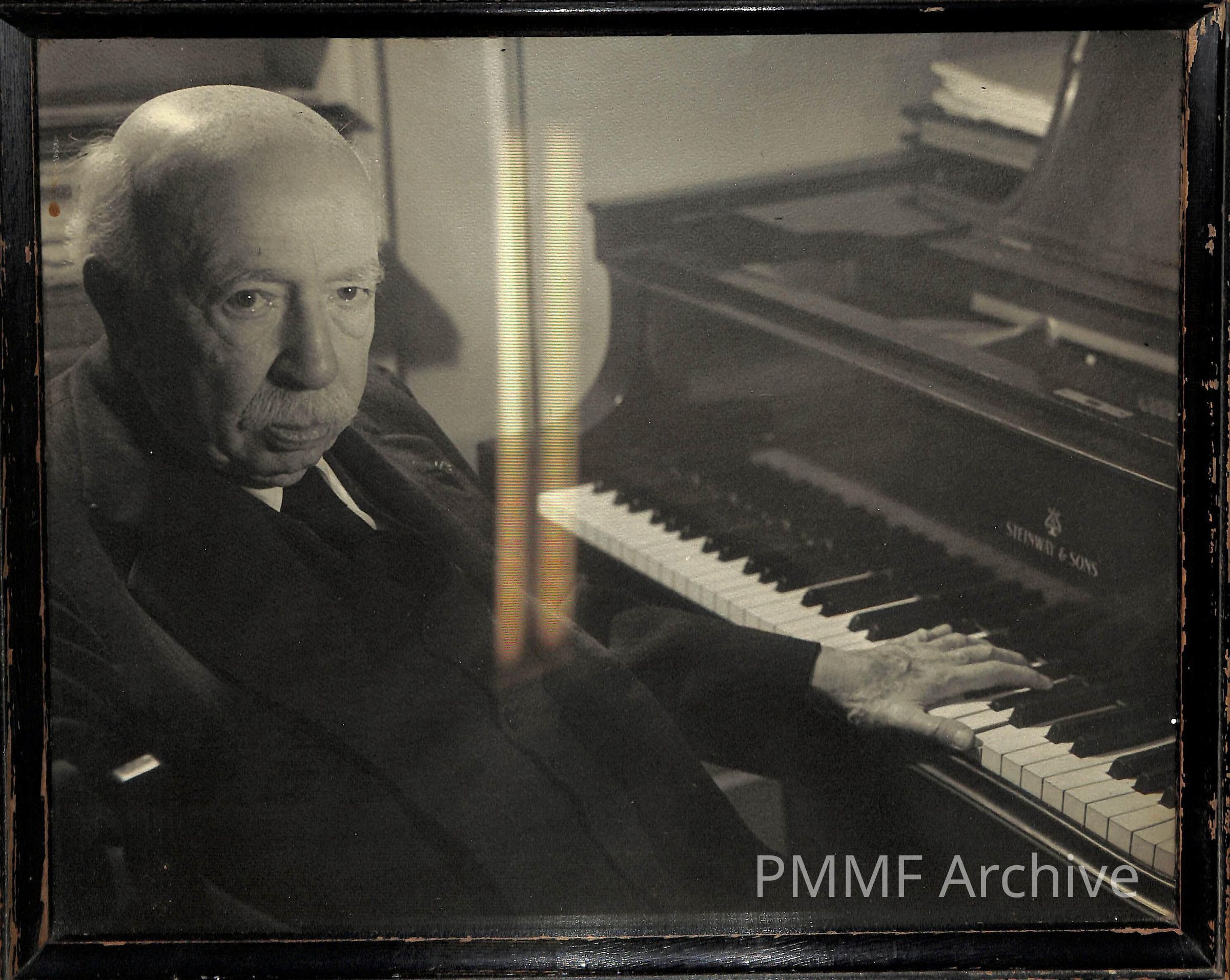 Formal framed black & white photo of pianist facing photogtapher with left hand on keyboard of a Steinway. [Subject not identified.]Collection