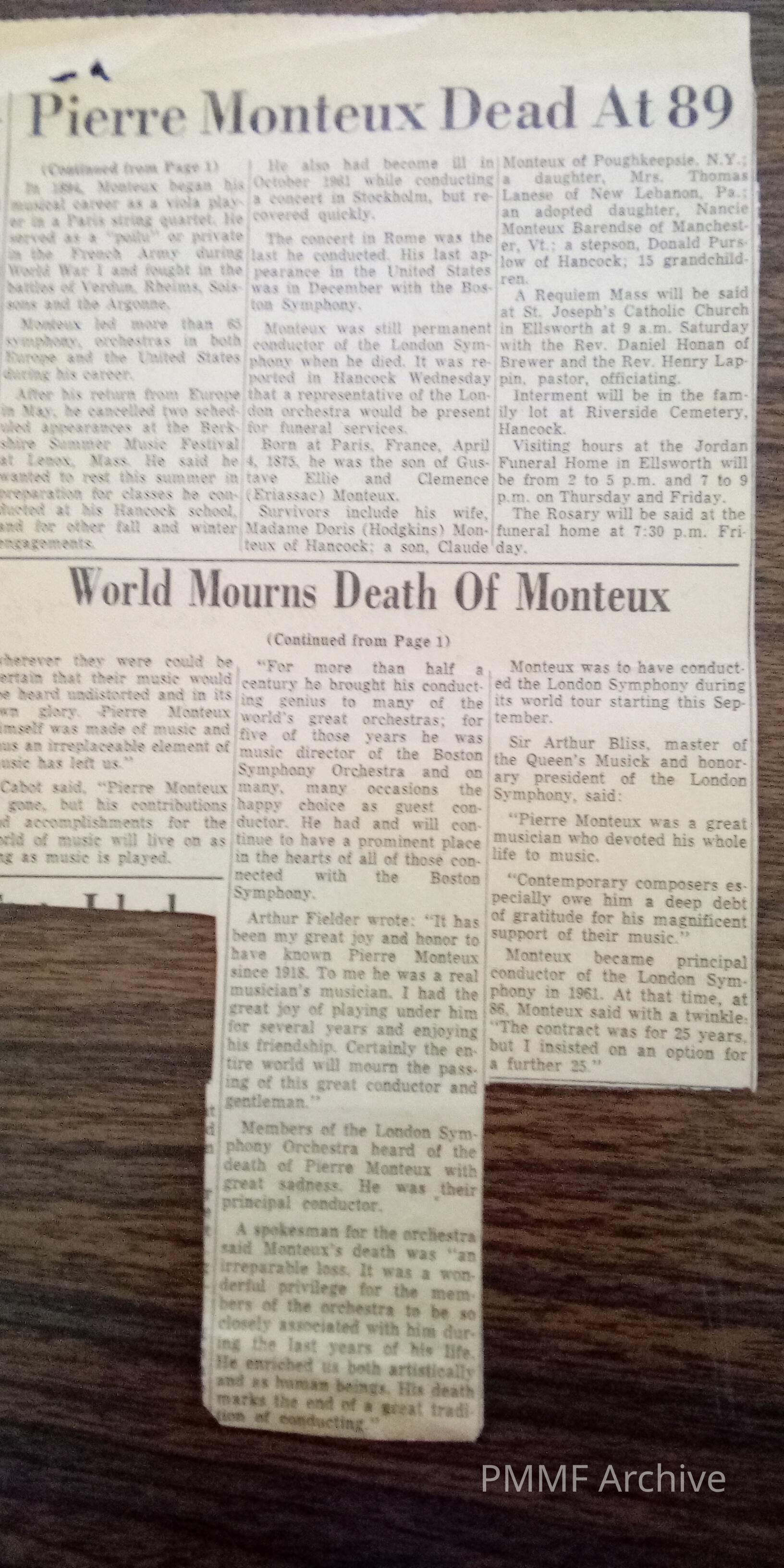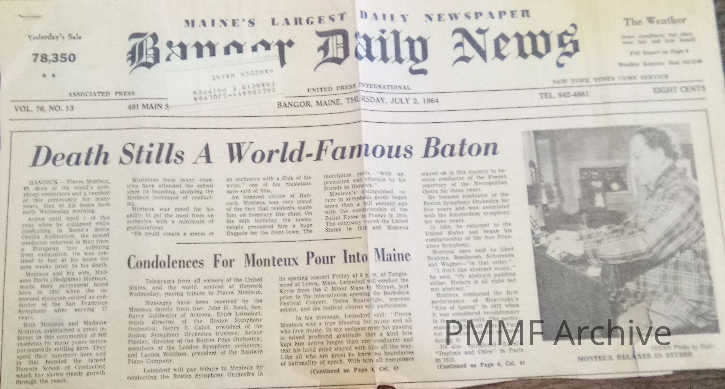 Pierre Monteux Dead at 89 (Bangor Daily News 7 /2/ 64)