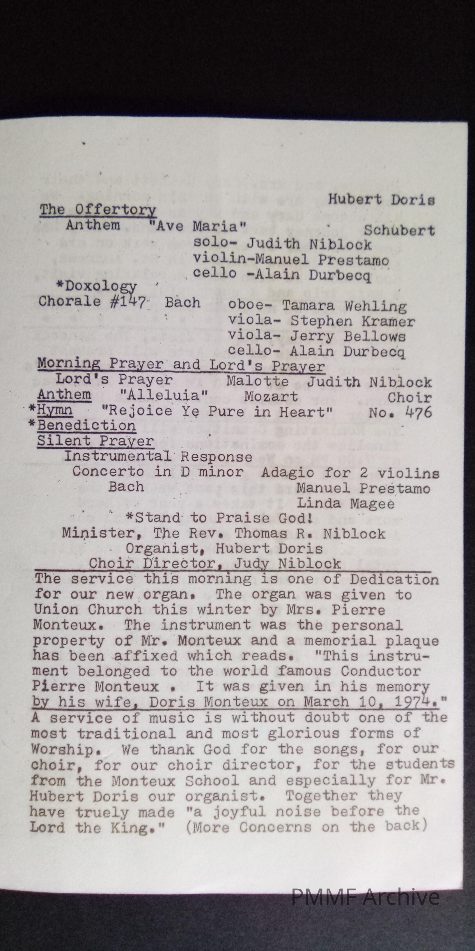 Pierre Monteux organ dedication at Union Congregational Church of Hancock, 1974