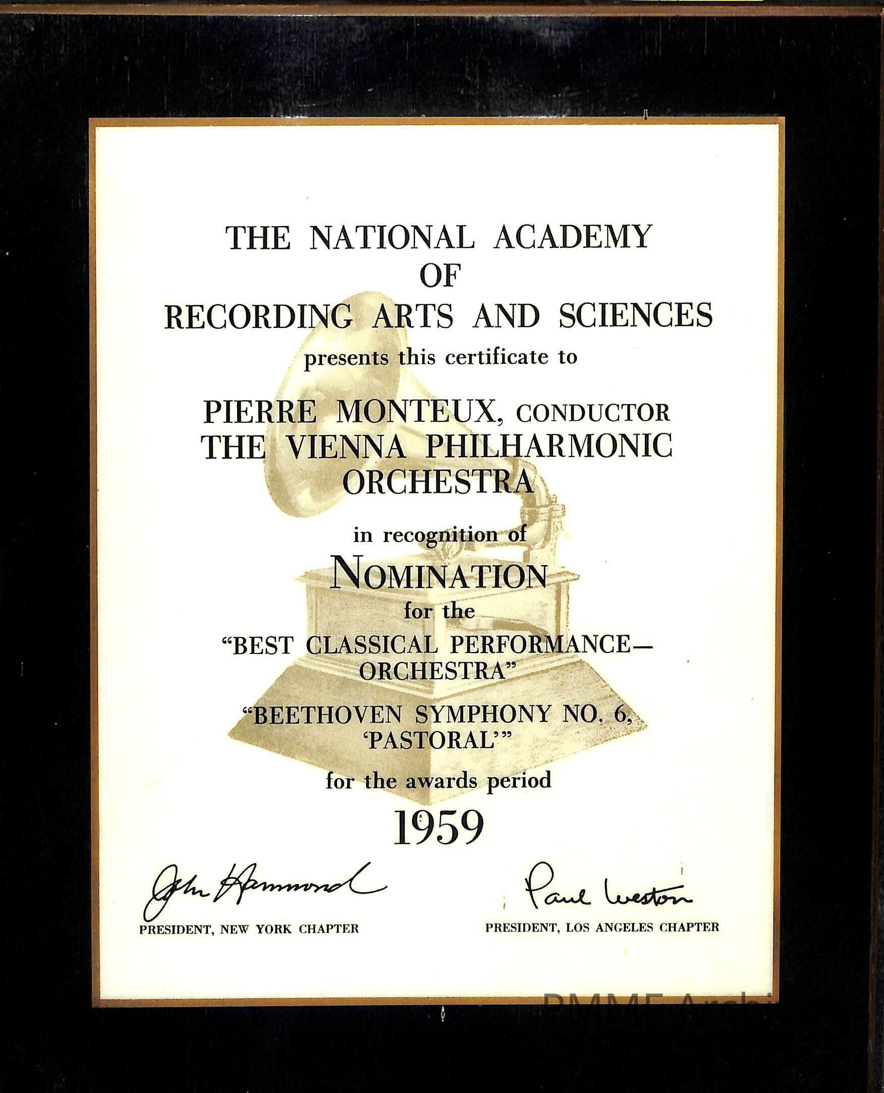 The National Academy of Recording Arts and Sciences presents this certificate to The Vienna Philharmonic Orchestra, Pierre Monteux conducting, in recognition of Nomination for the best classical performance - orchestral -