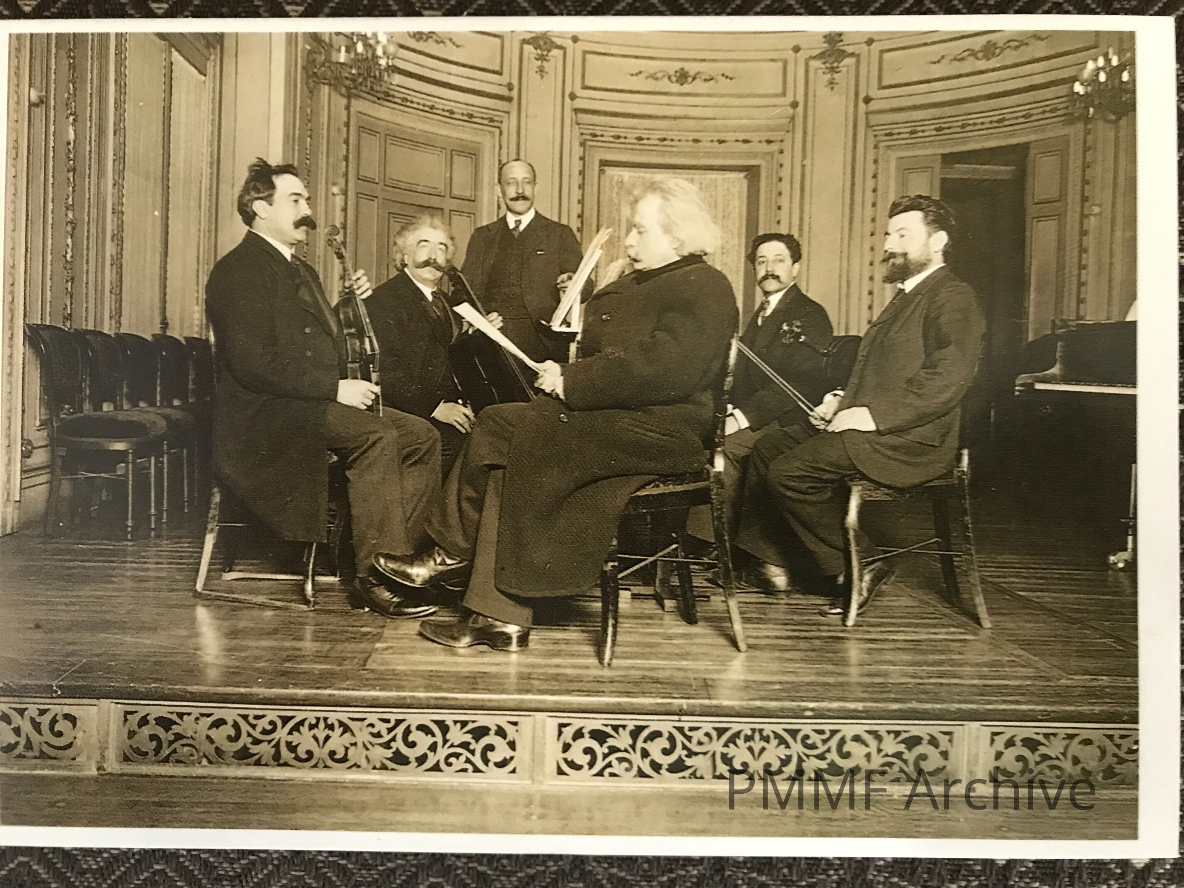 Edvard Grieg and, from left to right, Johannes Wolff, Joseph Hollman, Gustave Lijon, Pierre Monteux and Andre Dulaurons. Photograph circa 1900.