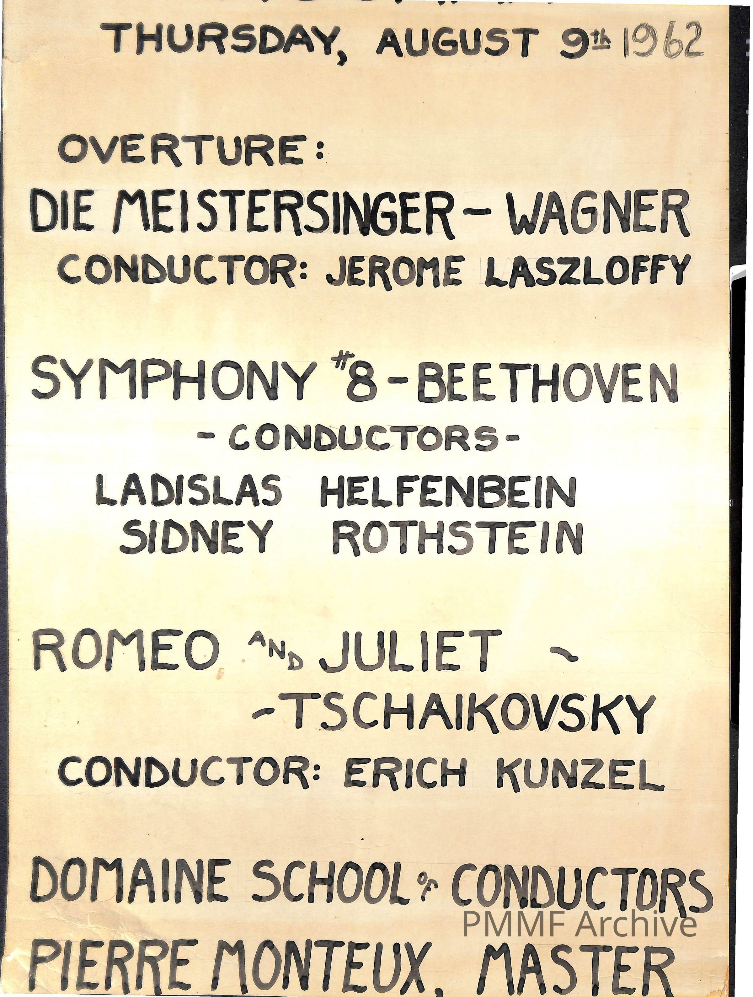 Hand-lettered program on poster board of August 9, 1962 Program for Domaine School of Conductors; Erich Kunzel, Jerome Laszloffy, Ladislas Helfenbein, and Sidney Rothstein, conducting; Pierre Monteux, Master.Artwork Details