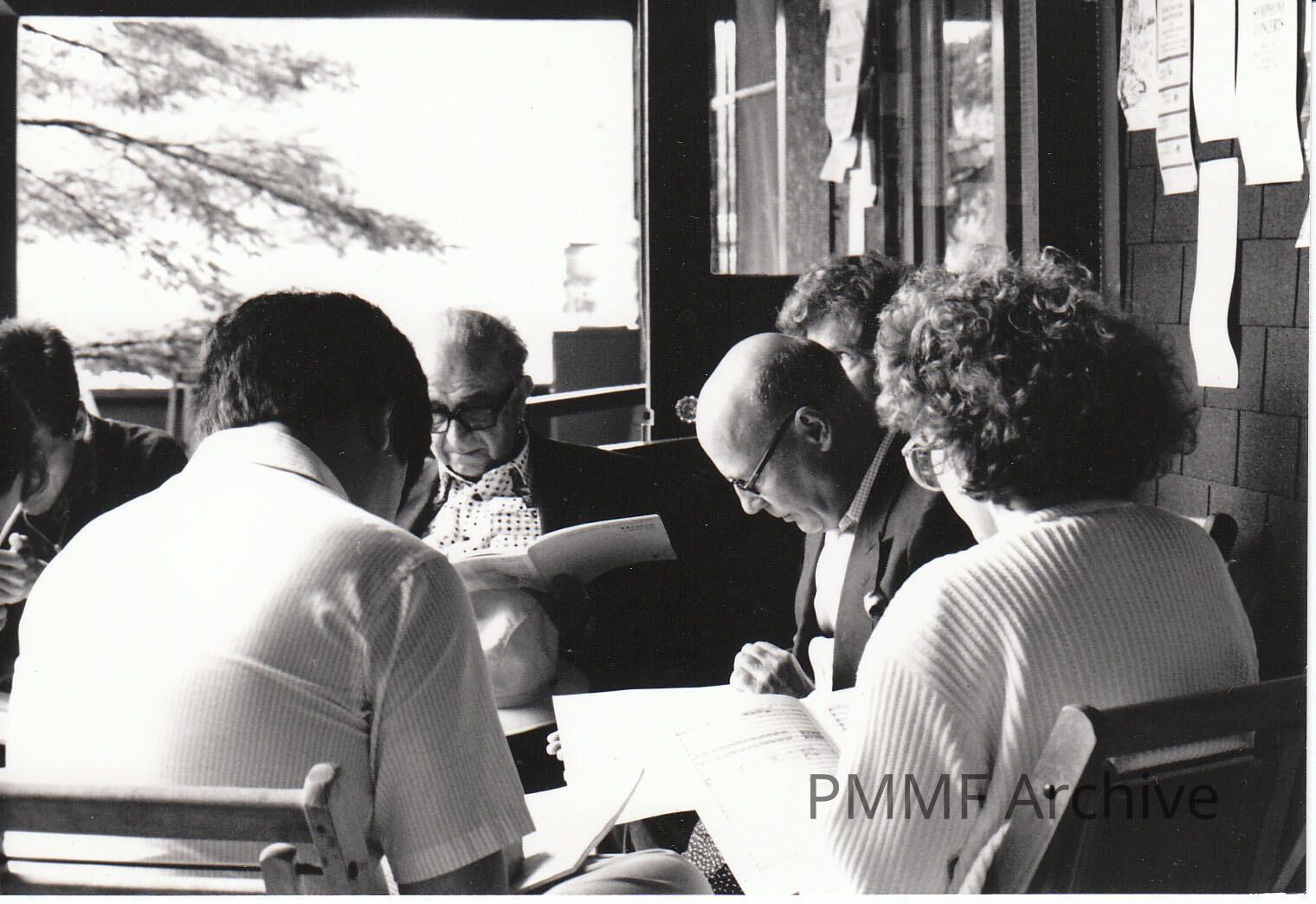 Score study with composer in residence, Hans Werner Henze, on porch of Forest Studio. Meistro Bruck, center; Henze right center; Maureen McNalley Giroux, student, back to.Collection