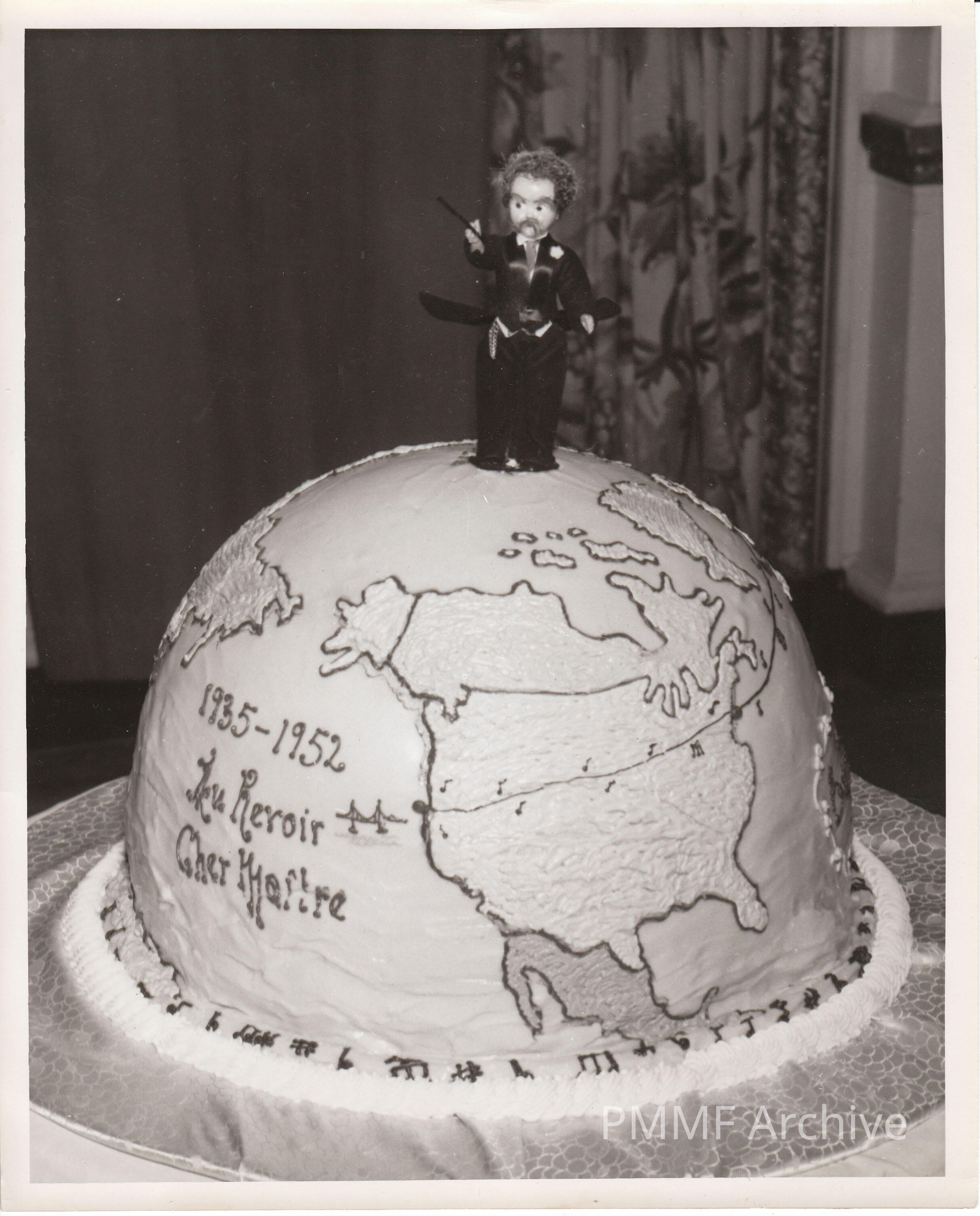 AT EVENT MARKING MONTEUX'S FAREWELL BY THE SAN FRANCISCO SYMPHONY; SALUTATION ON CAKE READS, "1935-1952, AU REVOIR CHER MAÎTRE"; NOTE DECORATION OF MONTEUX CONDUCTING ON TOP OF CAKE.Collection