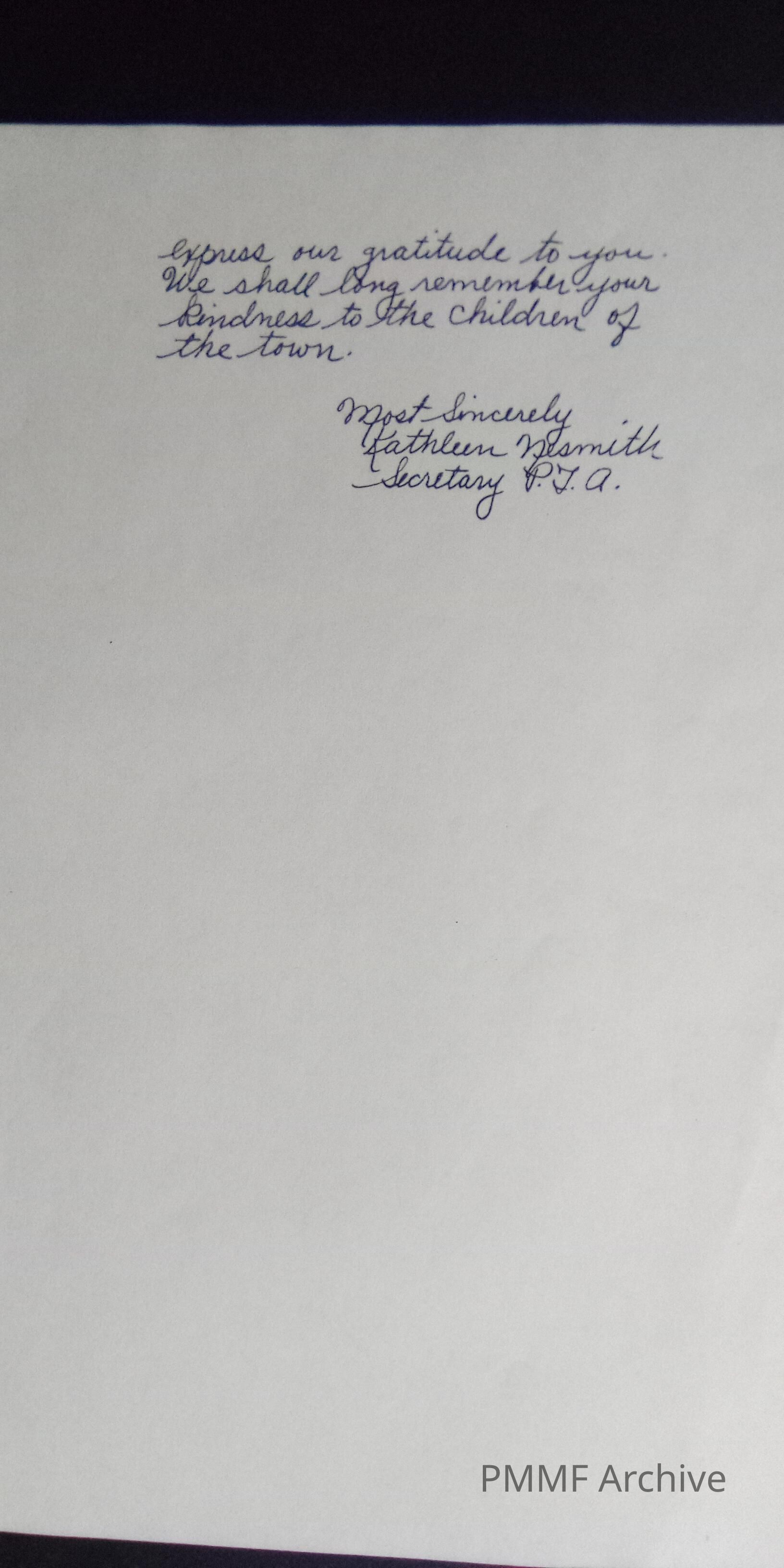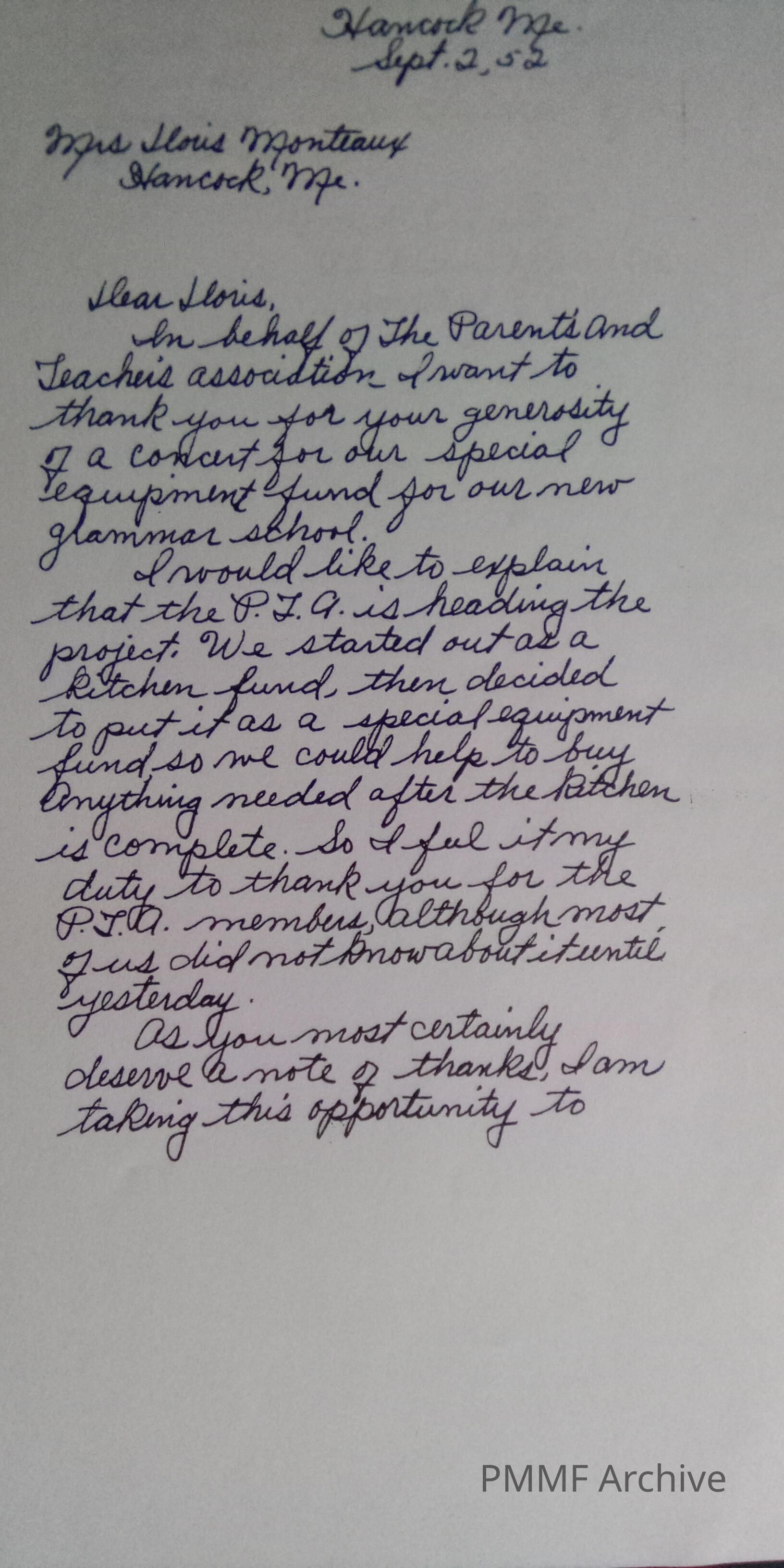 PTA thank you letter to Doris for a concert on behalf of special equipment fund for new grammar school in Hancock (1952)