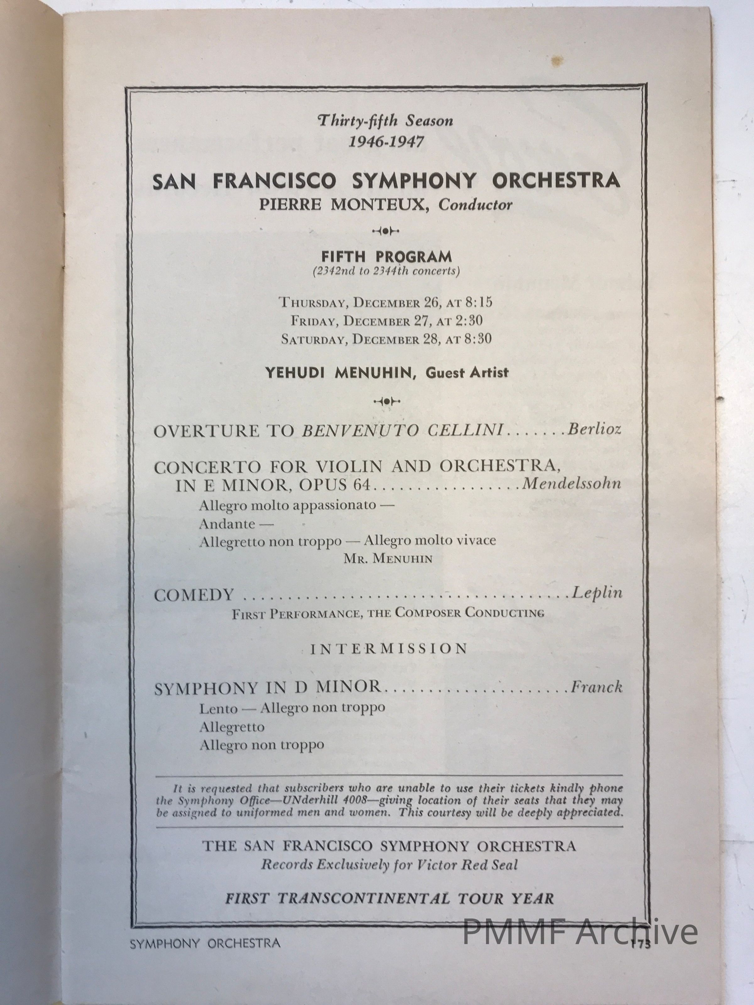San Francisco Symphony Orchestra, Pierre Monteux conductor: 1946–1947 season – fifth program