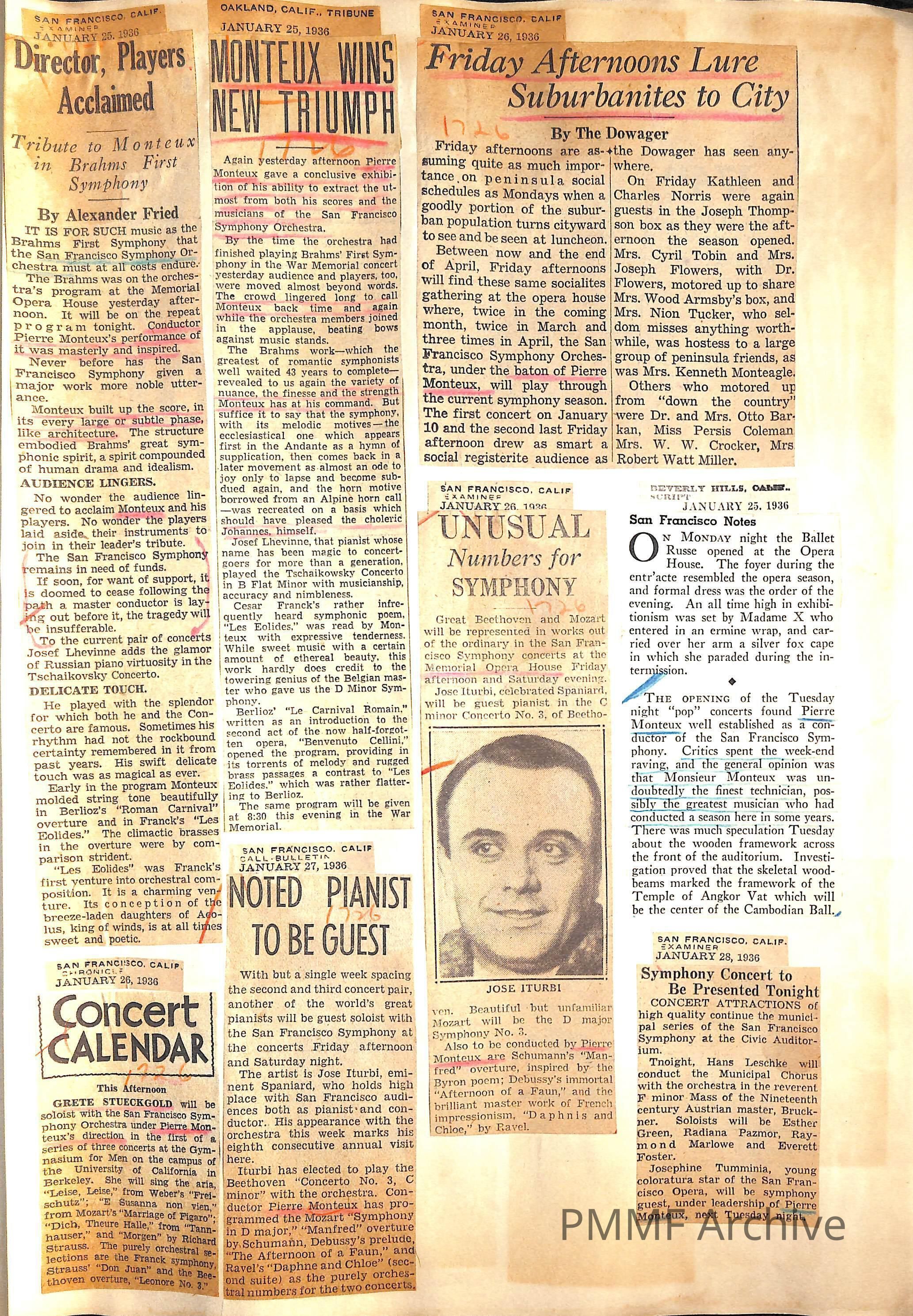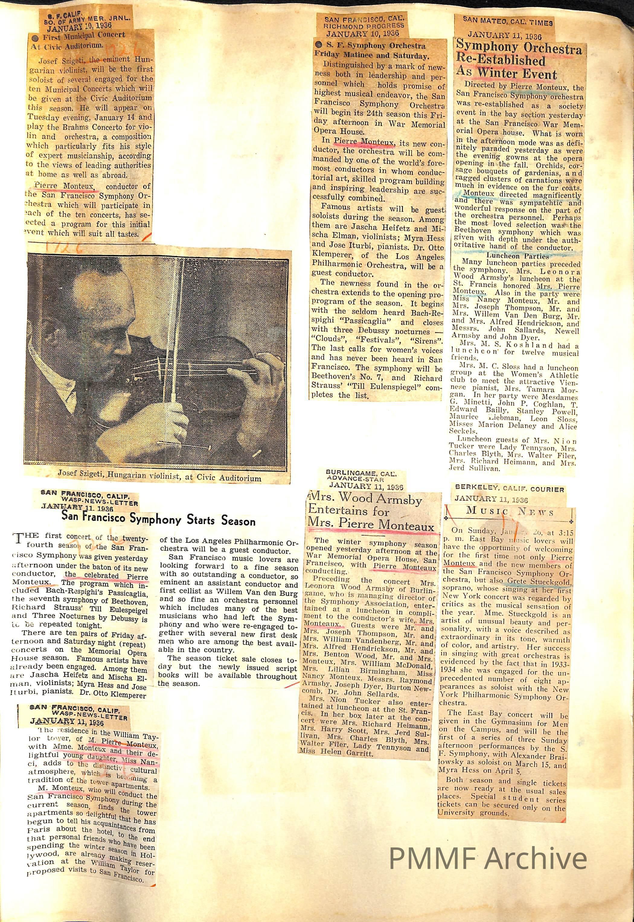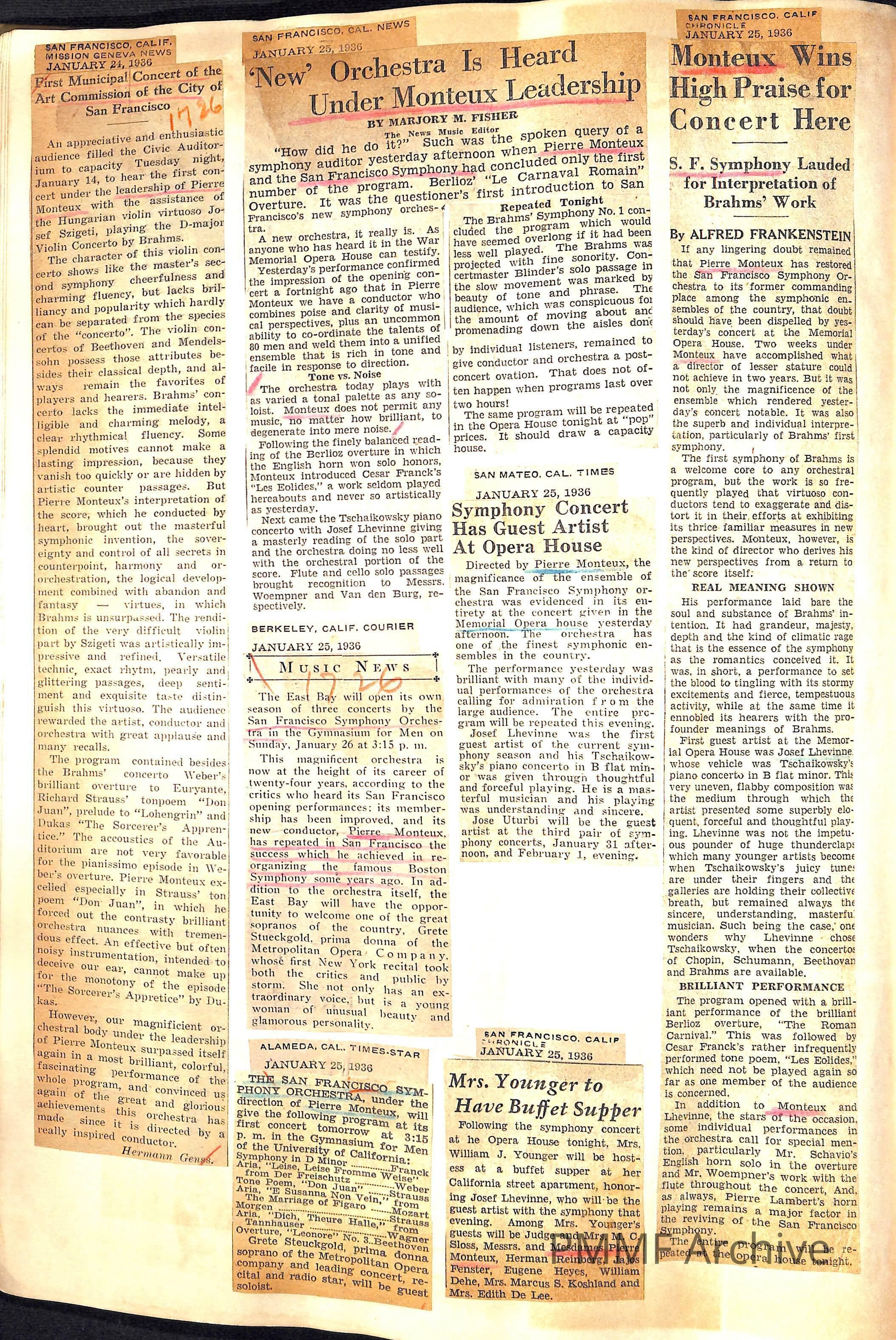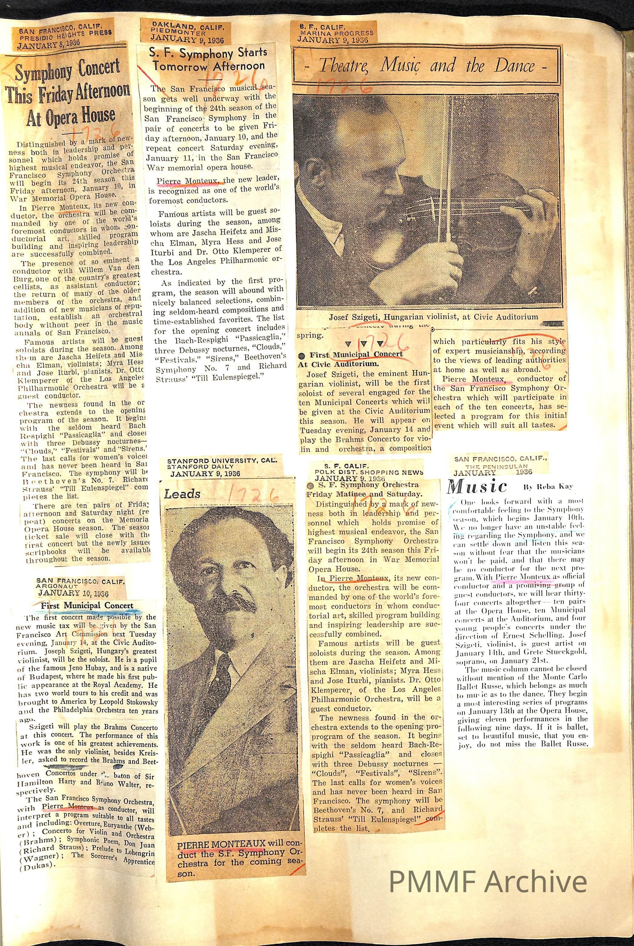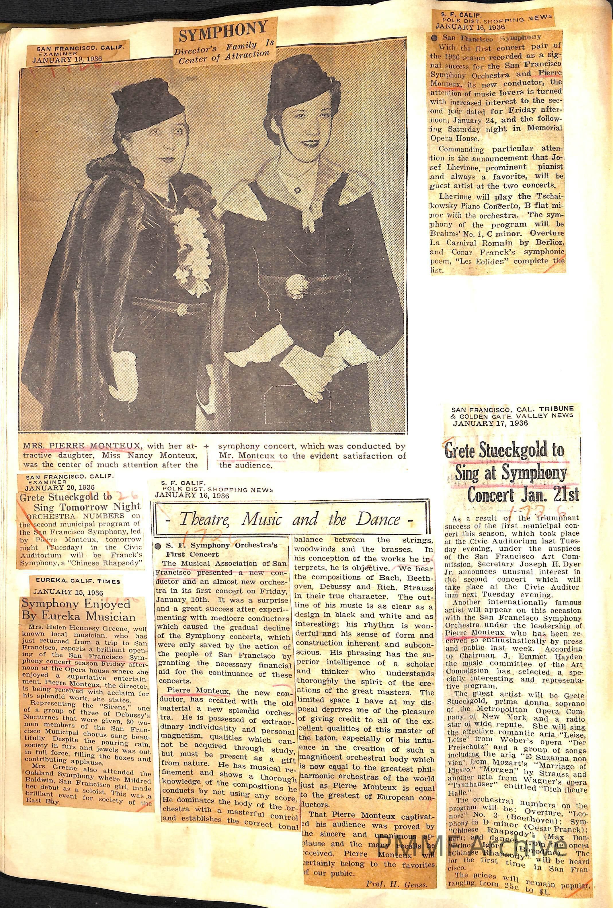 Scrapbook created by Doris Monteux of newspaper articles from 1935-1936 related to the first year of Monteux conducting the San Francisco Symphony Orchestra.