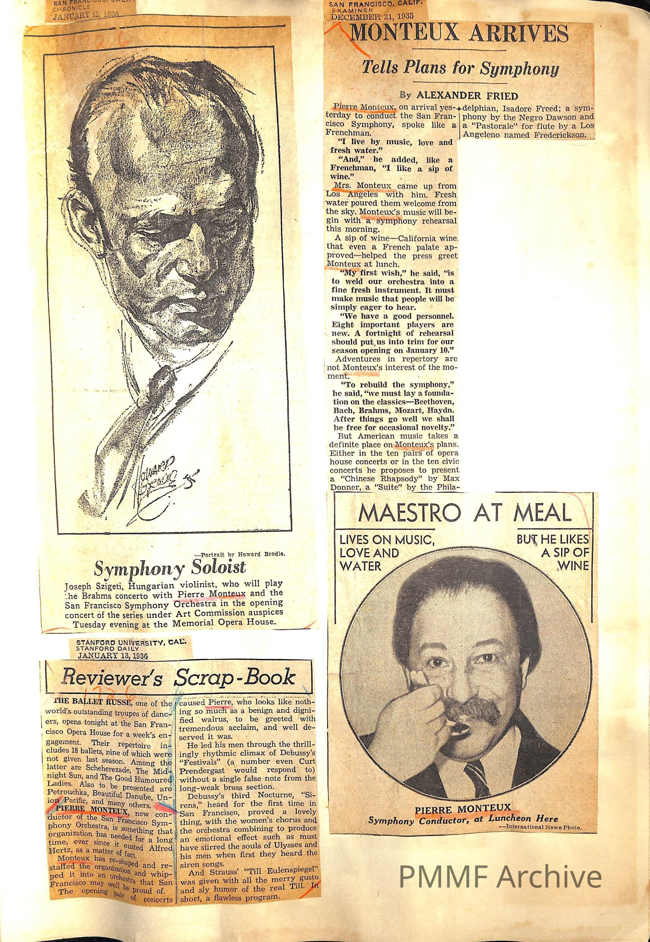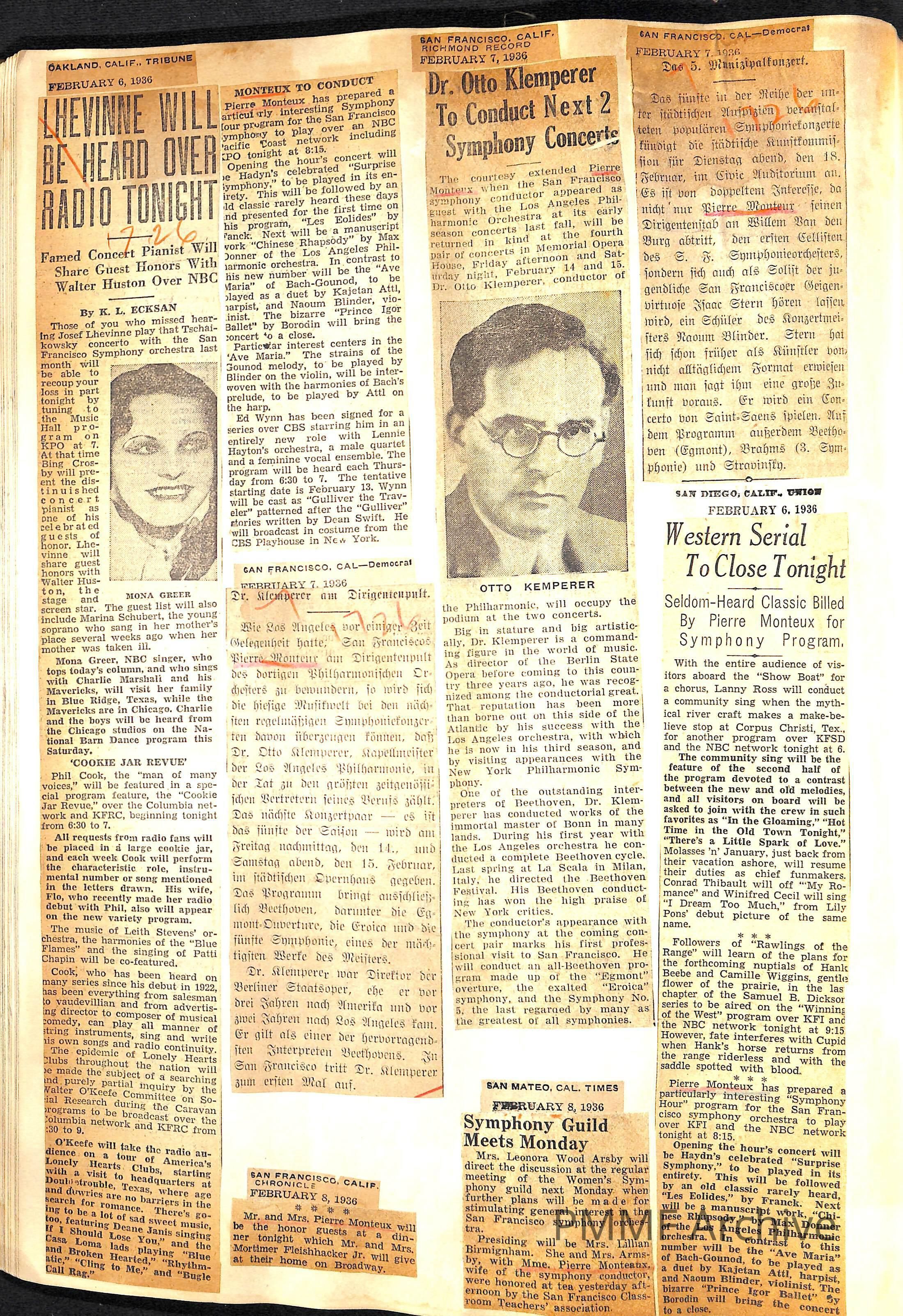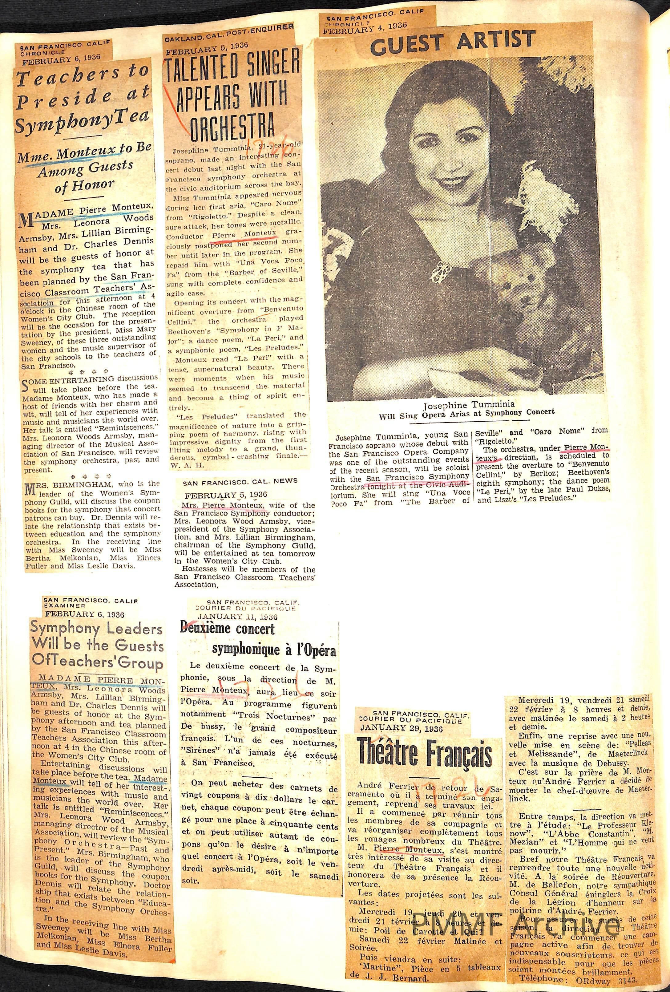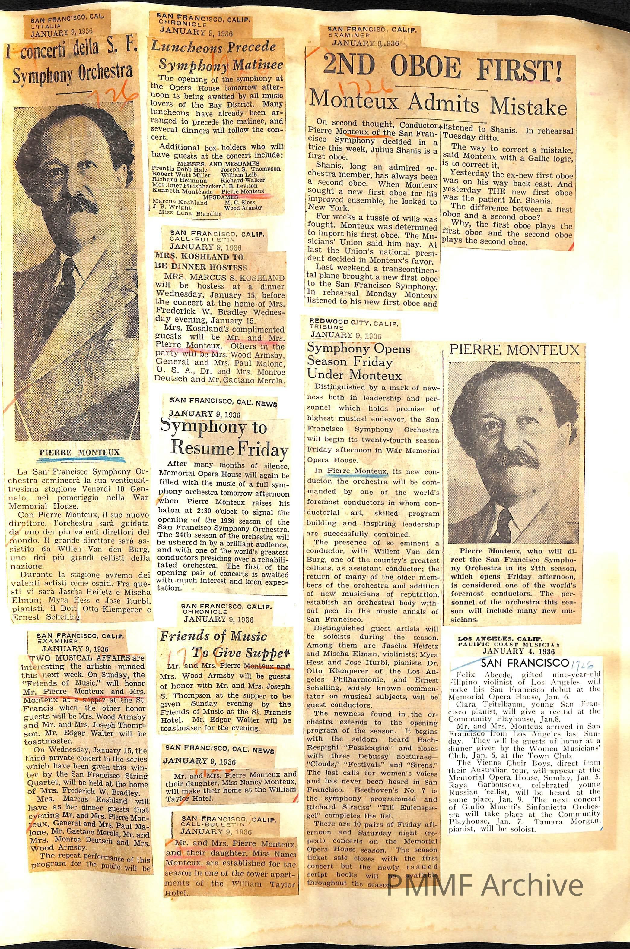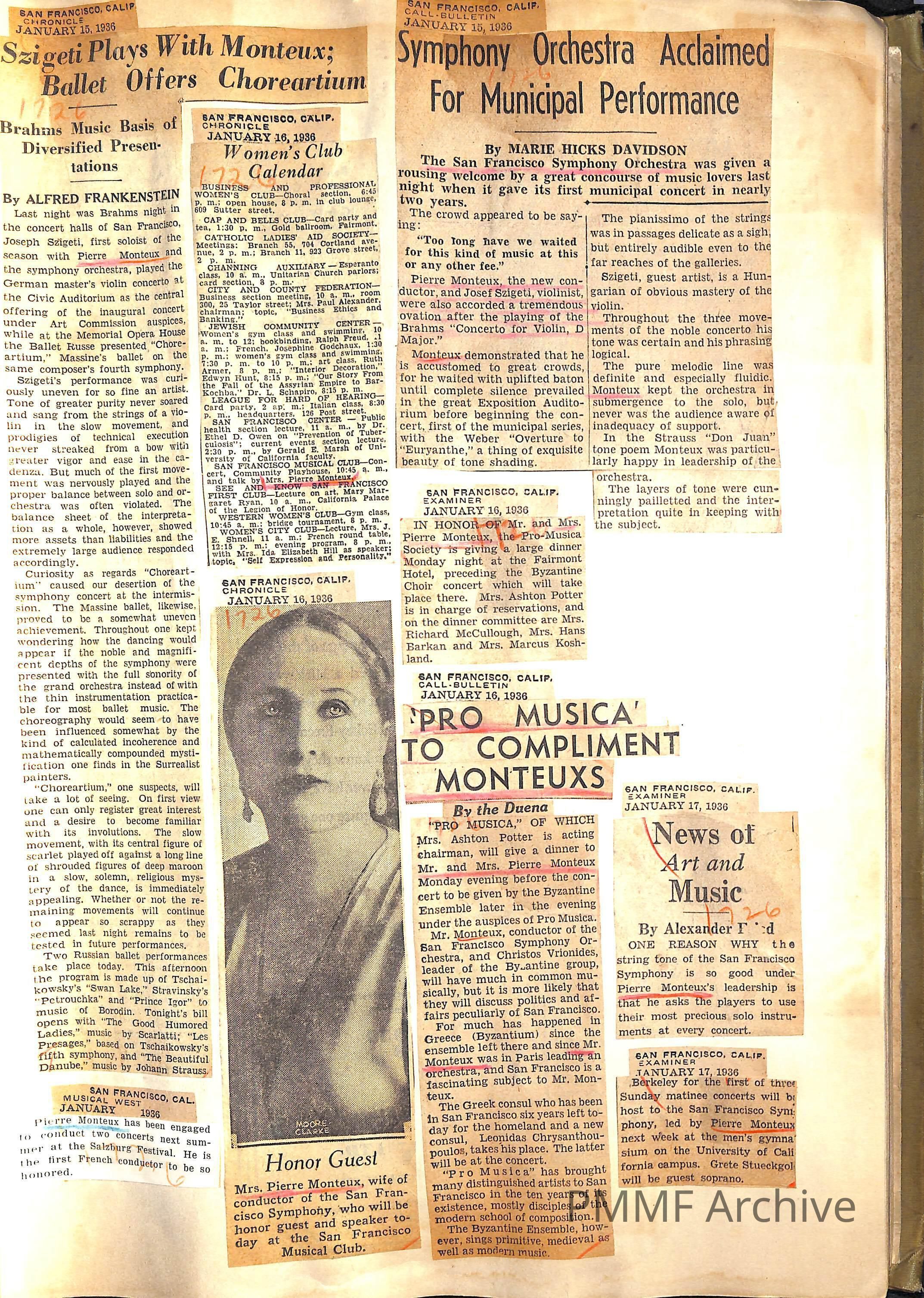 Scrapbook created by Doris Monteux of newspaper articles from 1935-1936 related to the first year of Monteux conducting the San Francisco Symphony Orchestra.