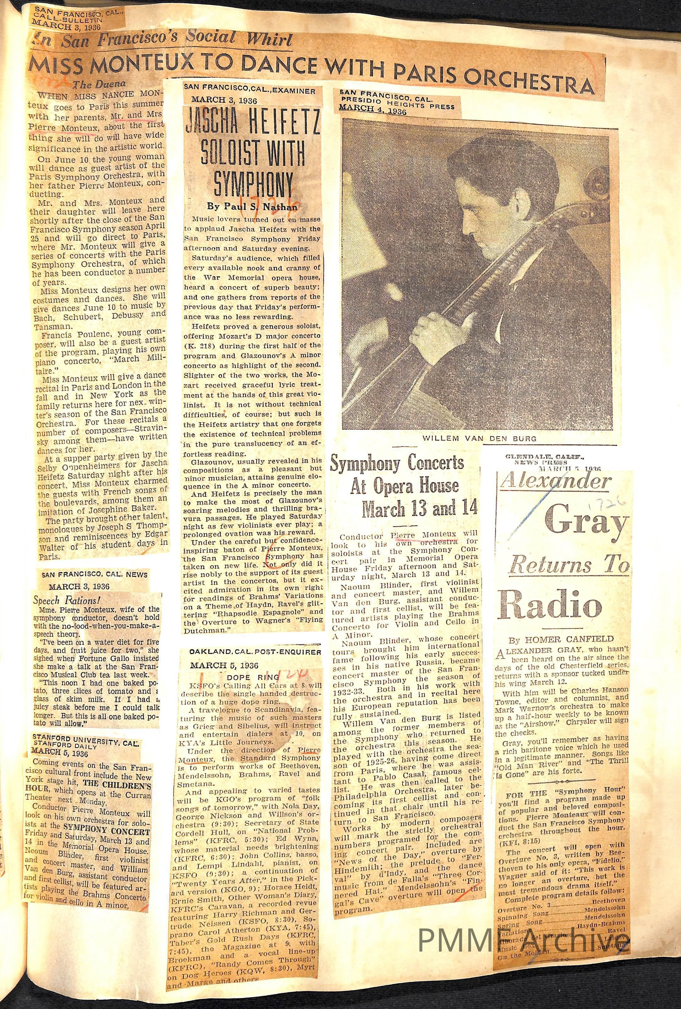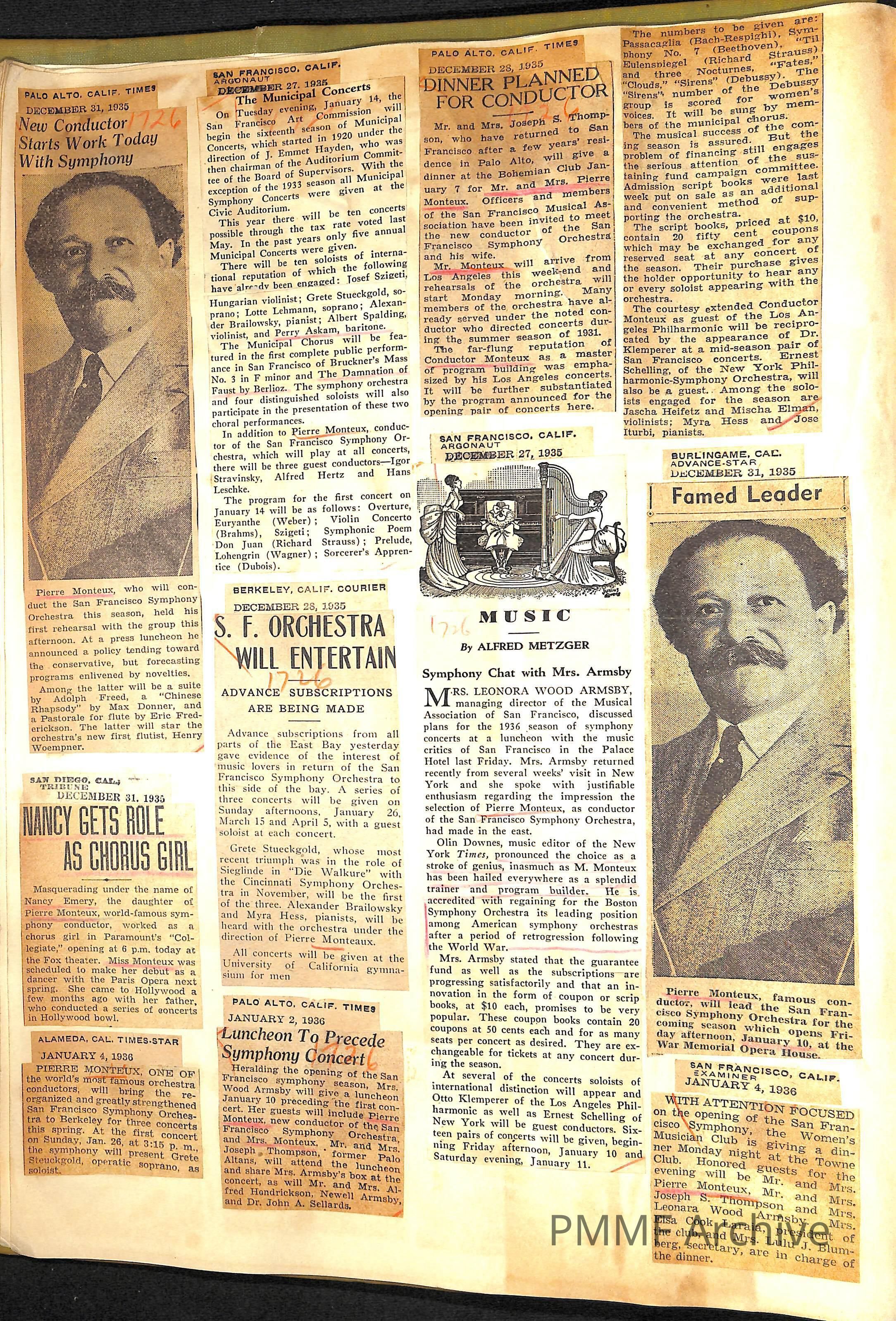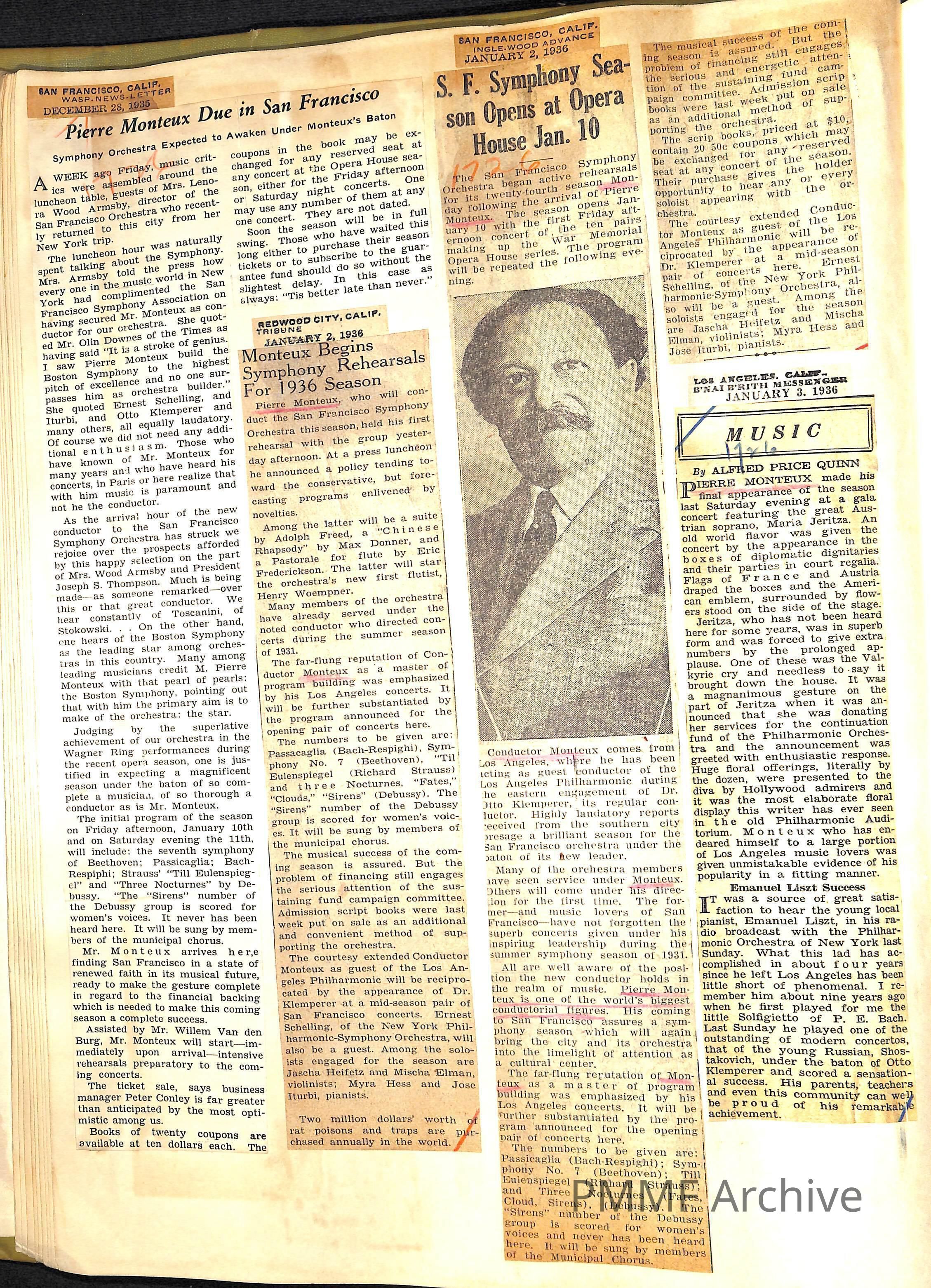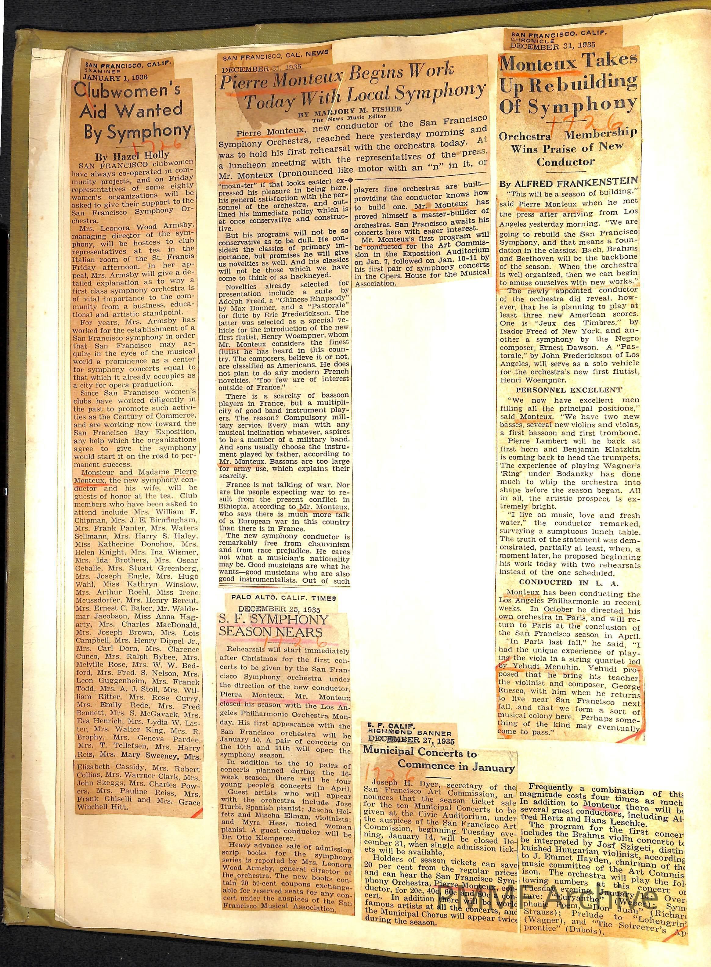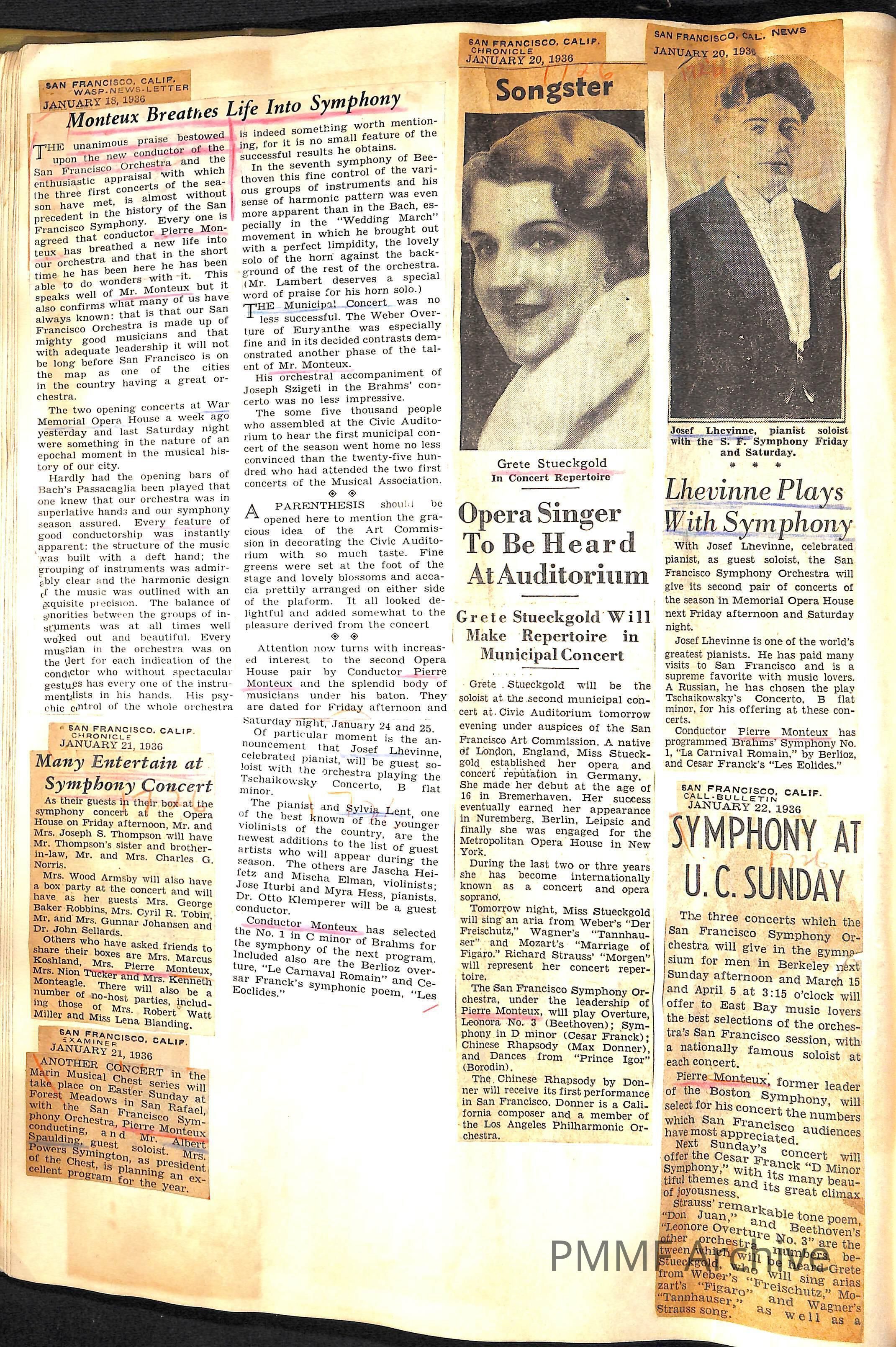 Scrapbook created by Doris Monteux of newspaper articles from 1935-1936 related to the first year of Monteux conducting the San Francisco Symphony Orchestra.
