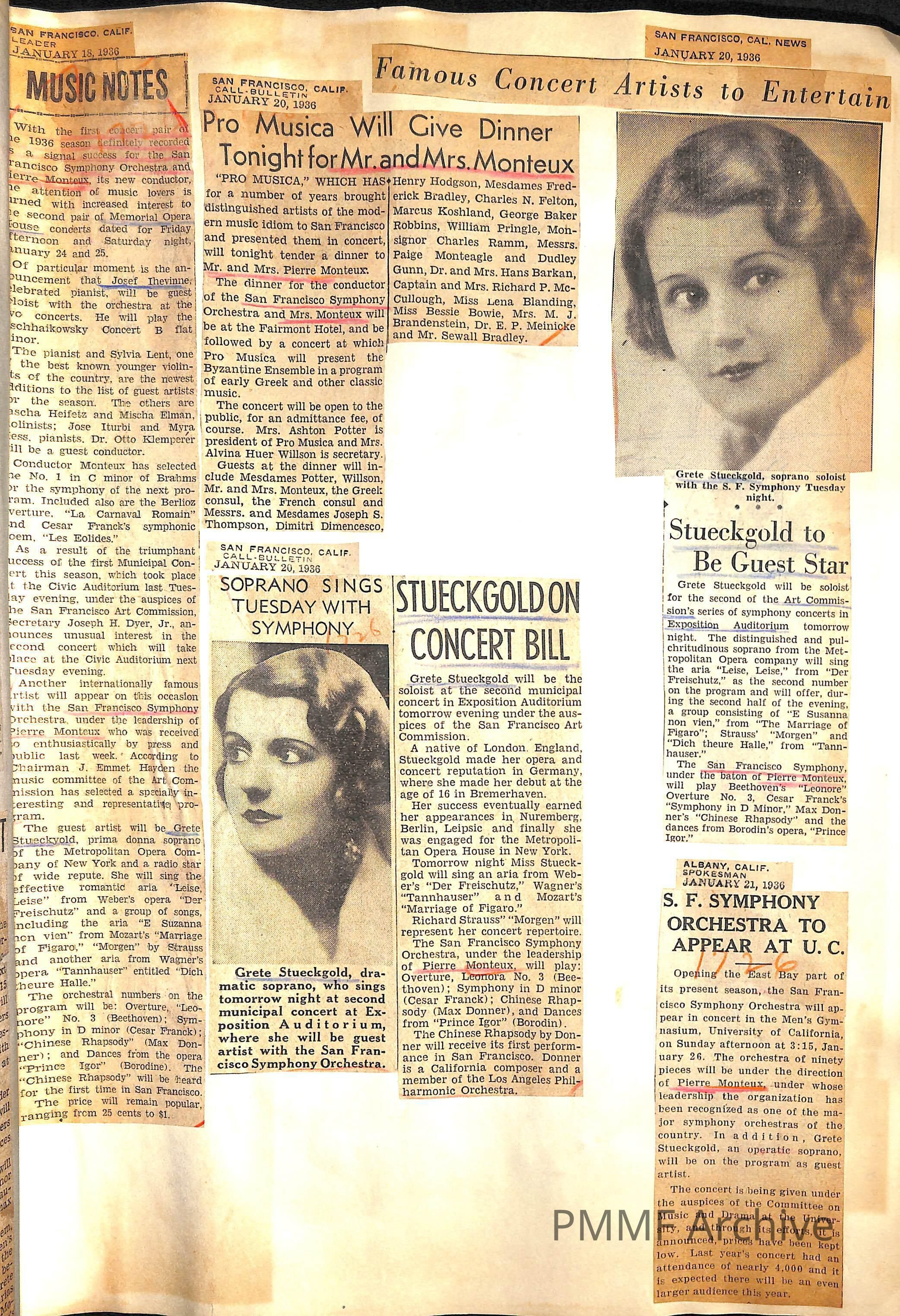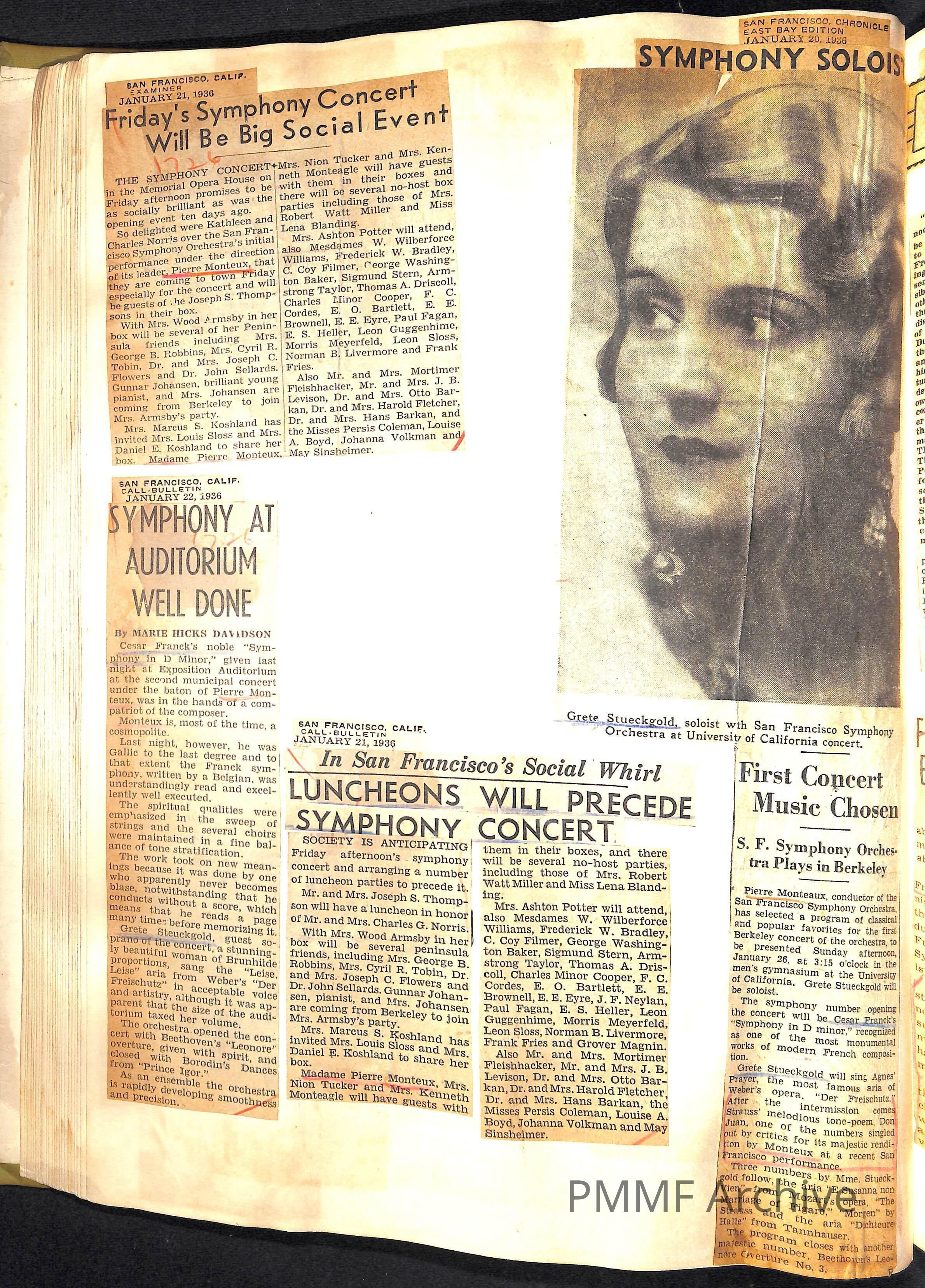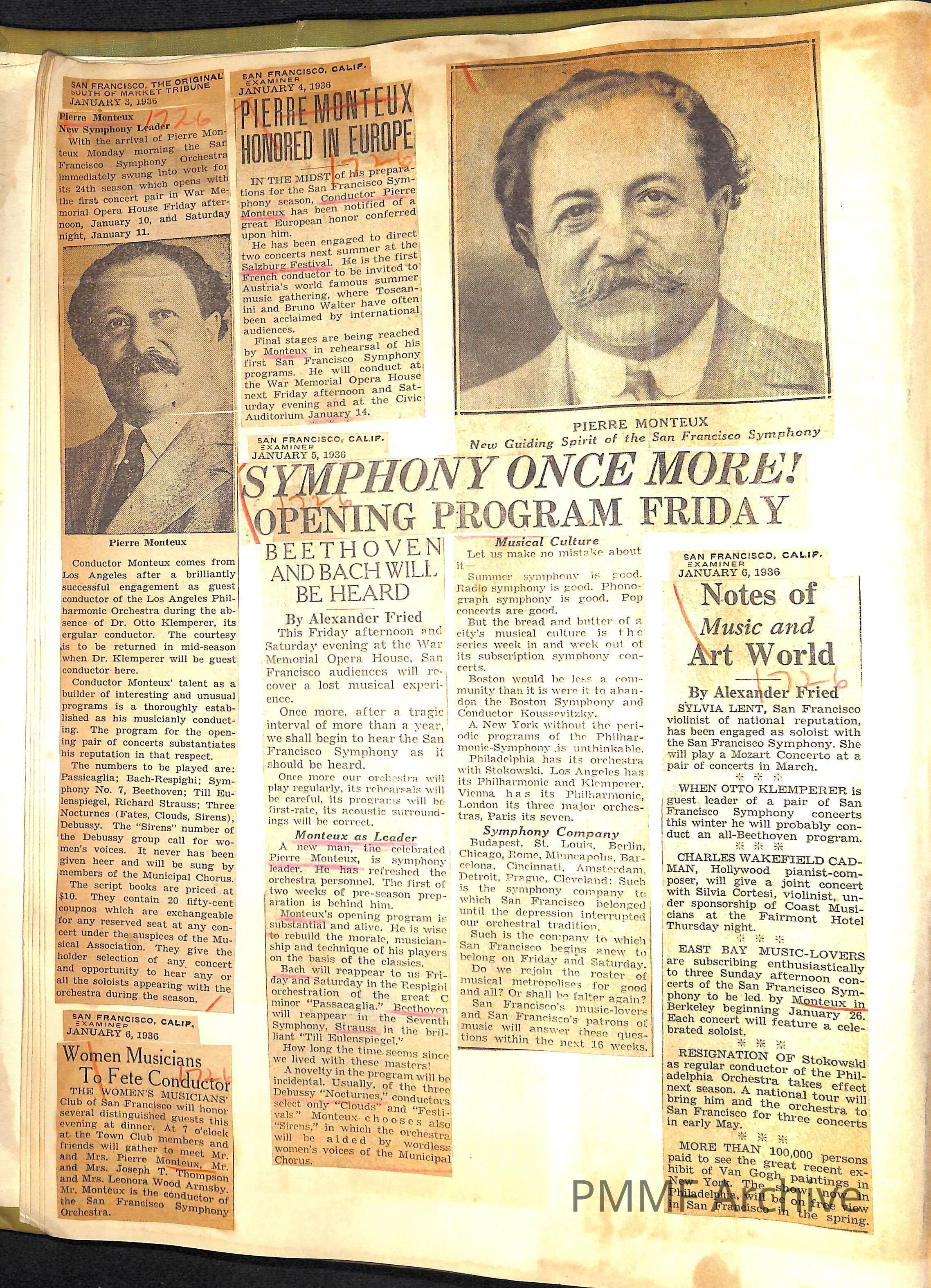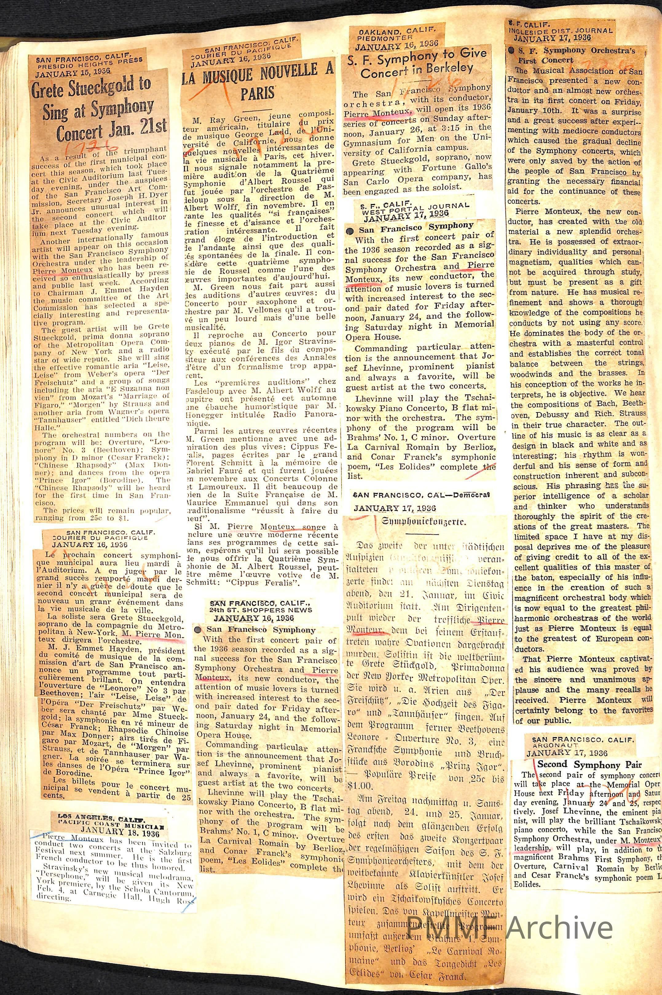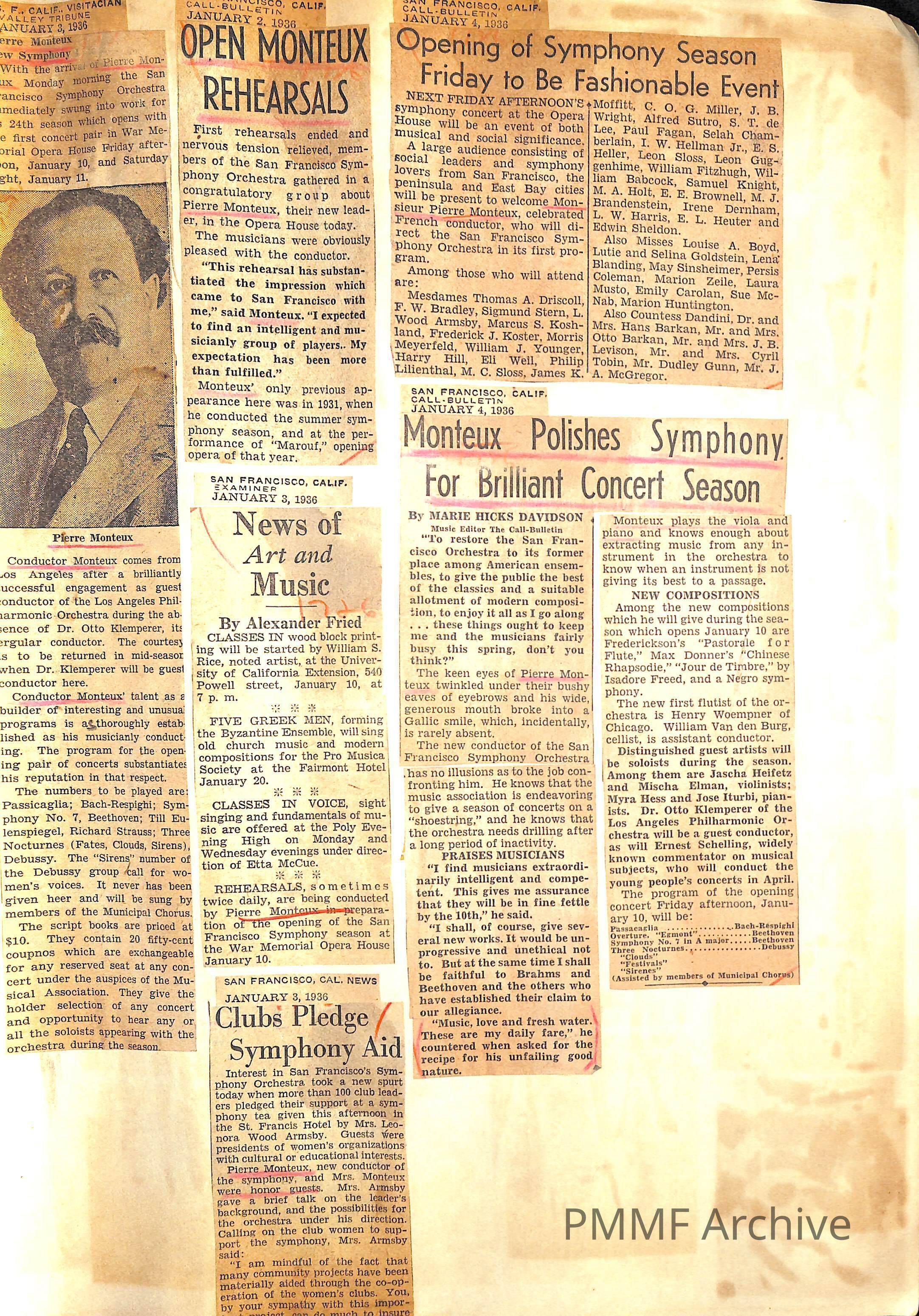 Scrapbook created by Doris Monteux of newspaper articles from 1935-1936 related to the first year of Monteux conducting the San Francisco Symphony Orchestra.