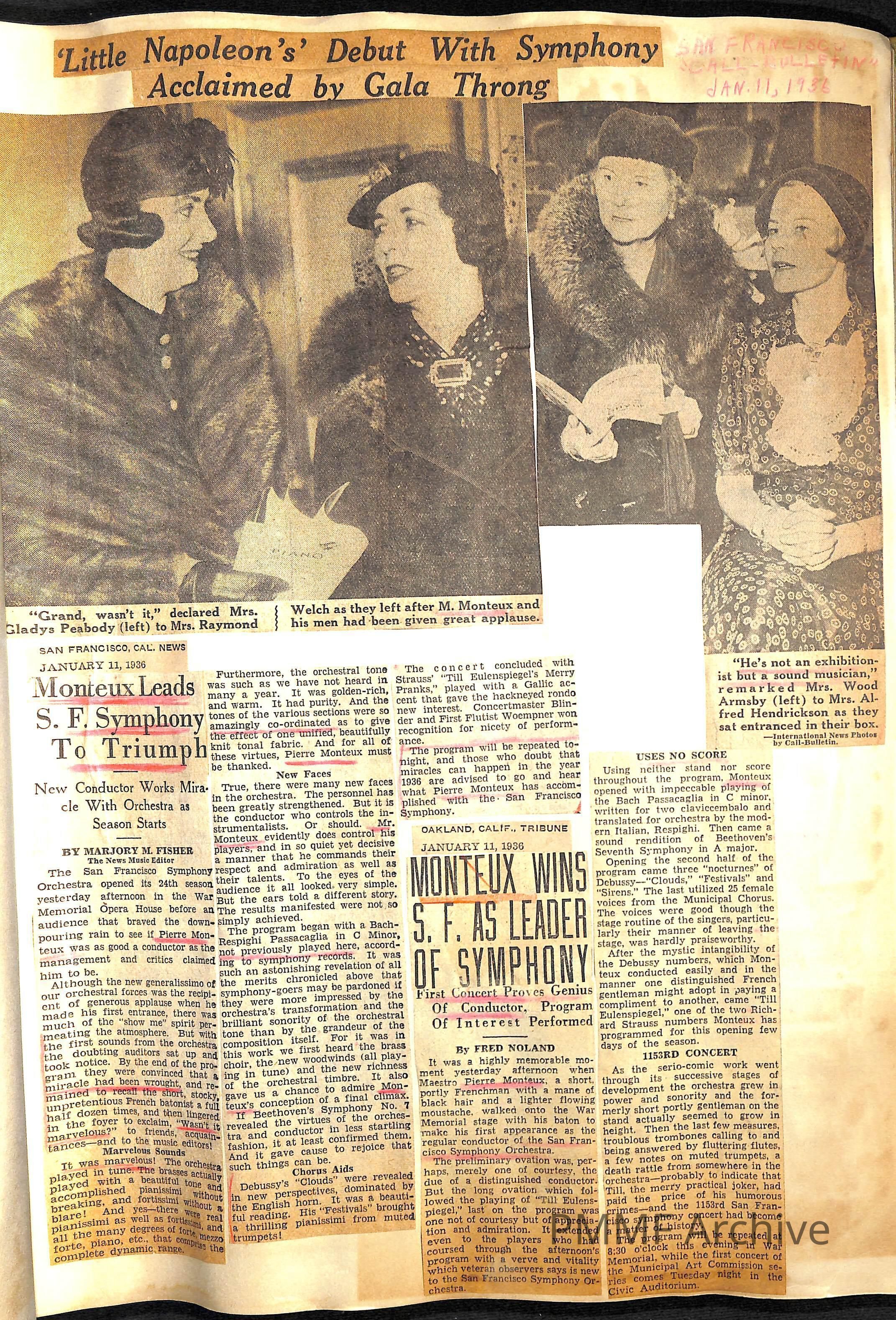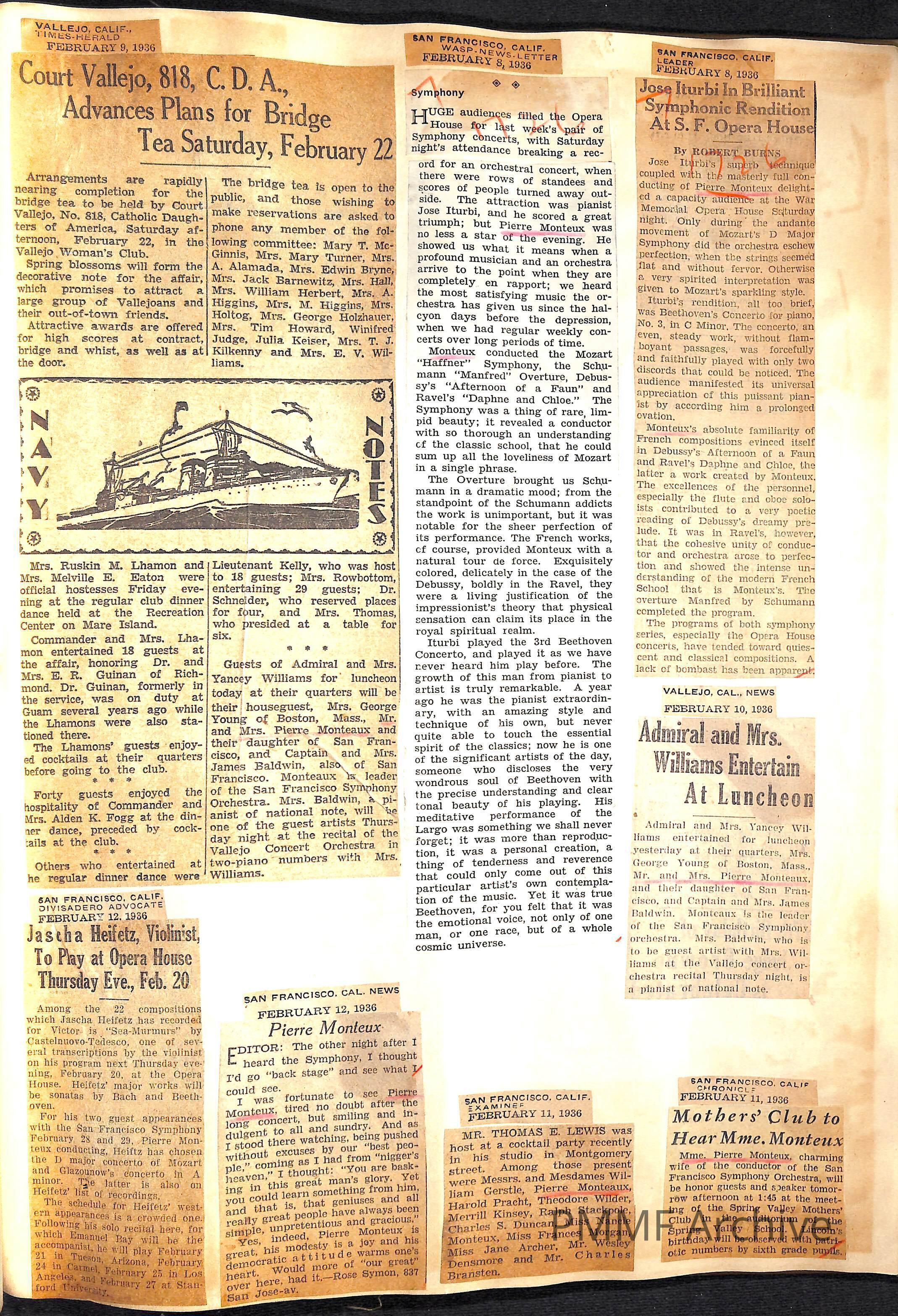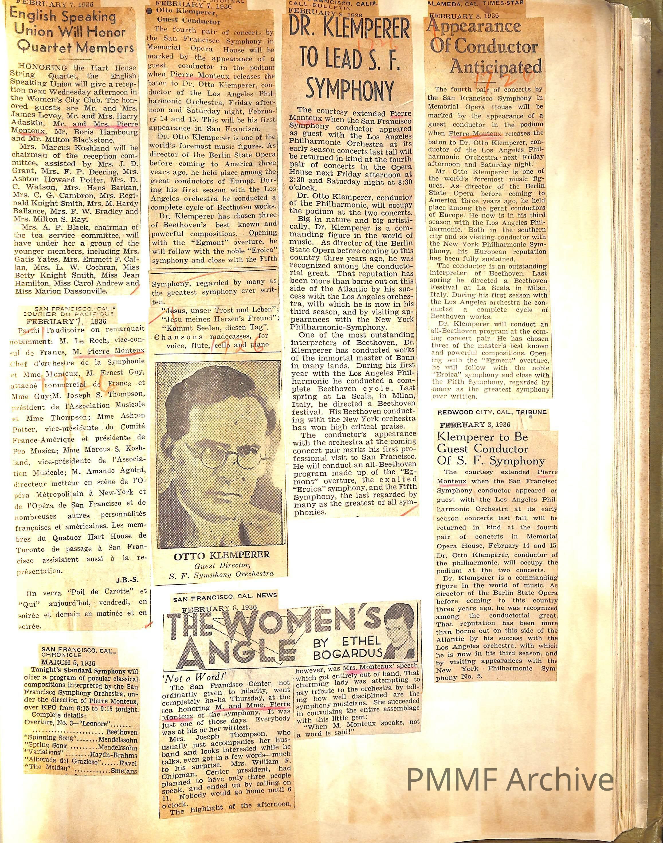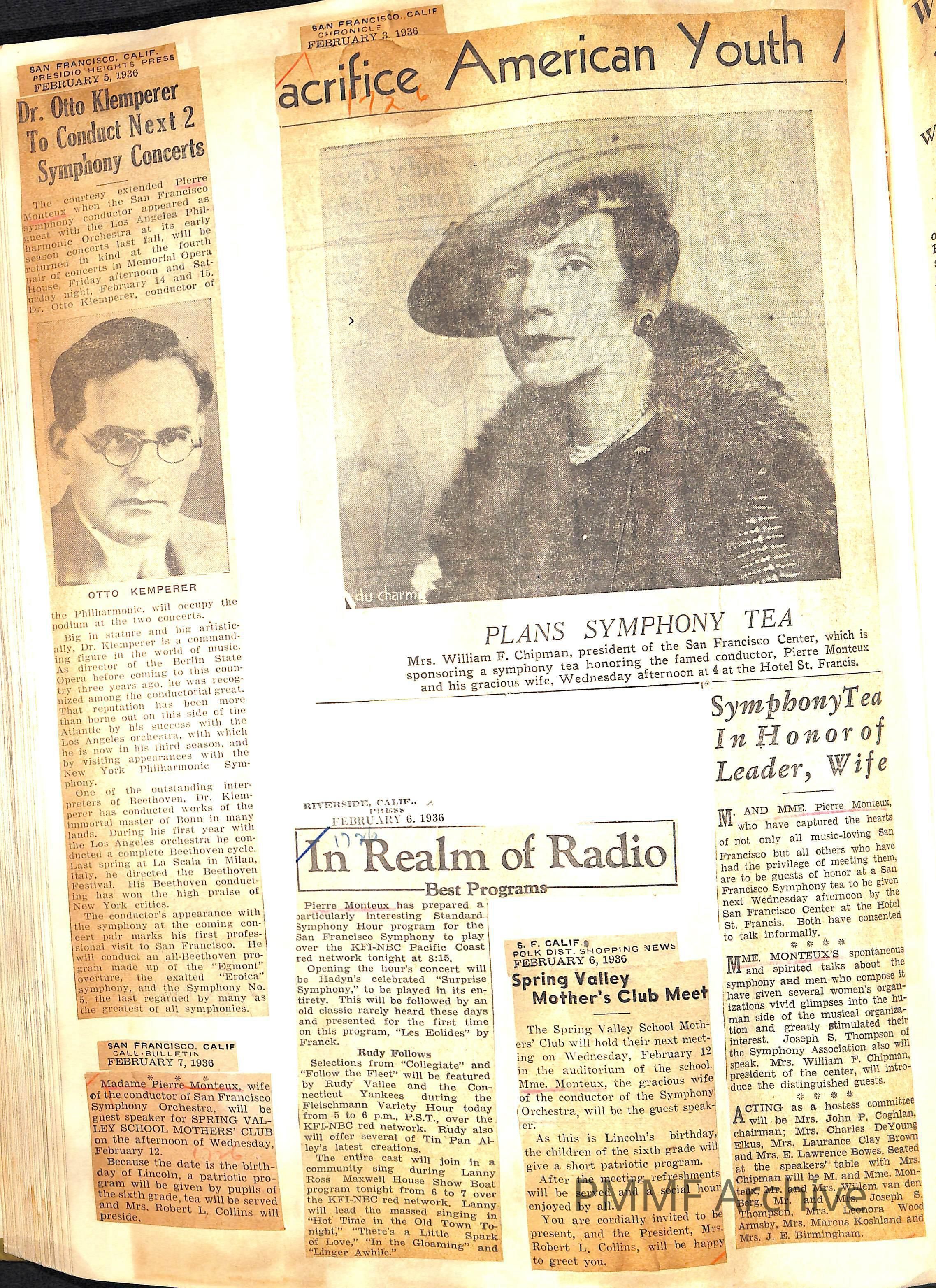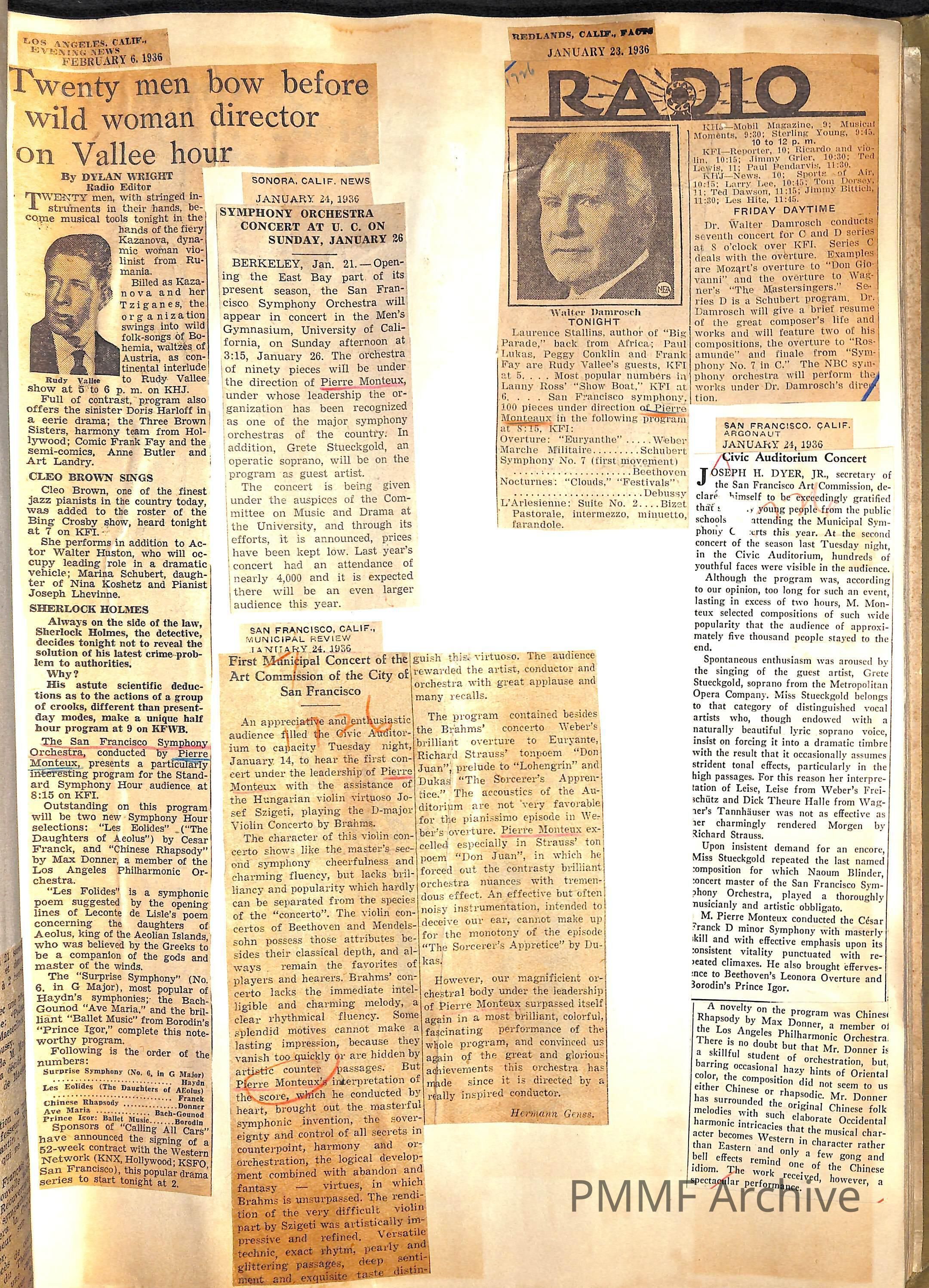 Scrapbook created by Doris Monteux of newspaper articles from 1935-1936 related to the first year of Monteux conducting the San Francisco Symphony Orchestra.