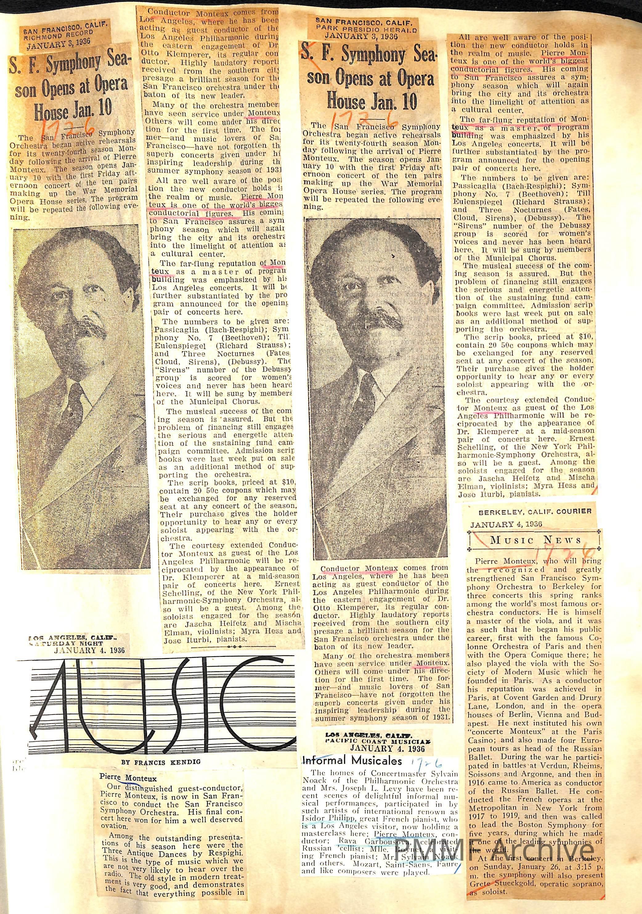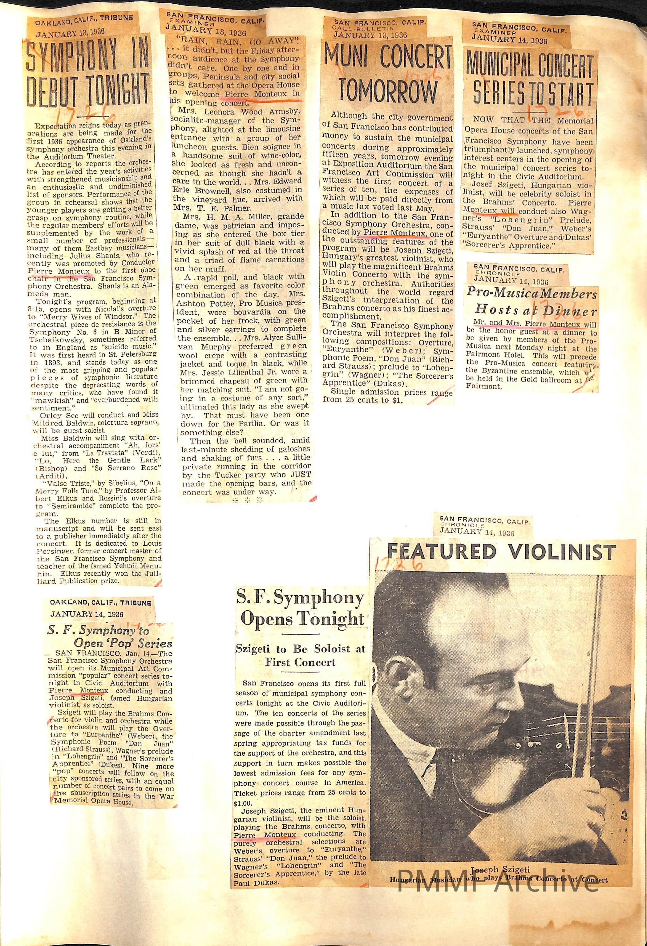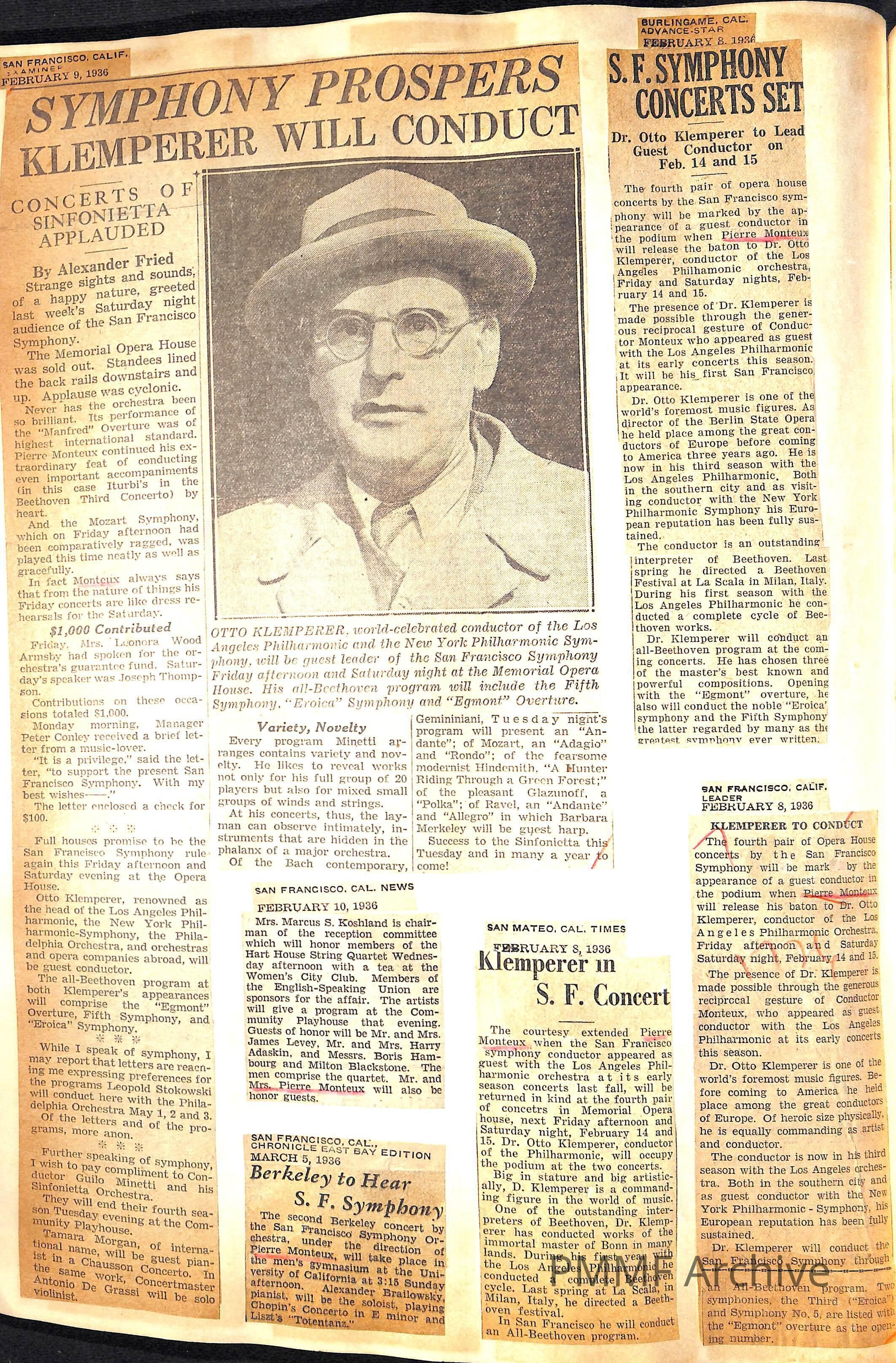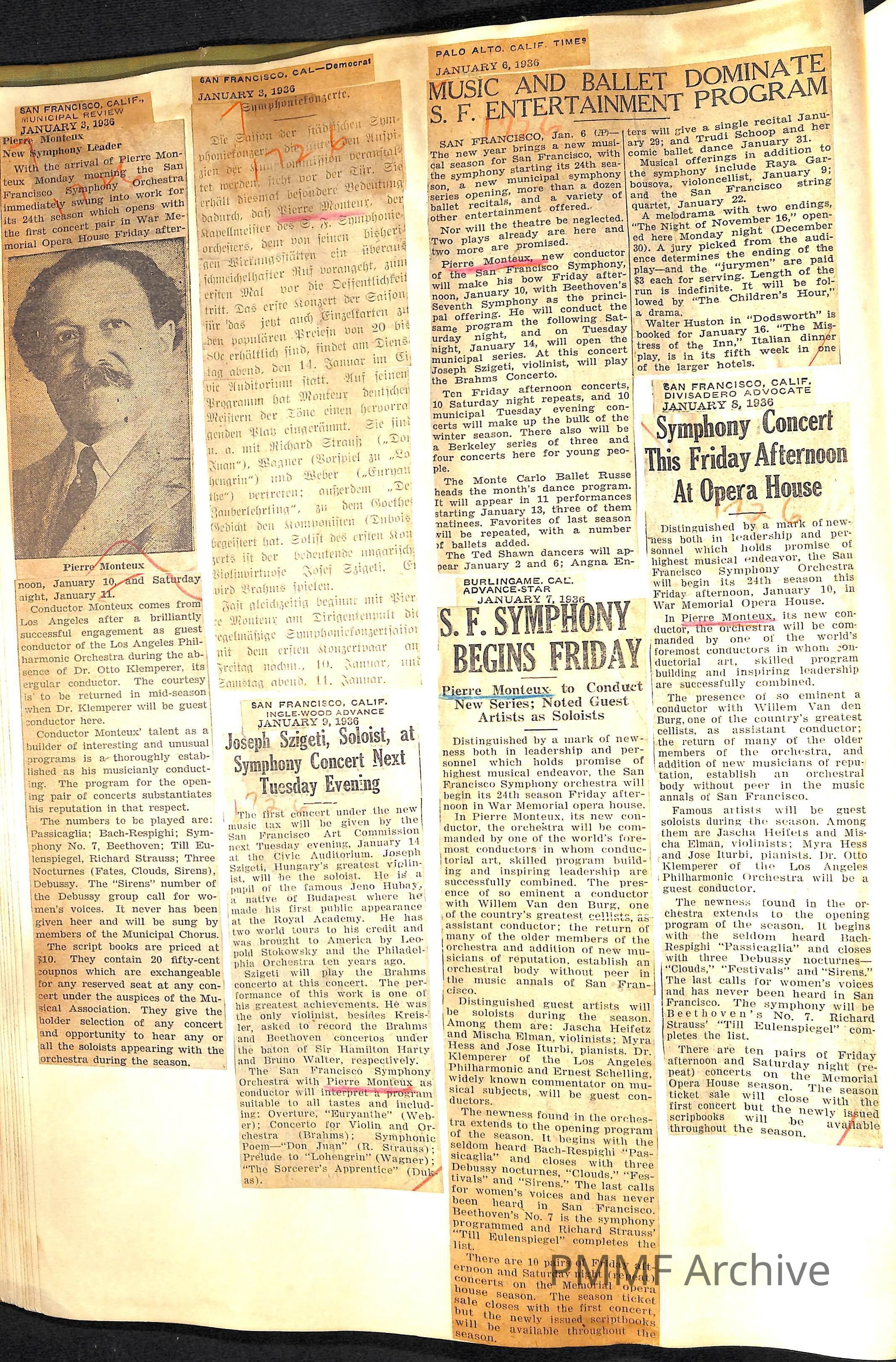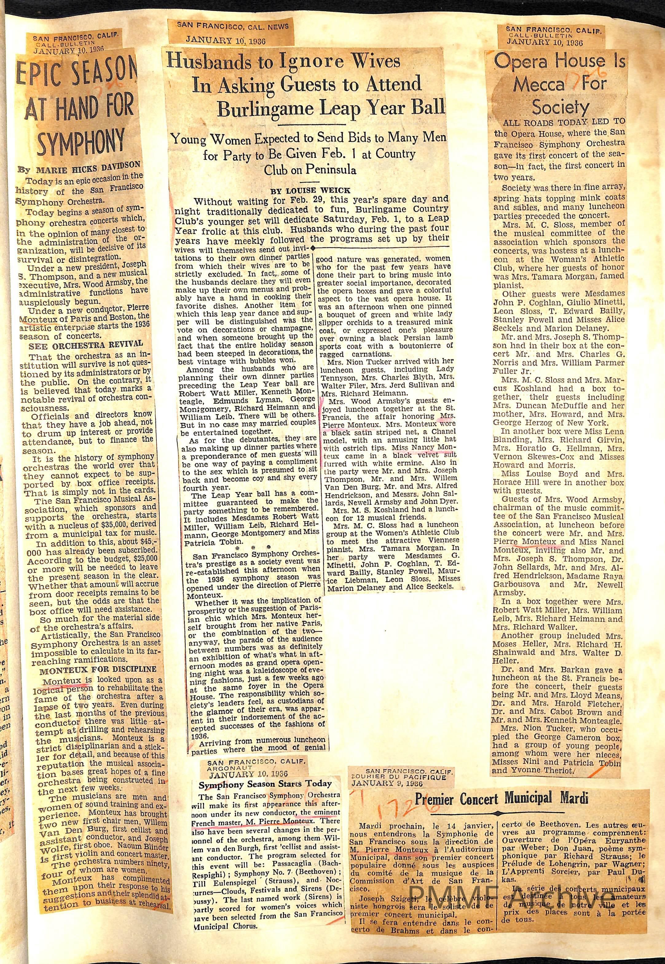 Scrapbook created by Doris Monteux of newspaper articles from 1935-1936 related to the first year of Monteux conducting the San Francisco Symphony Orchestra.