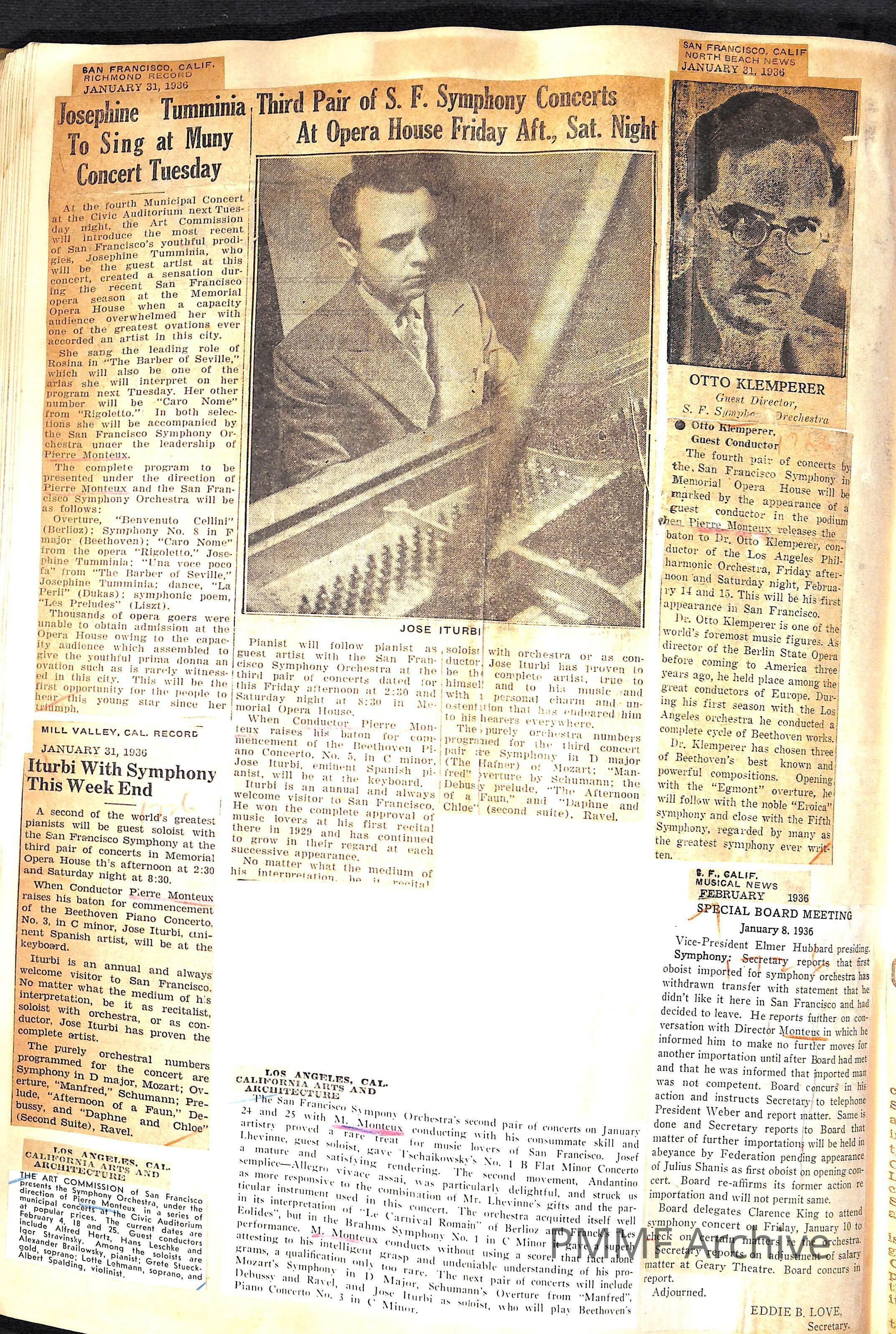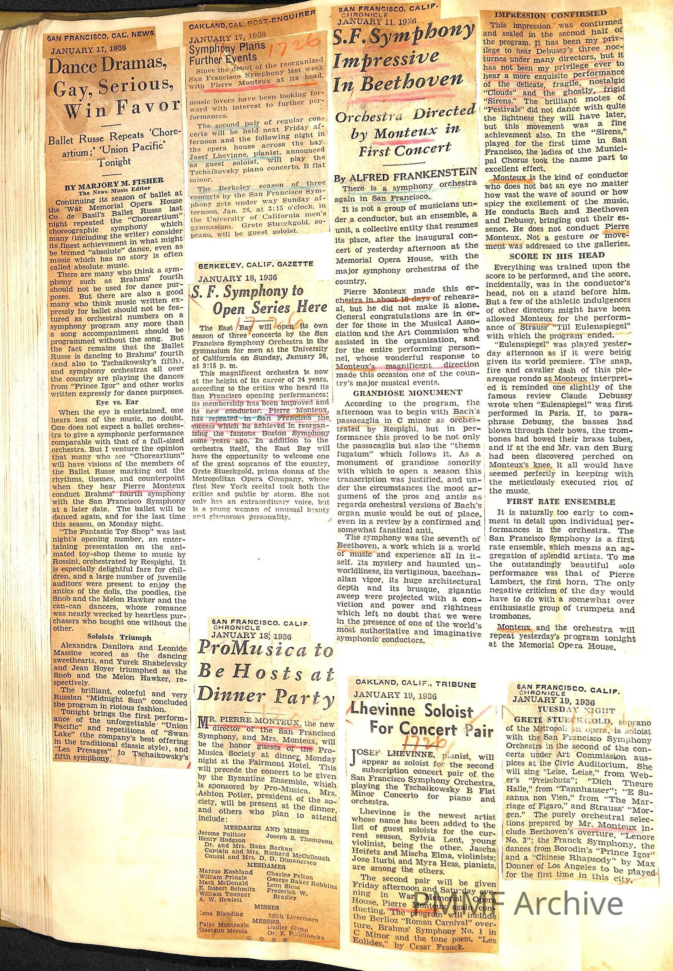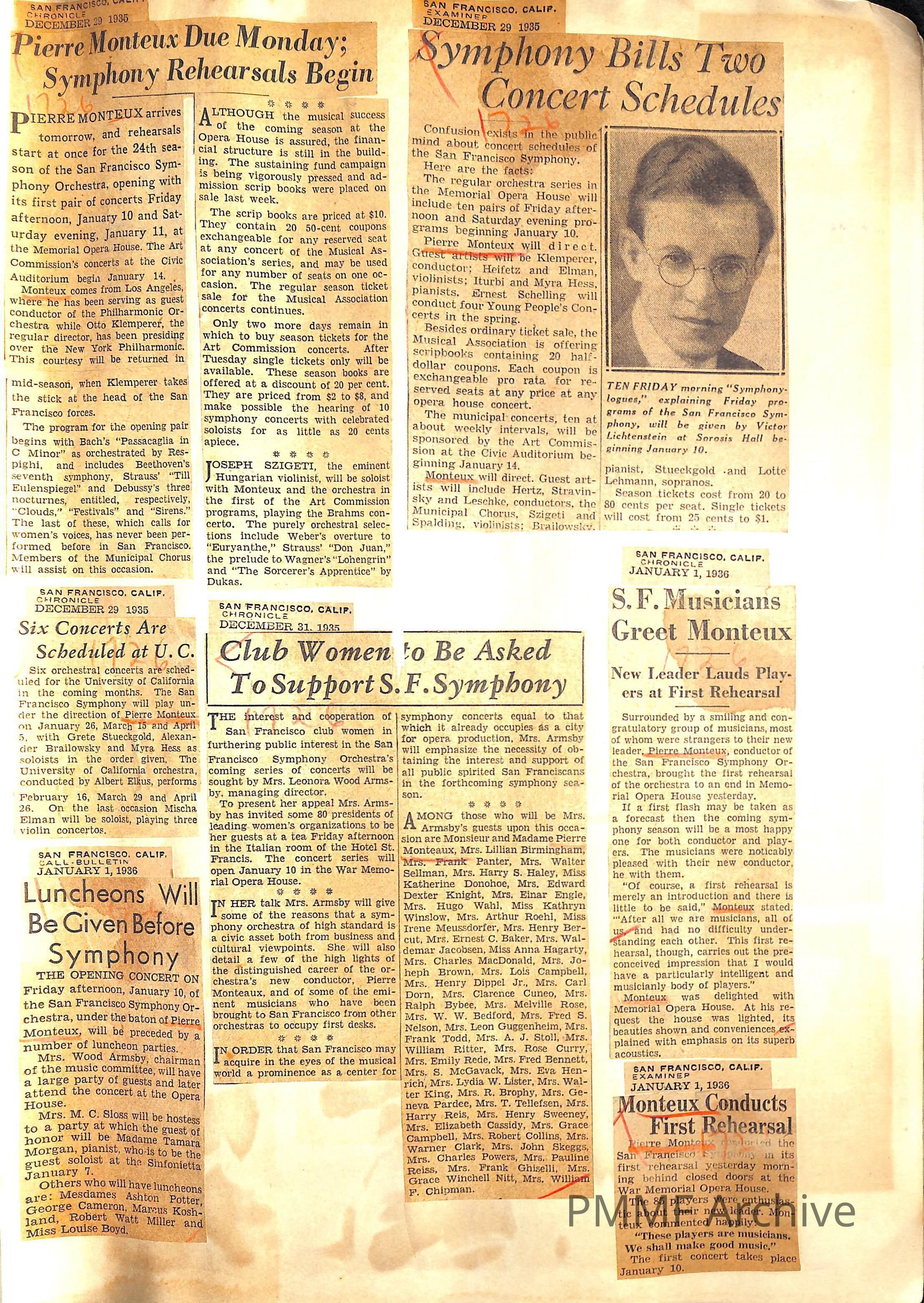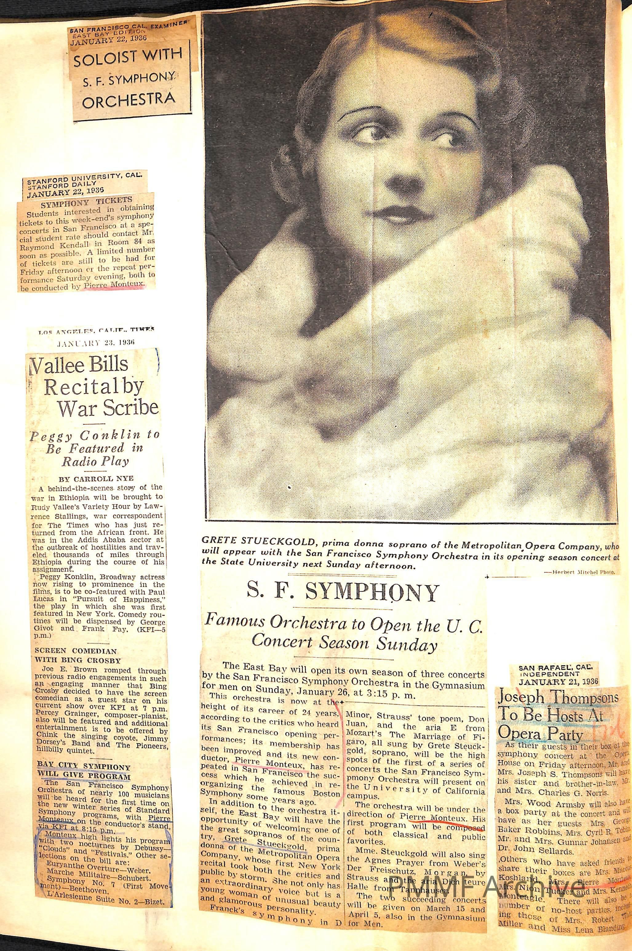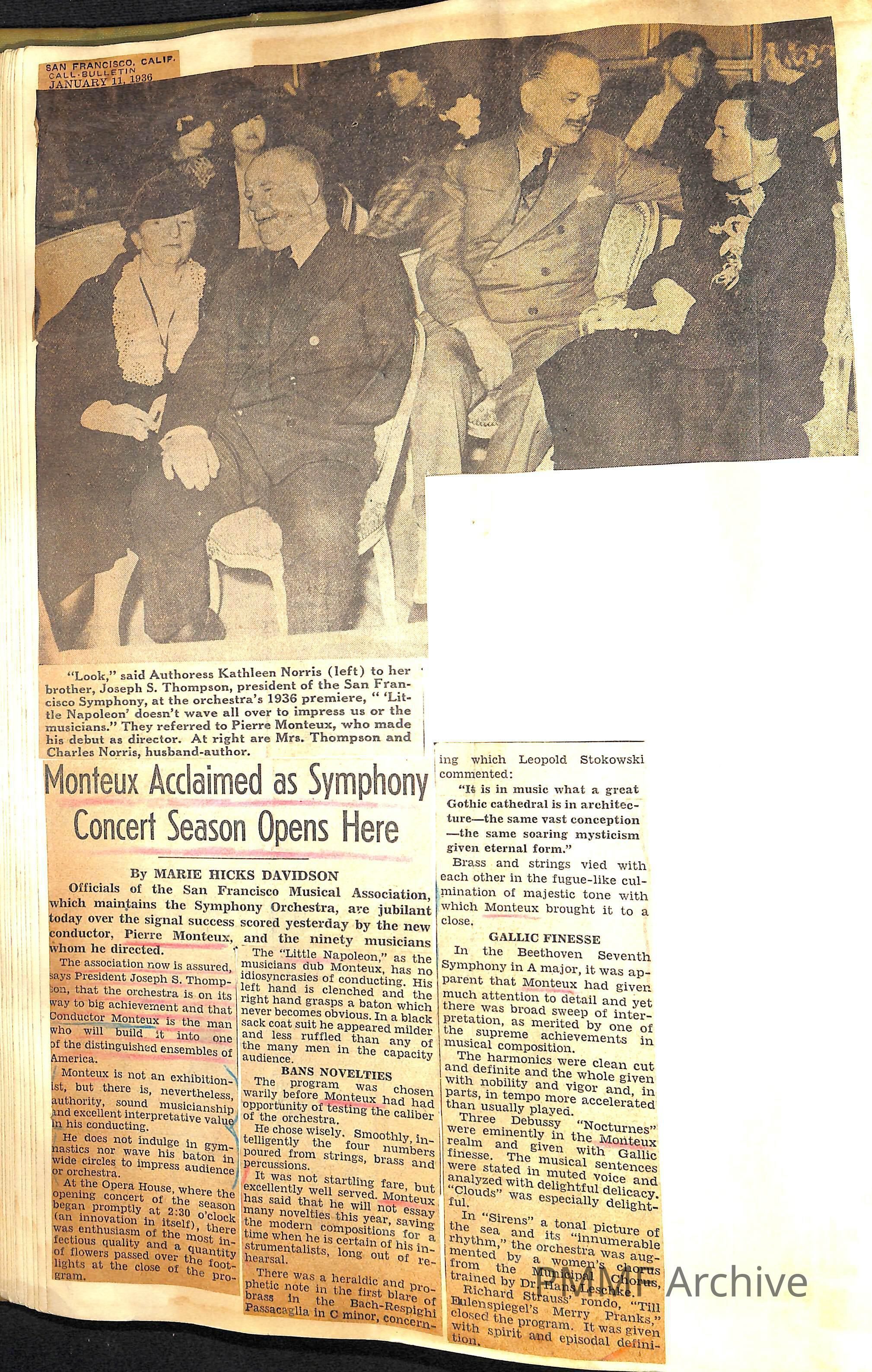 Scrapbook created by Doris Monteux of newspaper articles from 1935-1936 related to the first year of Monteux conducting the San Francisco Symphony Orchestra.