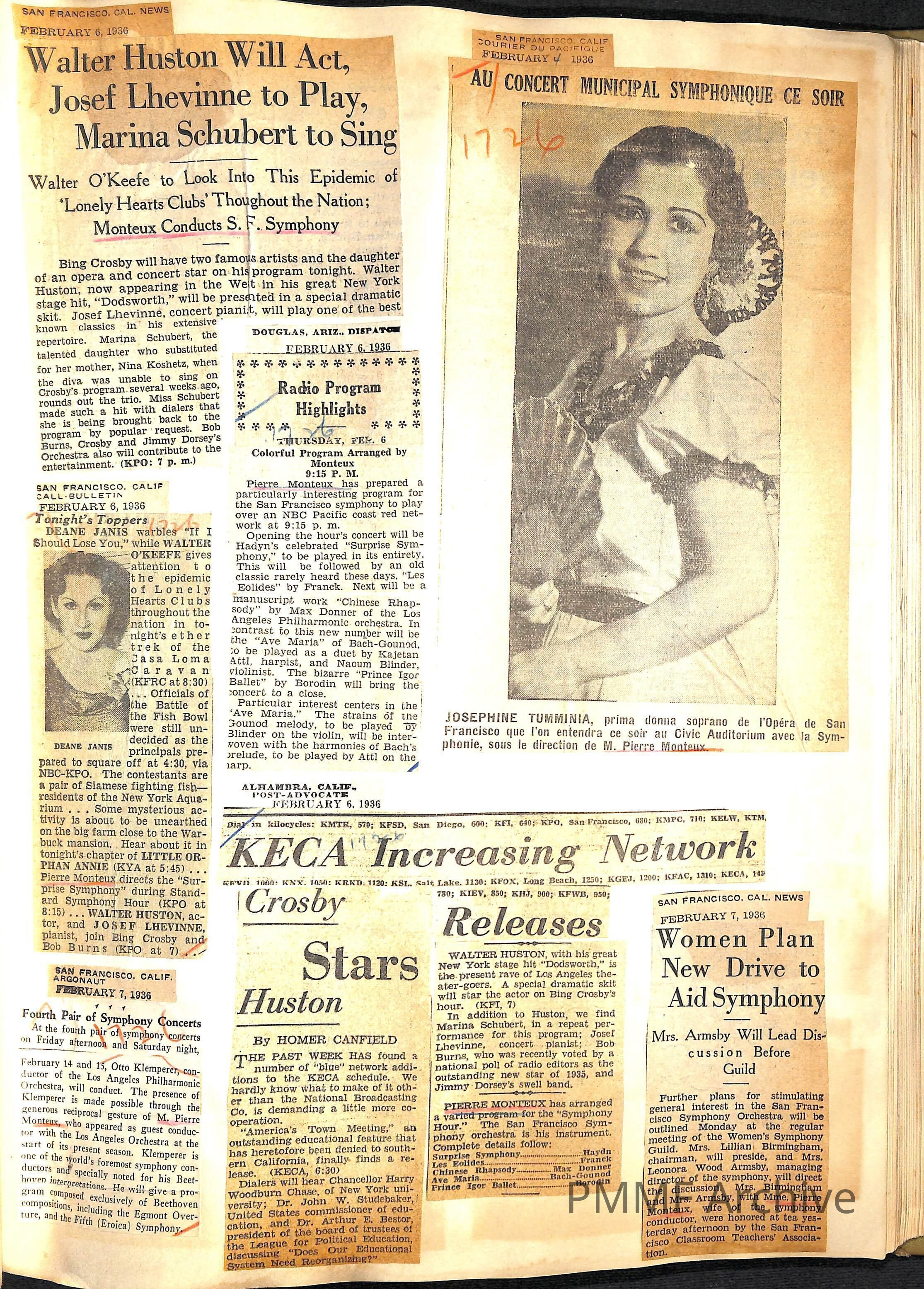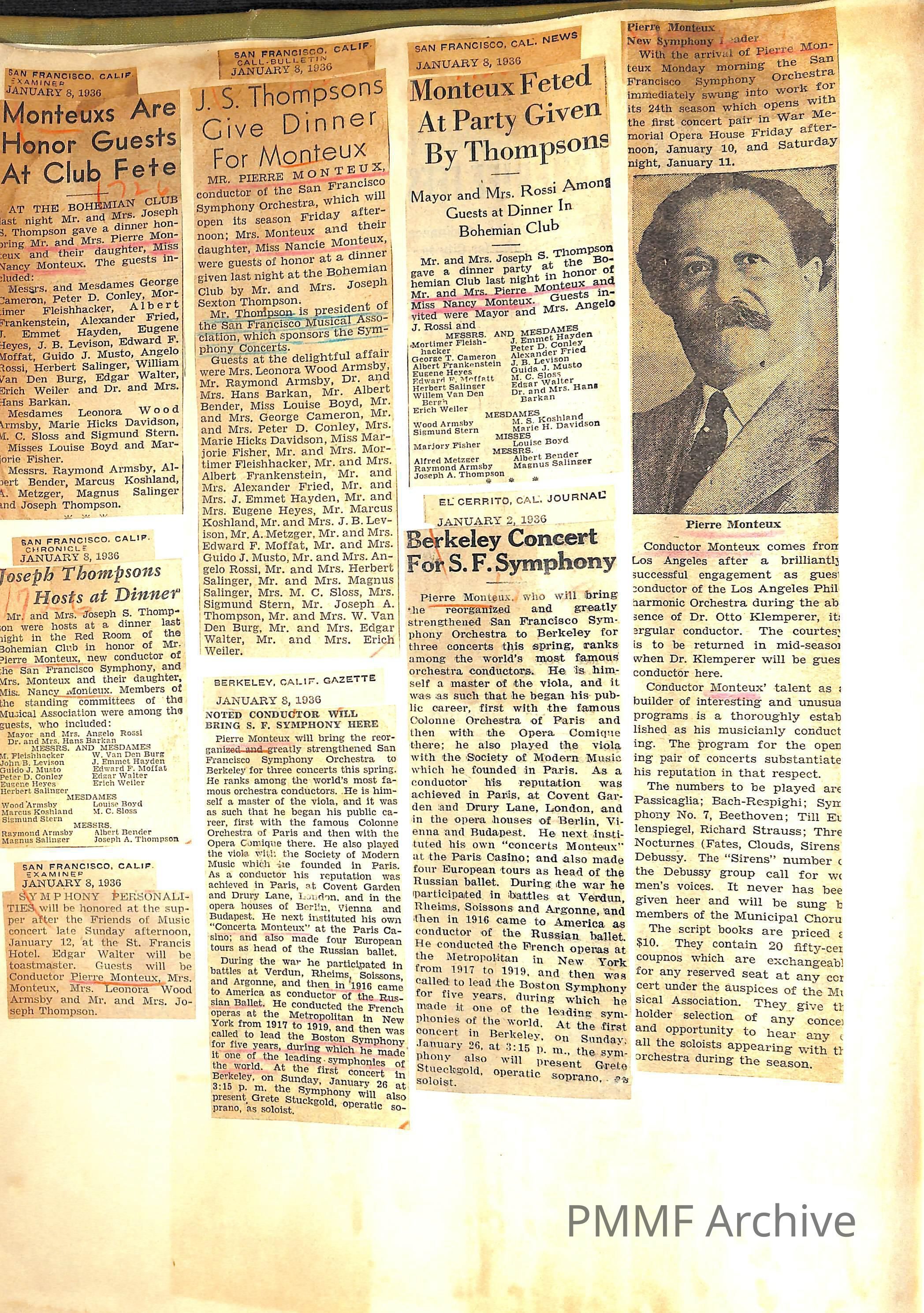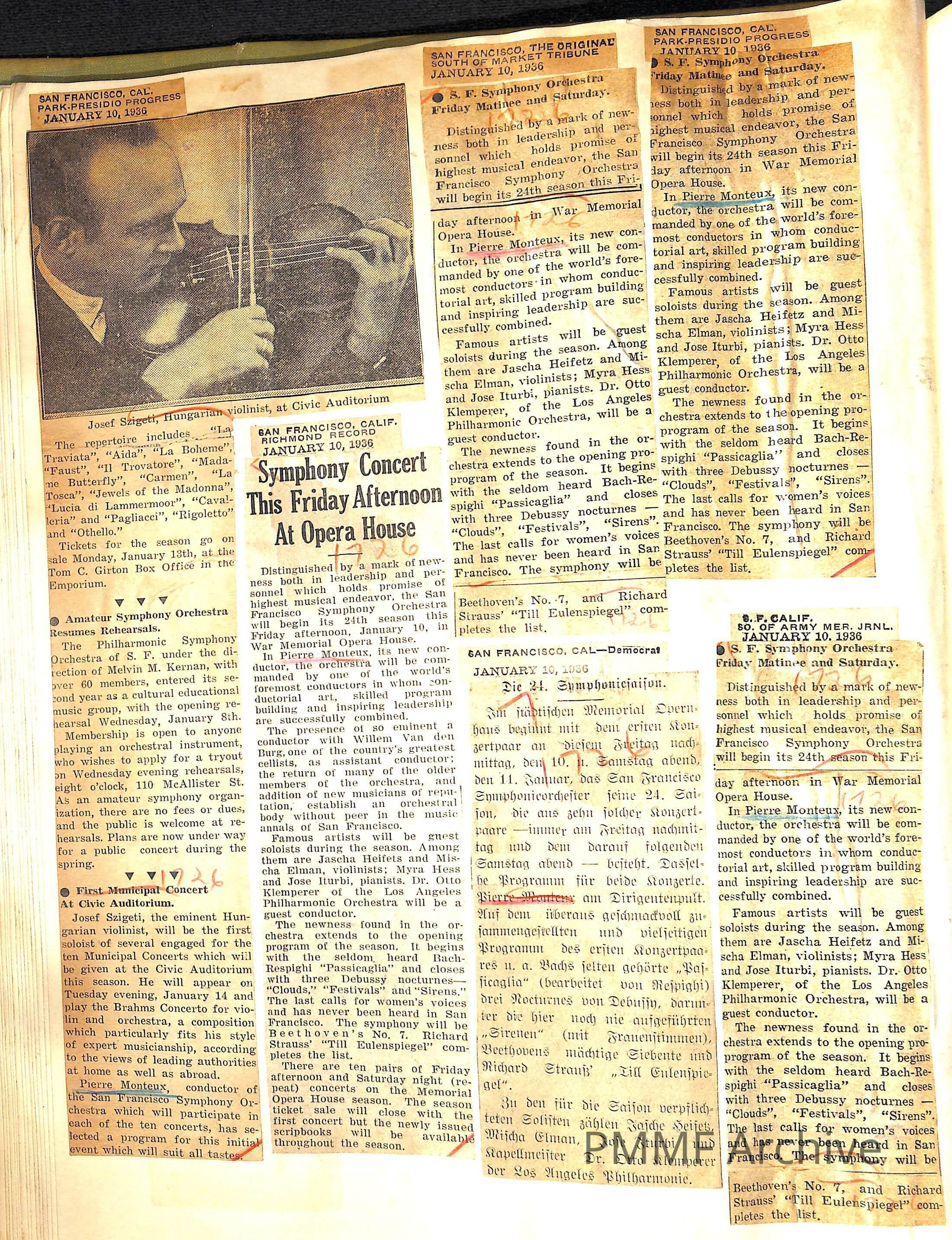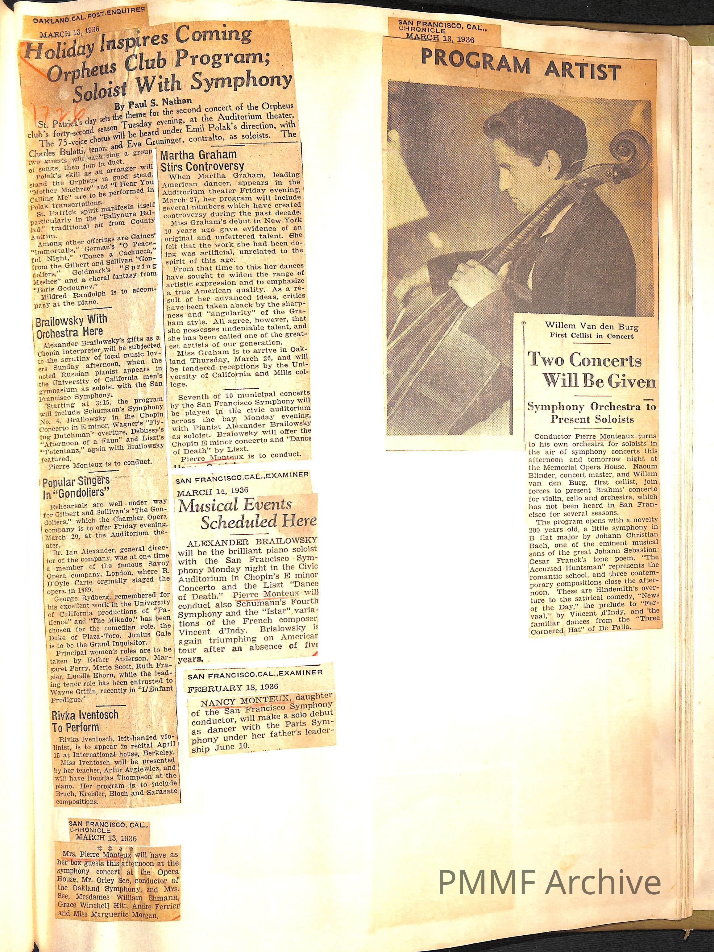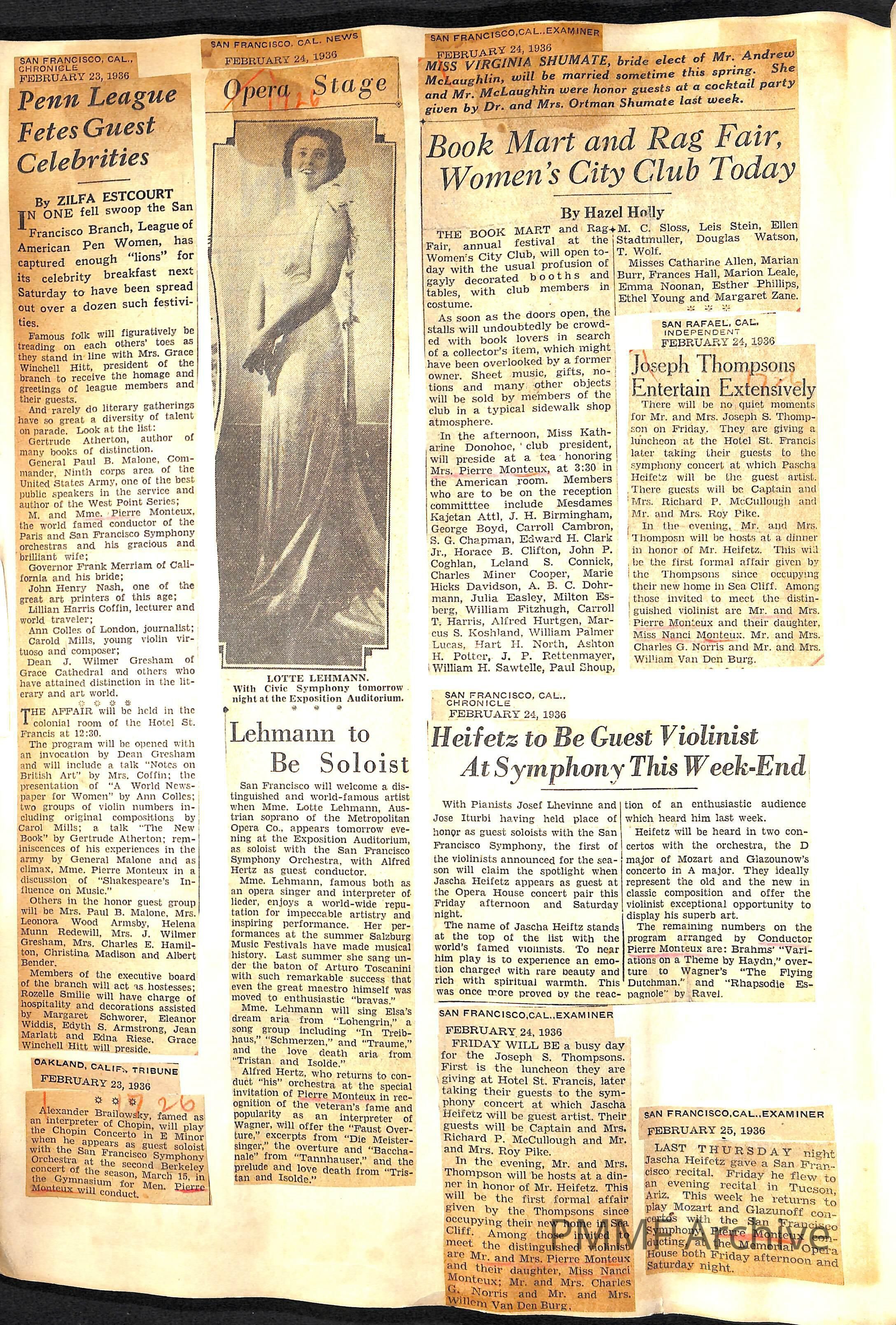 Scrapbook created by Doris Monteux of newspaper articles from 1935-1936 related to the first year of Monteux conducting the San Francisco Symphony Orchestra.