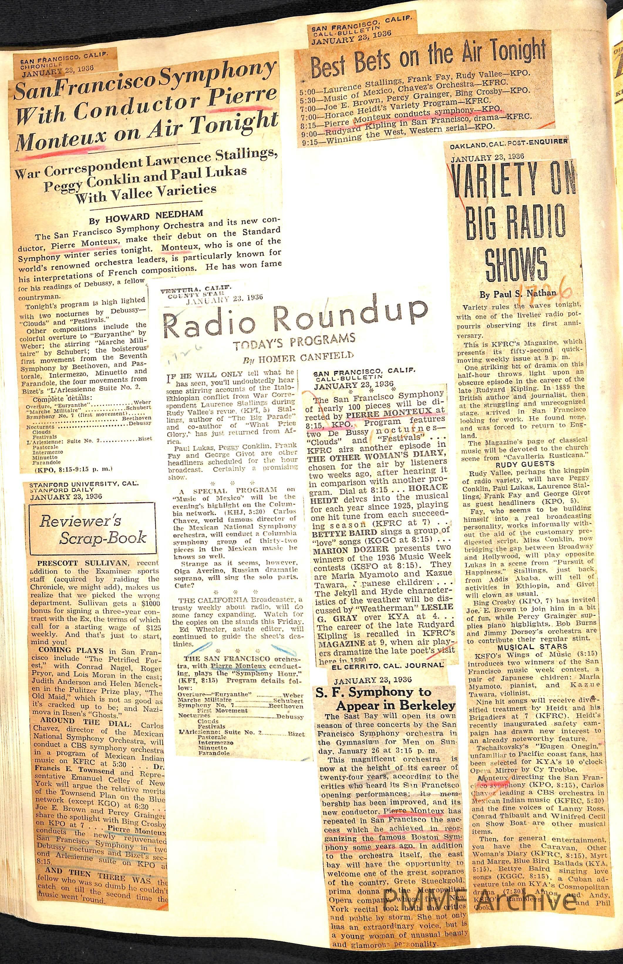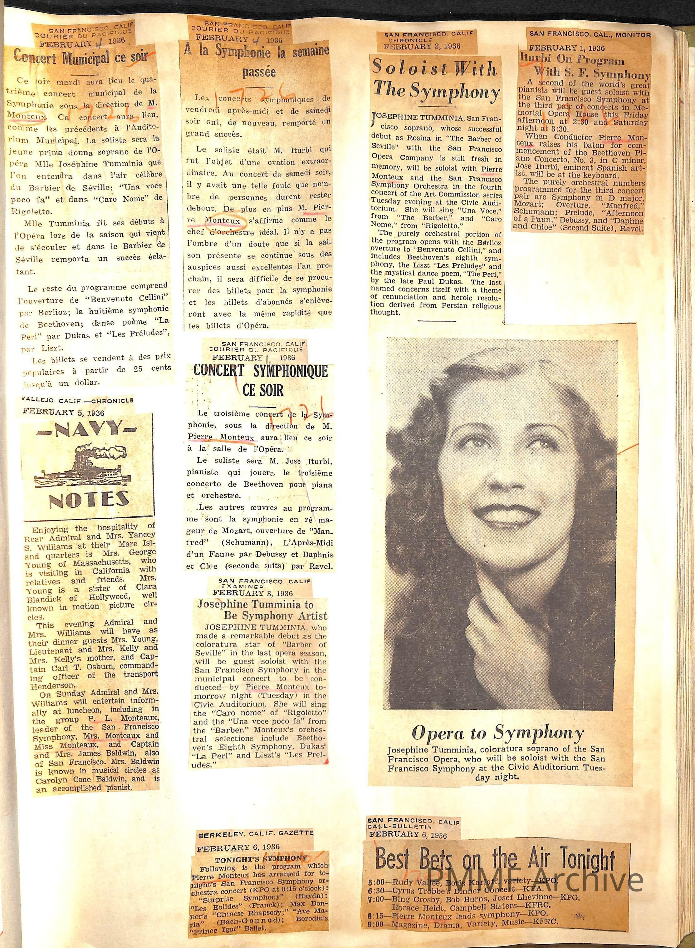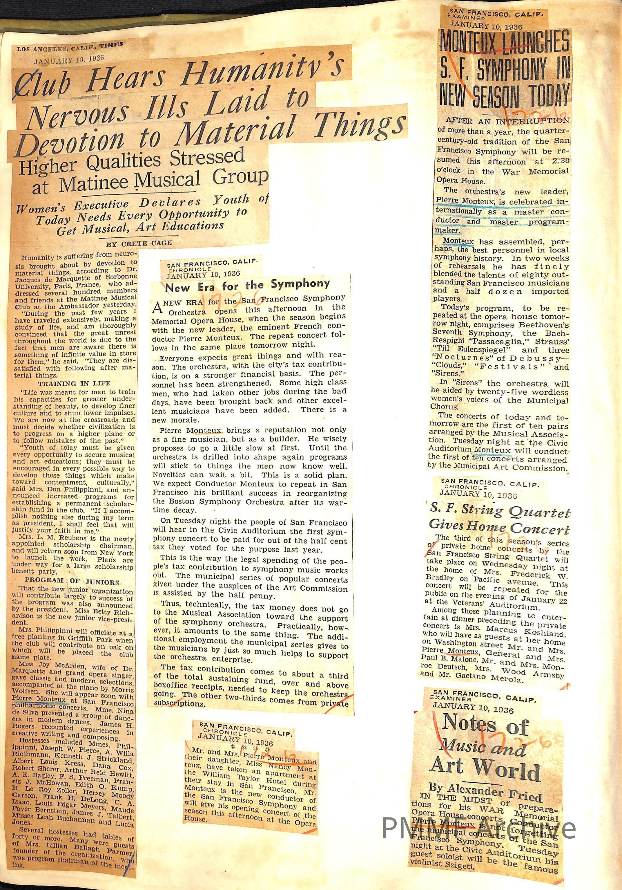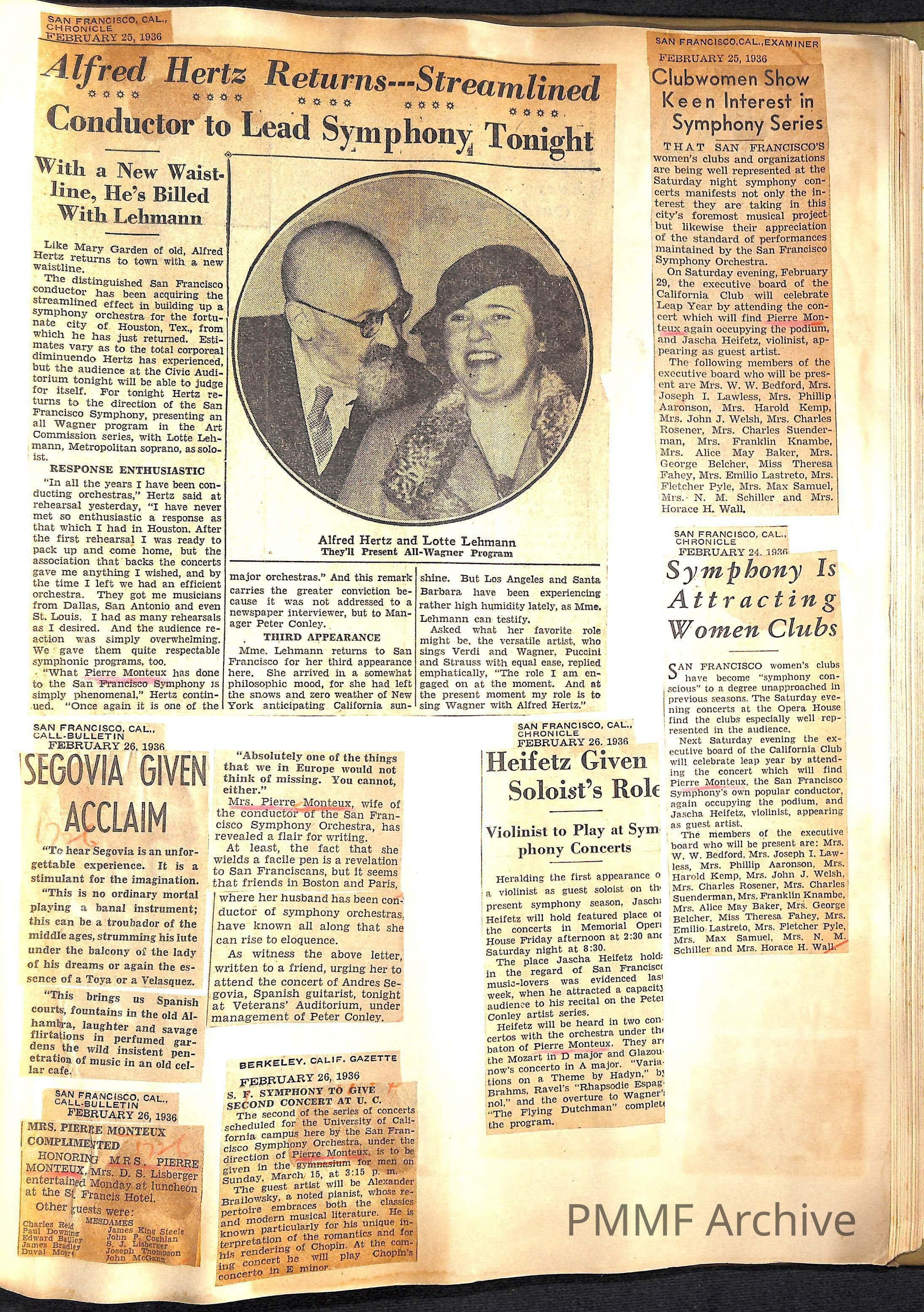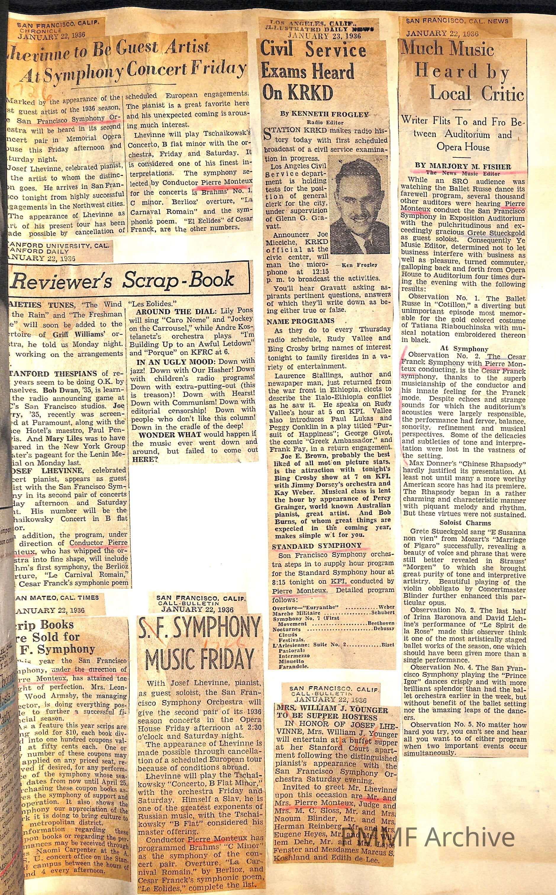 Scrapbook created by Doris Monteux of newspaper articles from 1935-1936 related to the first year of Monteux conducting the San Francisco Symphony Orchestra.