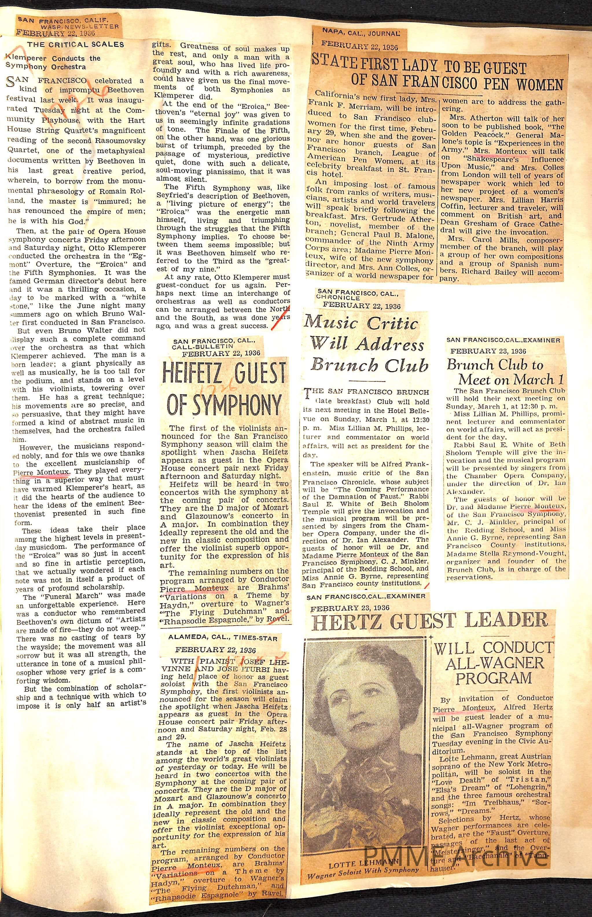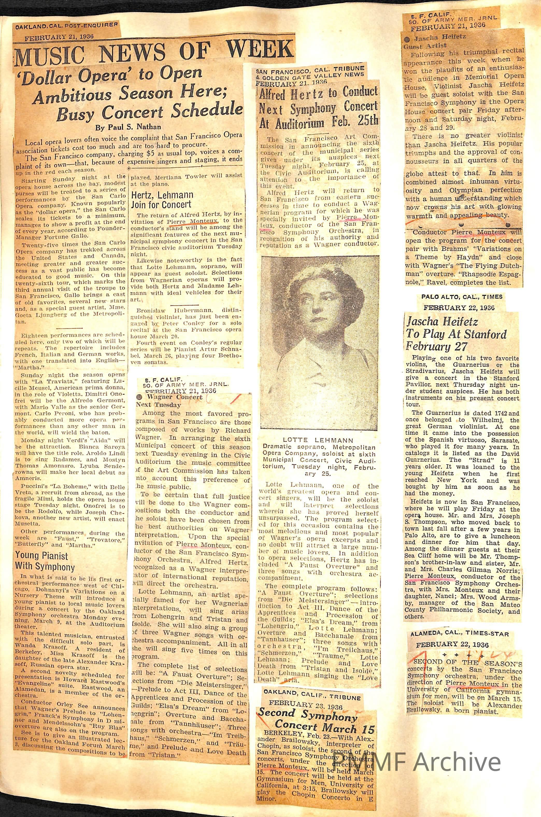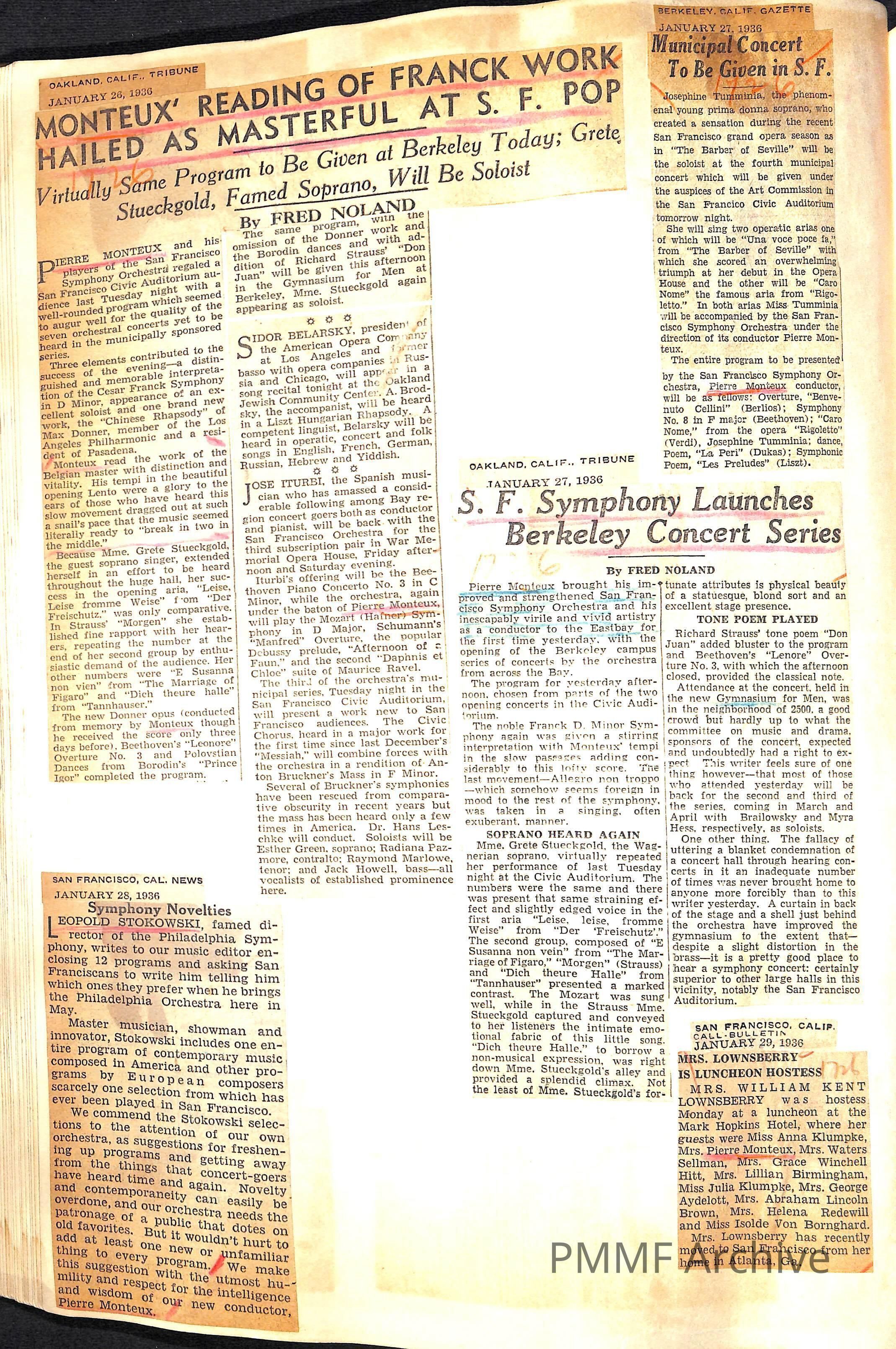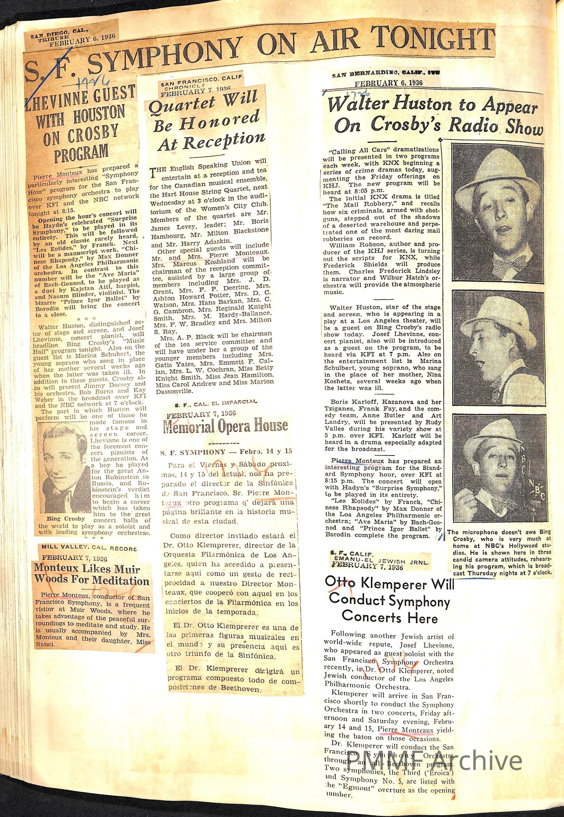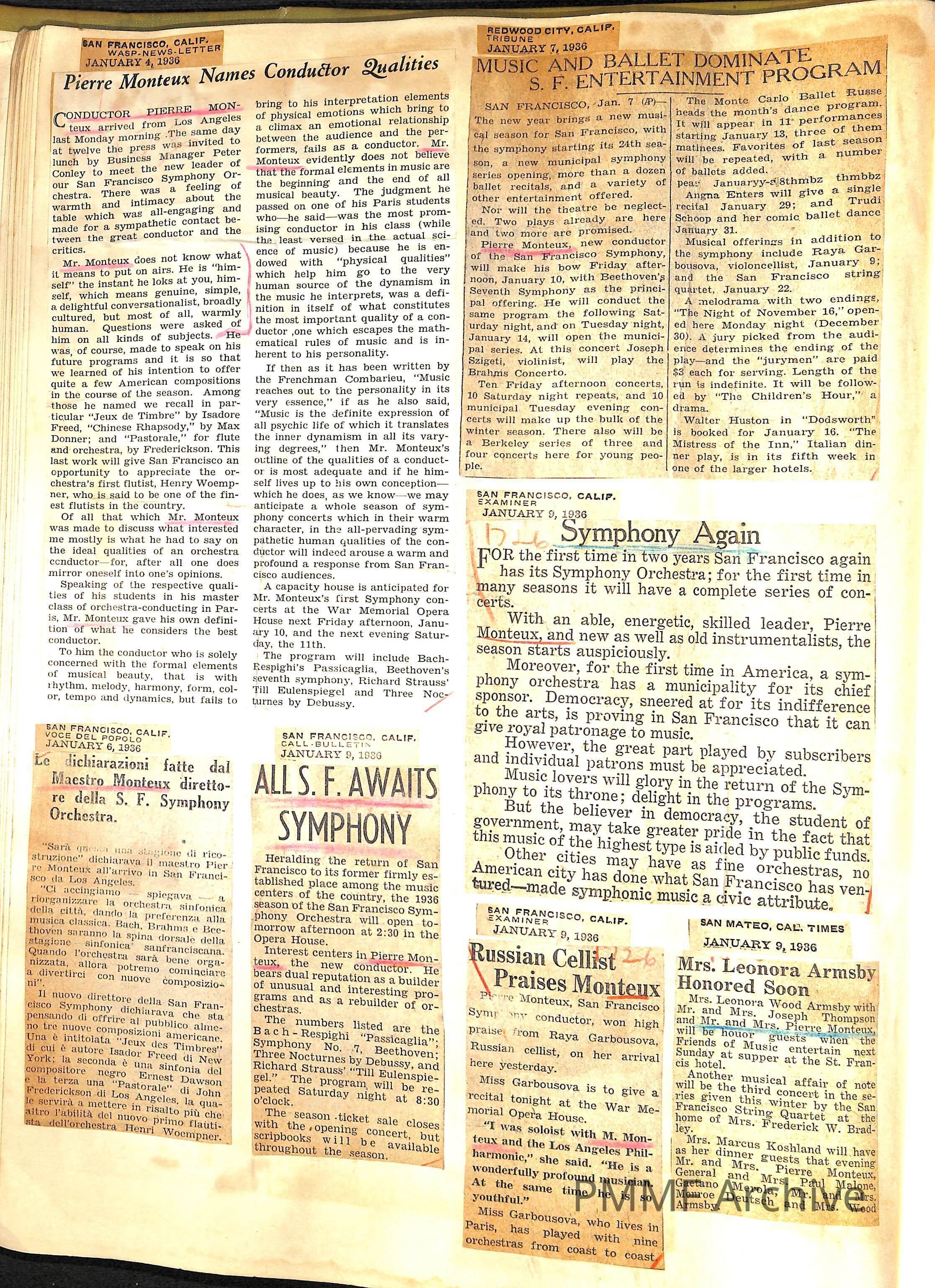 Scrapbook created by Doris Monteux of newspaper articles from 1935-1936 related to the first year of Monteux conducting the San Francisco Symphony Orchestra.