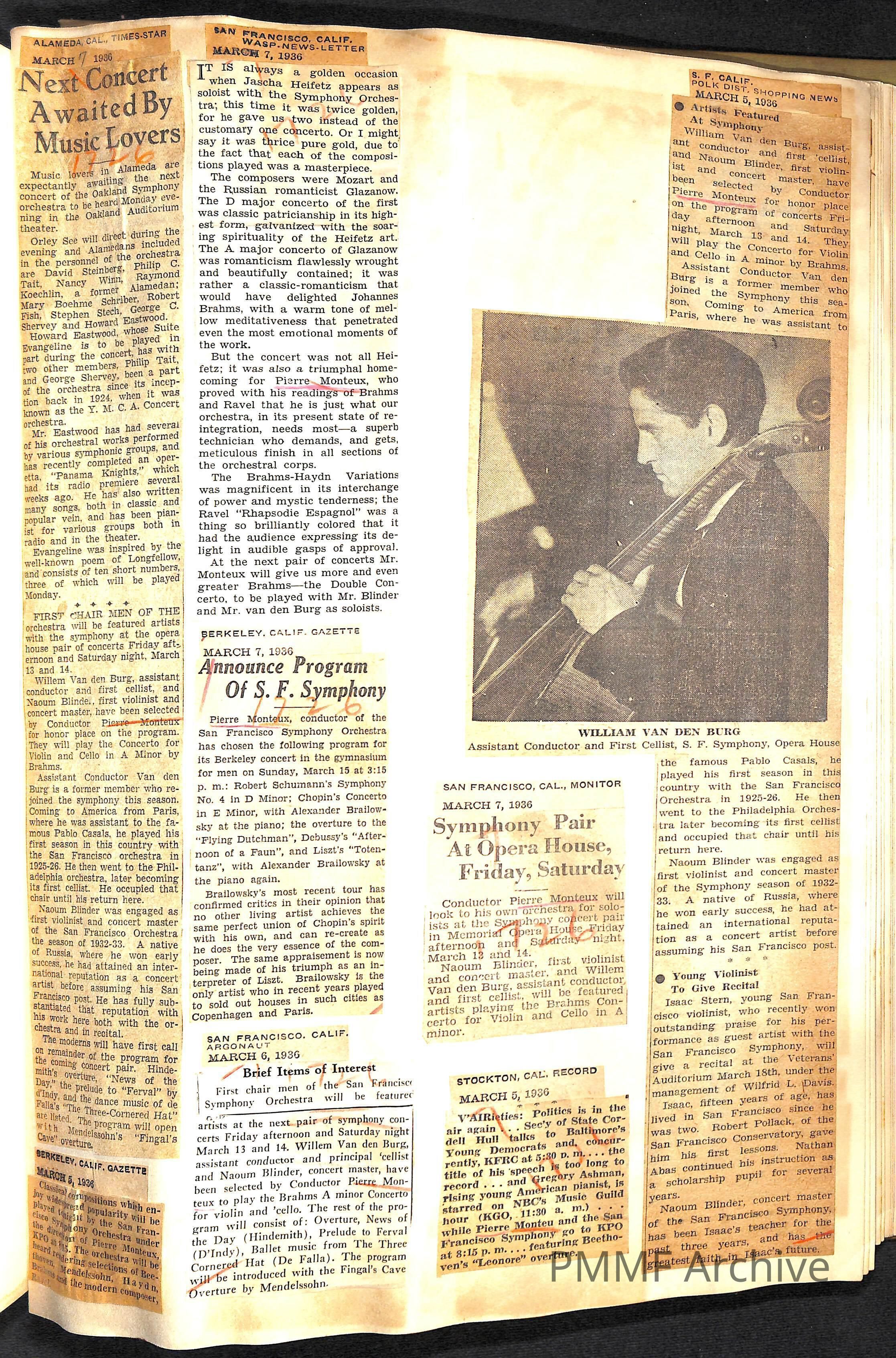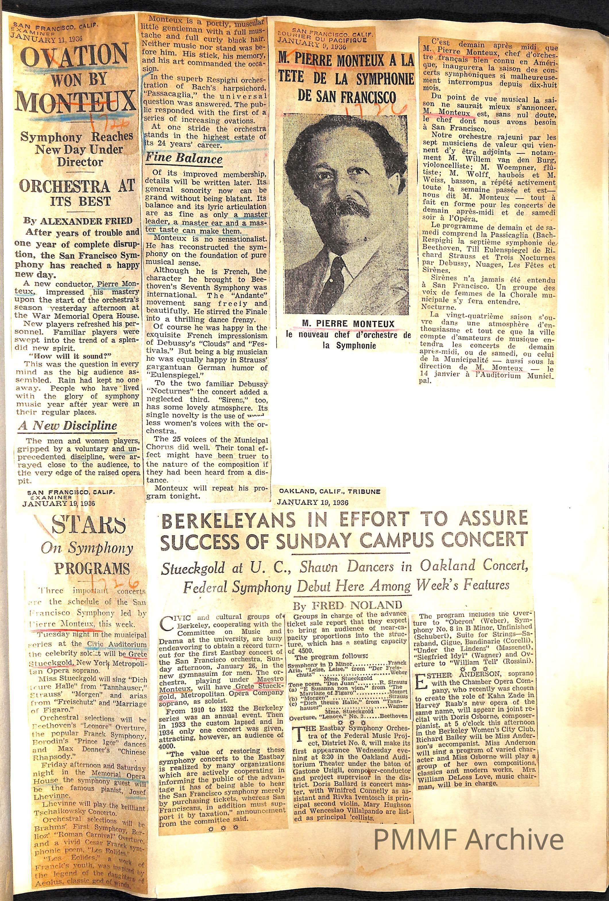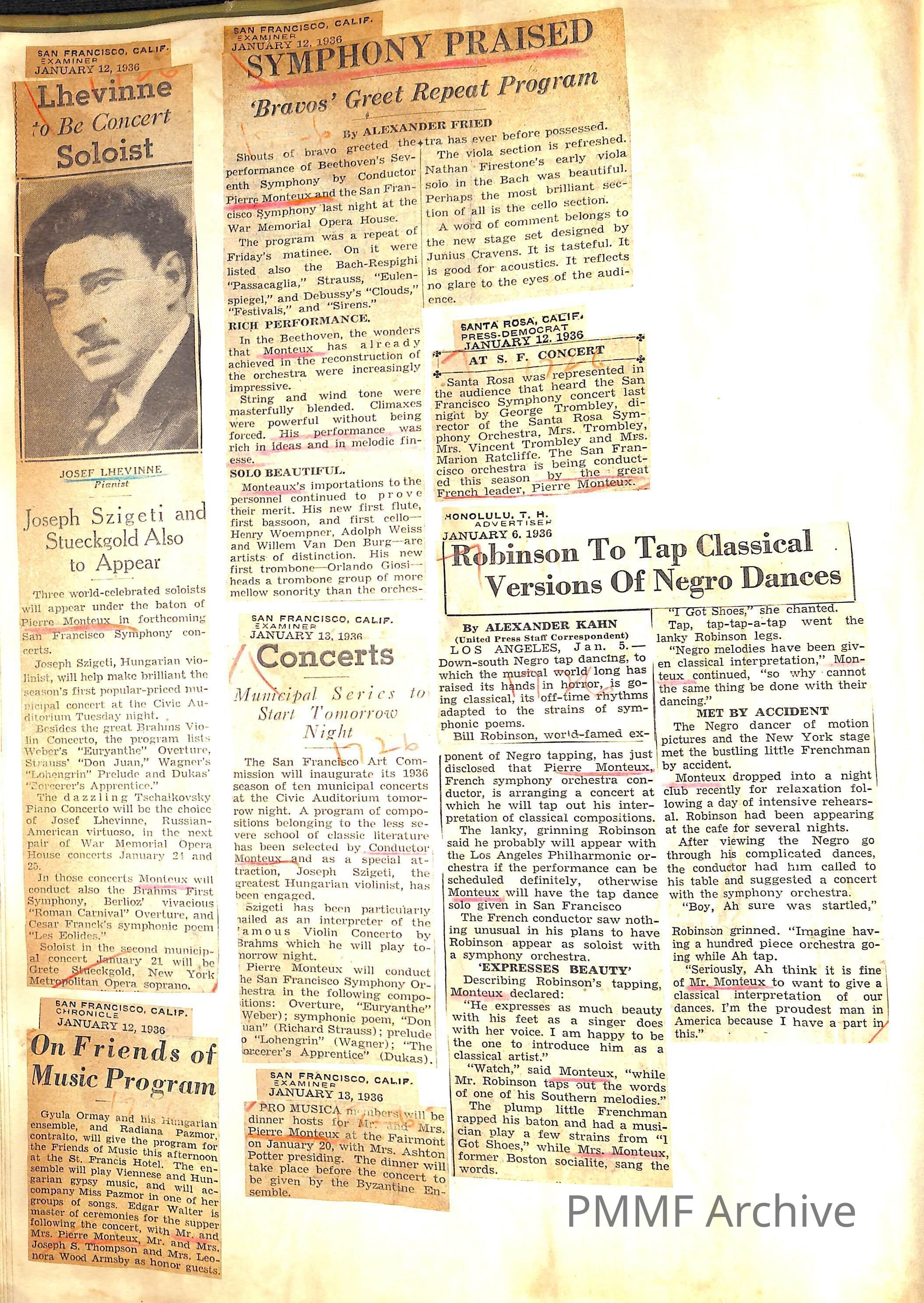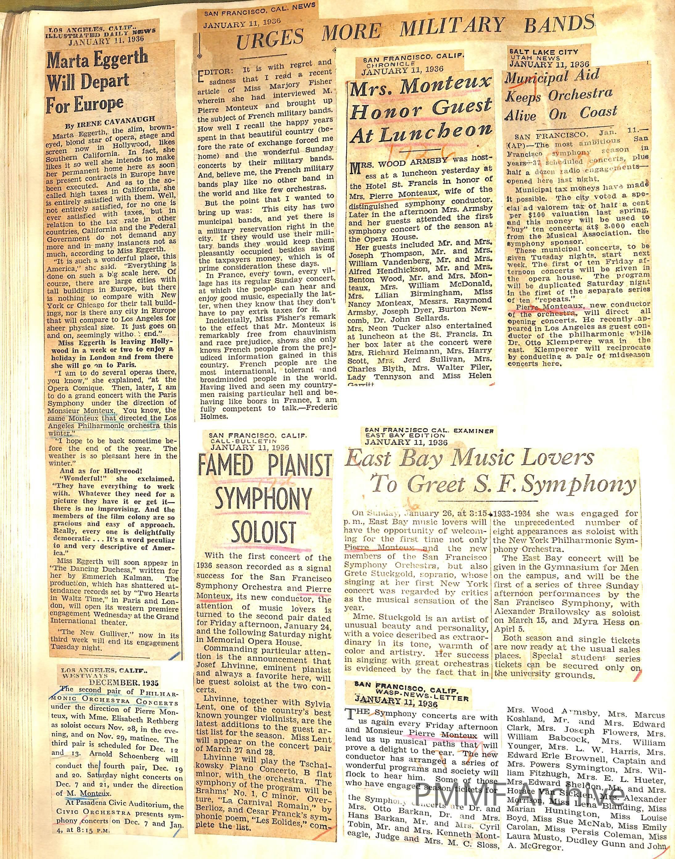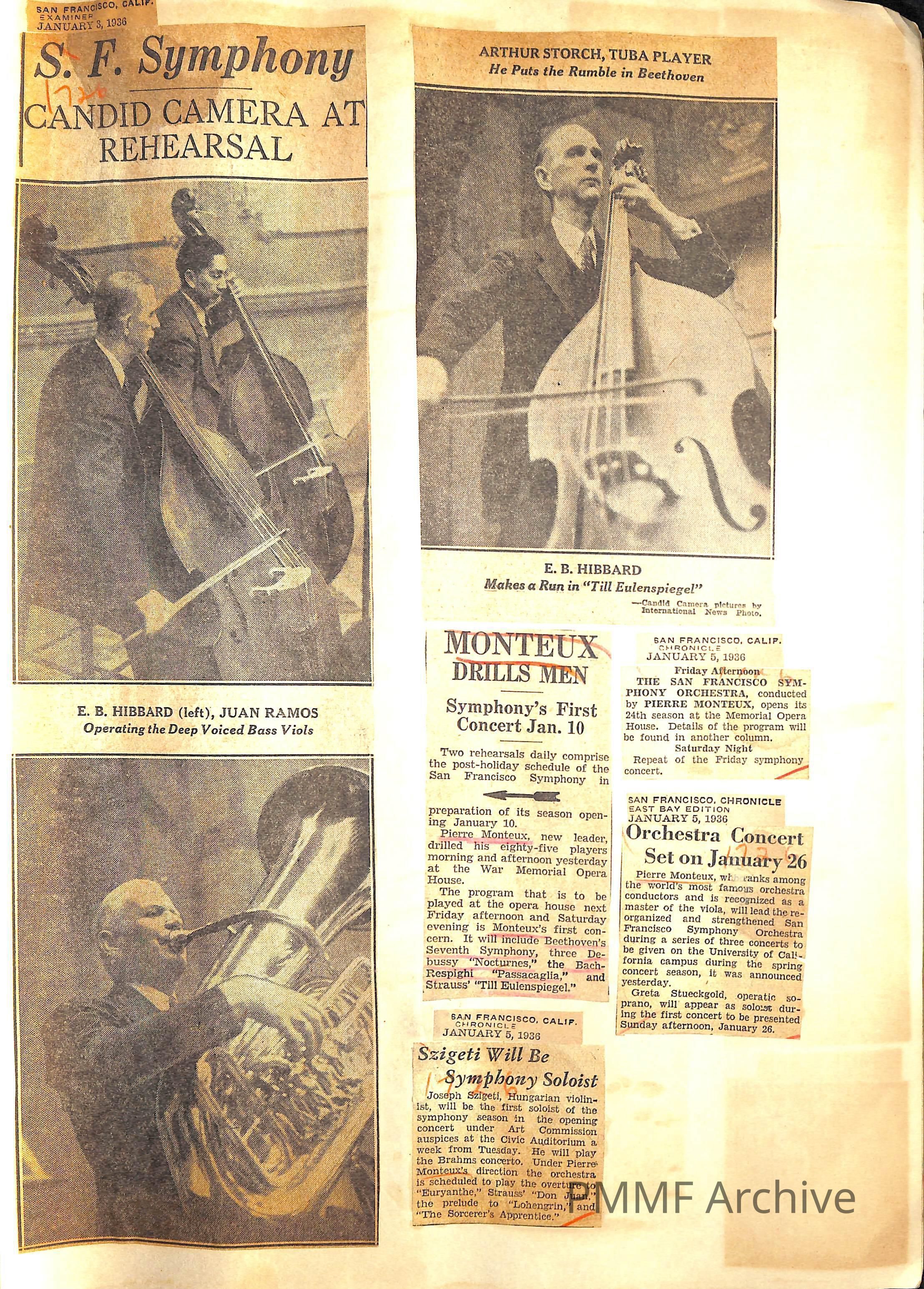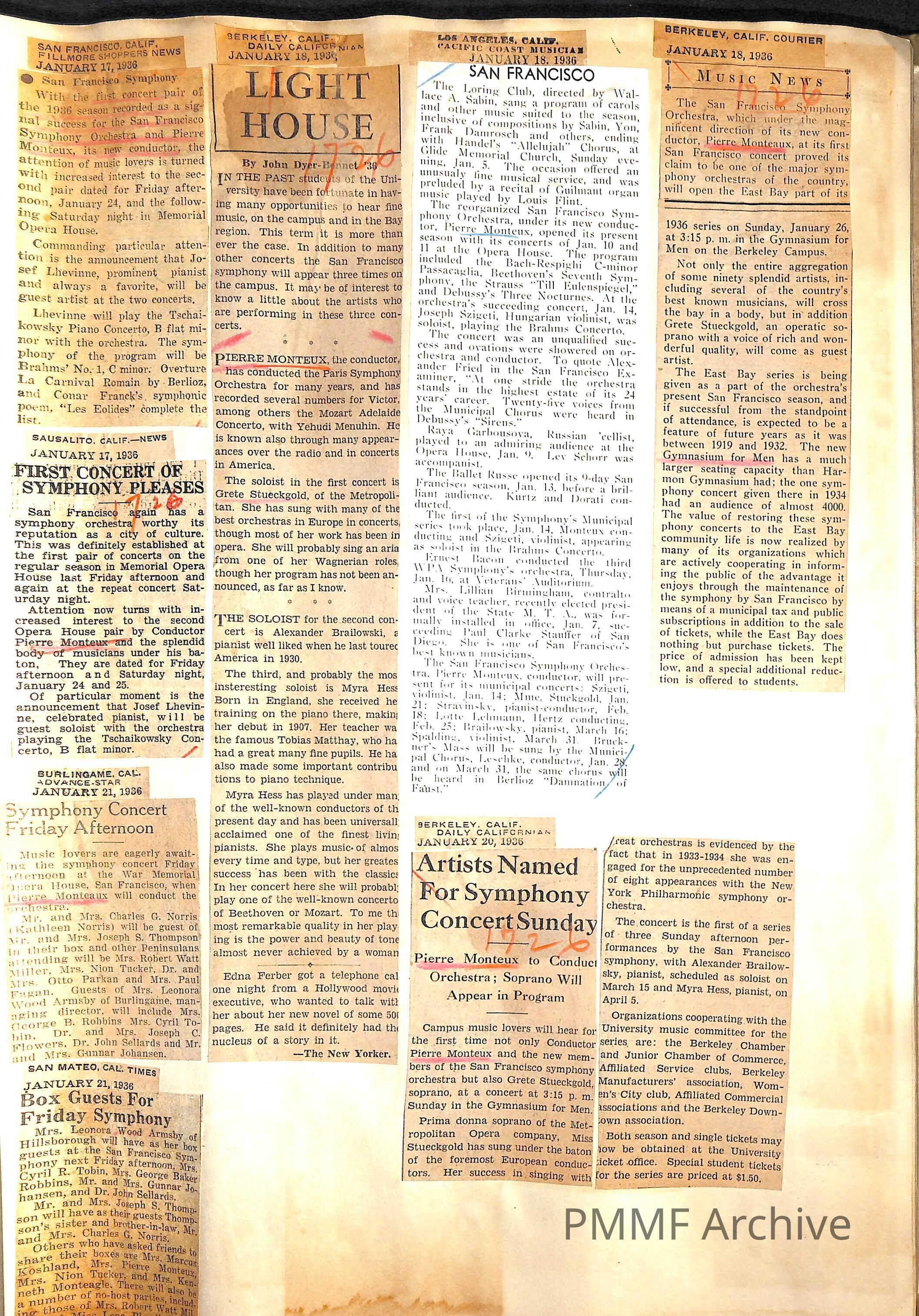 Scrapbook created by Doris Monteux of newspaper articles from 1935-1936 related to the first year of Monteux conducting the San Francisco Symphony Orchestra.