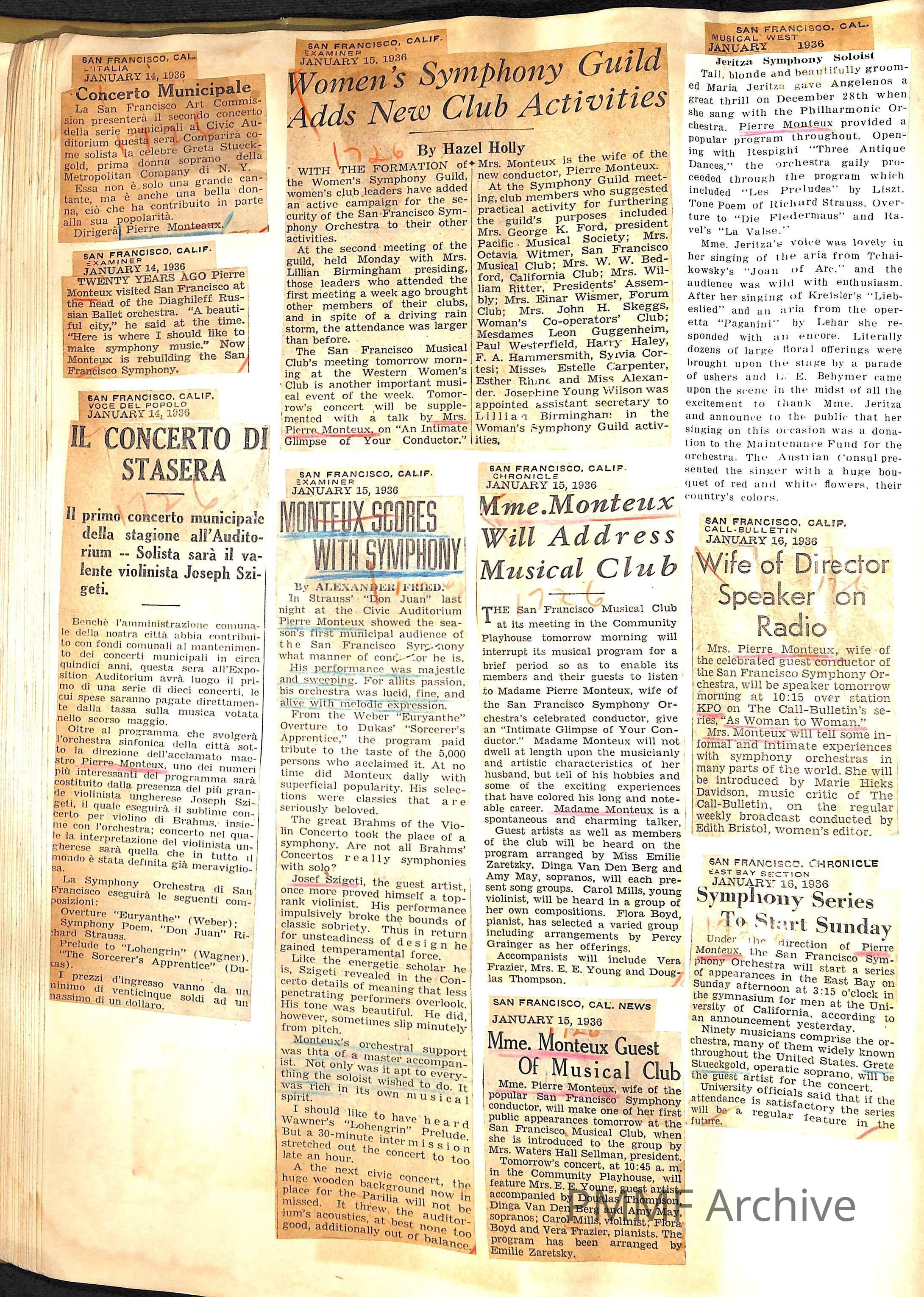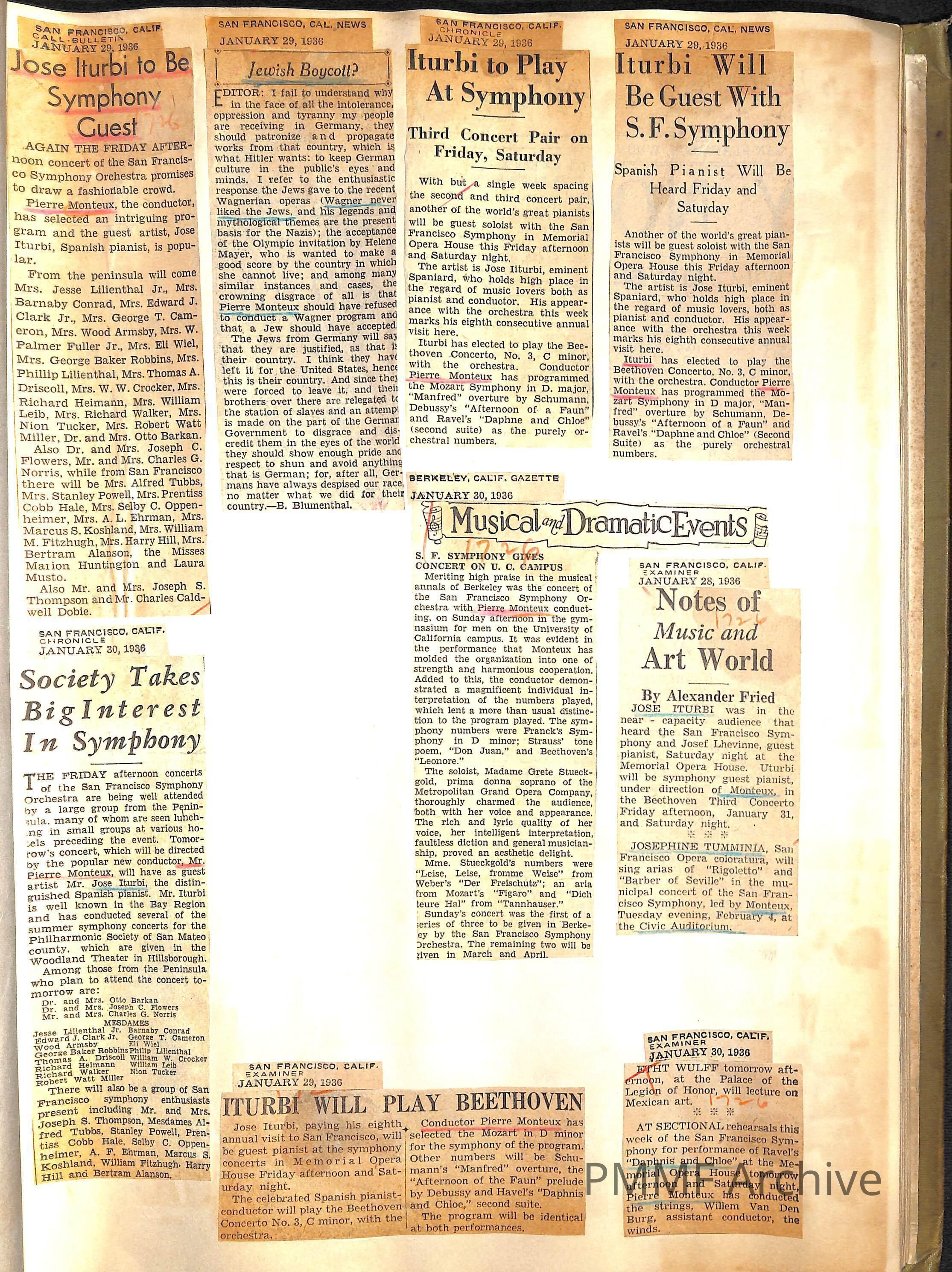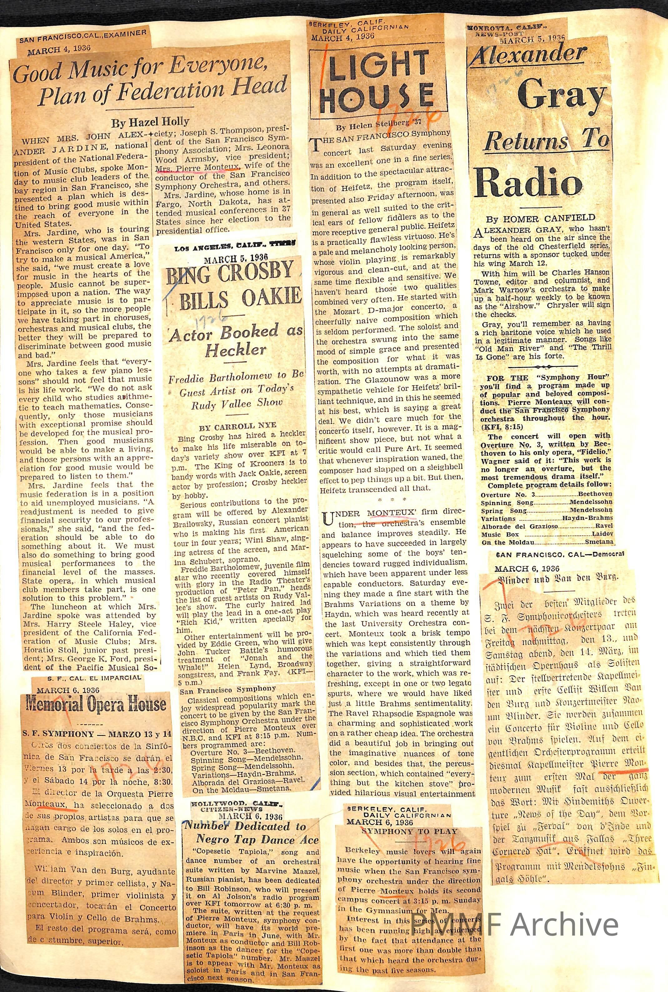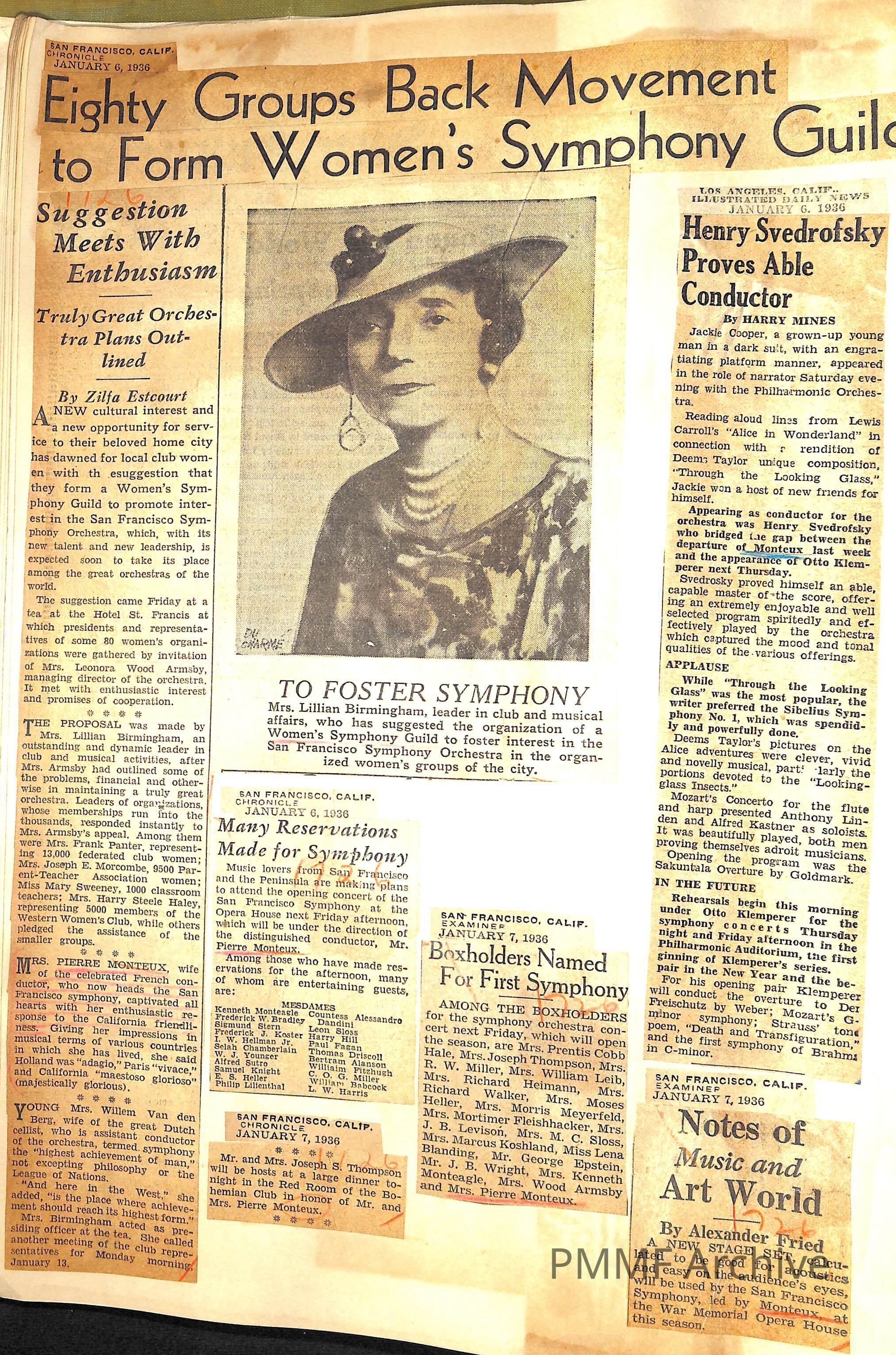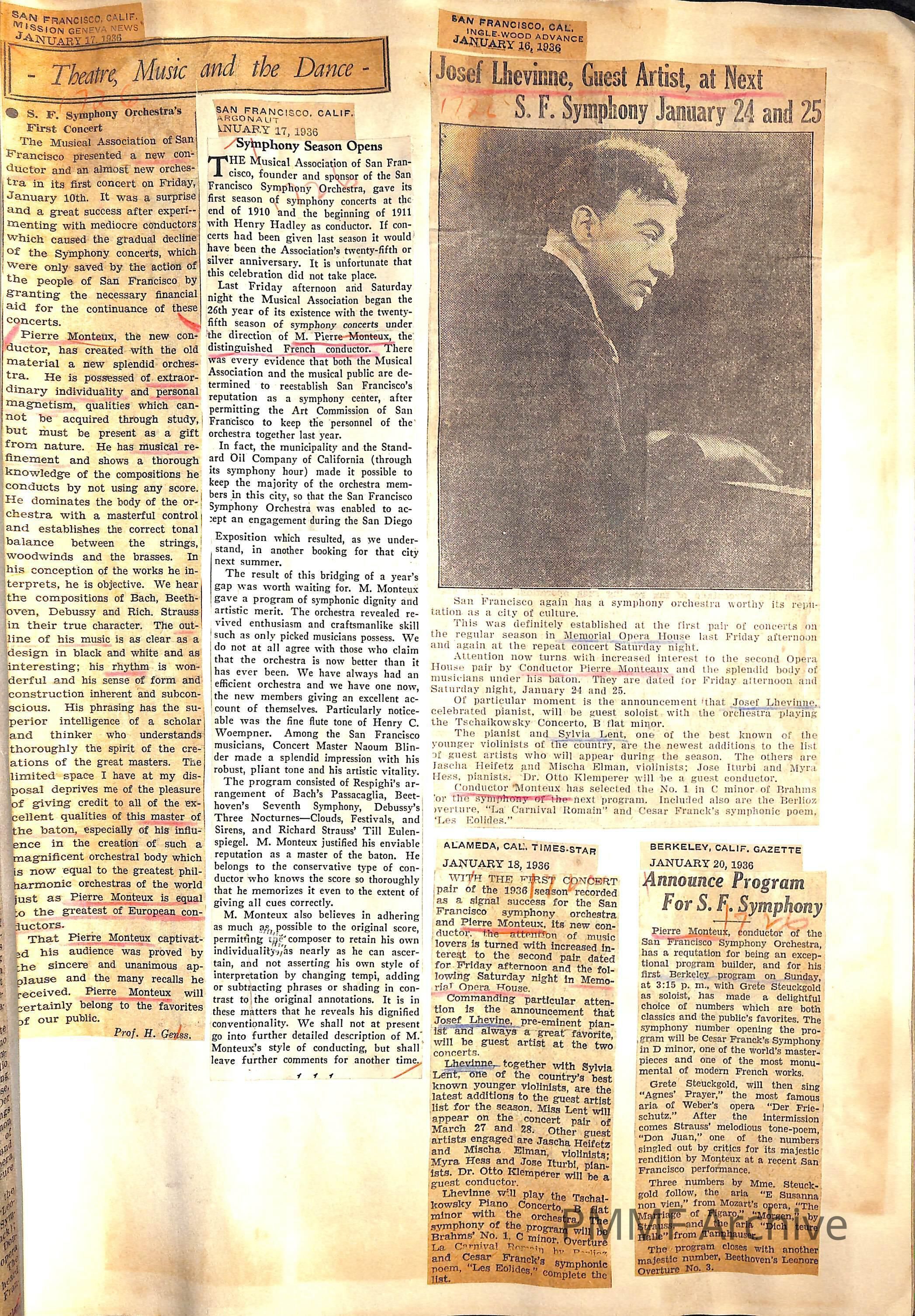 Scrapbook created by Doris Monteux of newspaper articles from 1935-1936 related to the first year of Monteux conducting the San Francisco Symphony Orchestra.
